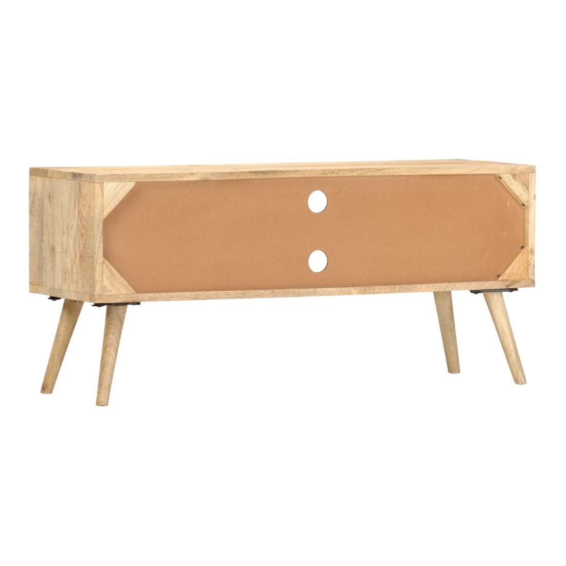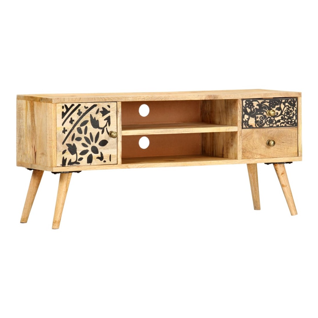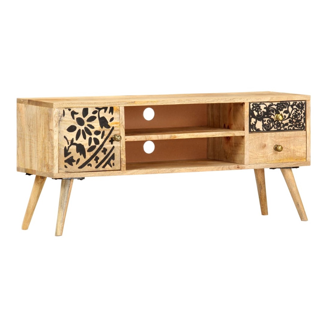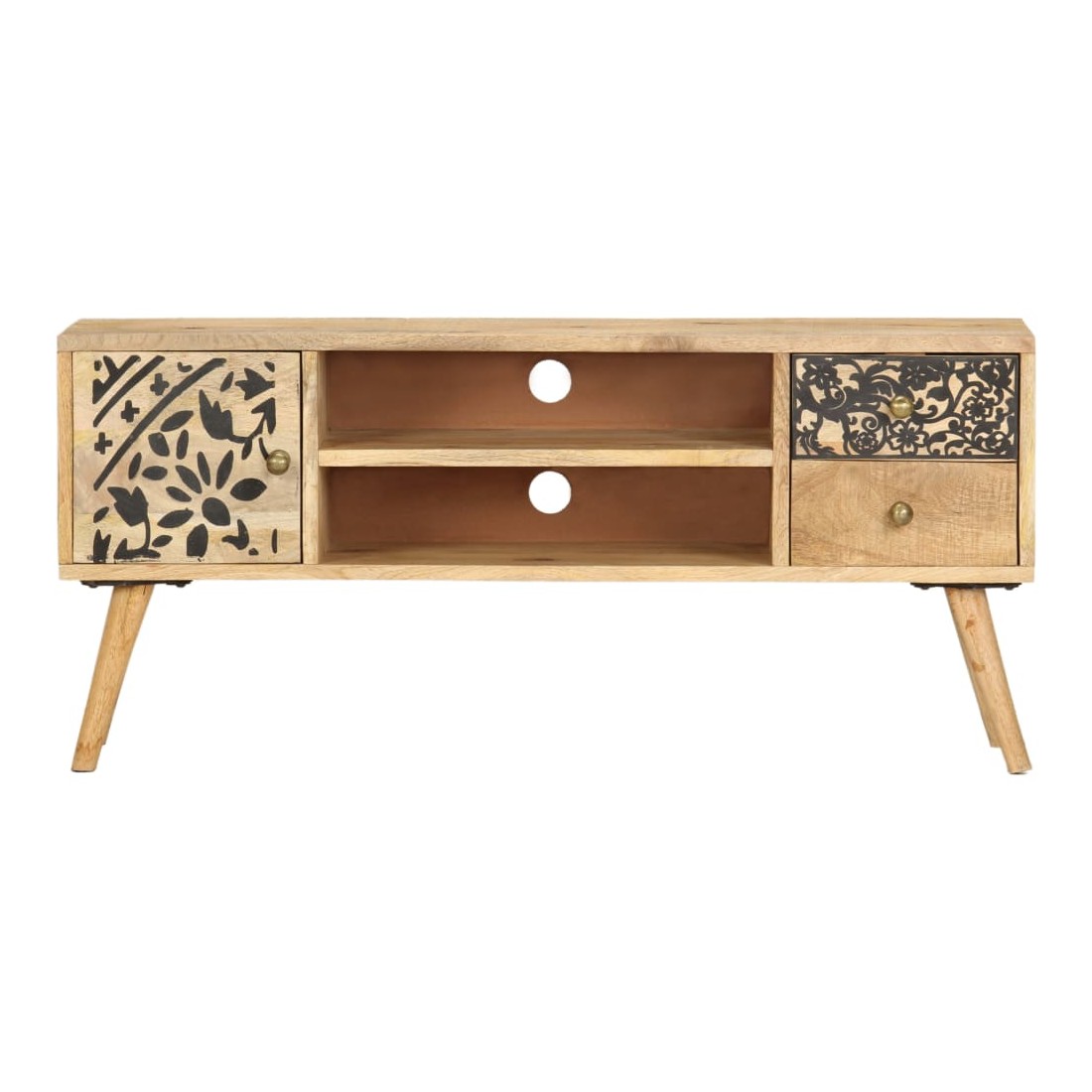 Ce meuble TV de style industriel deviendra le point de mire de votre salon ou de votre espace de divertissement. Il peut également être utilisé comme buffet, bahut, etc. Le meuble TV est en bois de manguier massif, stable, durable et beau, et la qualité de fabrication rehausse son spectaculaire style rétro. Chaque étape du processus est réalisée avec le plus grand soin, que ce soit le polissage, la peinture ou le laquage. Le savoir-faire artisanal et les belles veines de bois rendent chaque meuble unique et légèrement différent l'un de l'autre. Les 2 compartiments ouverts, 2 tiroirs et une porte offrent suffisamment d'espace pour ranger les lecteurs DVD, les consoles de jeux, les appareils de retransmission en continu et les supports multimédia de façon ordonnée. Remarque importante :