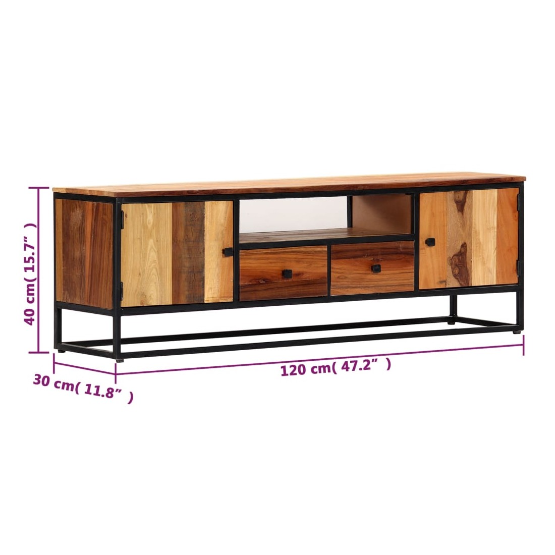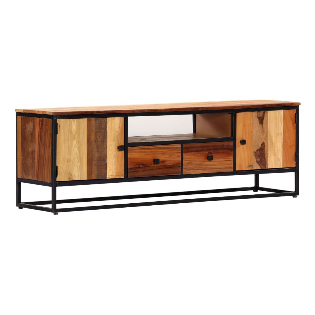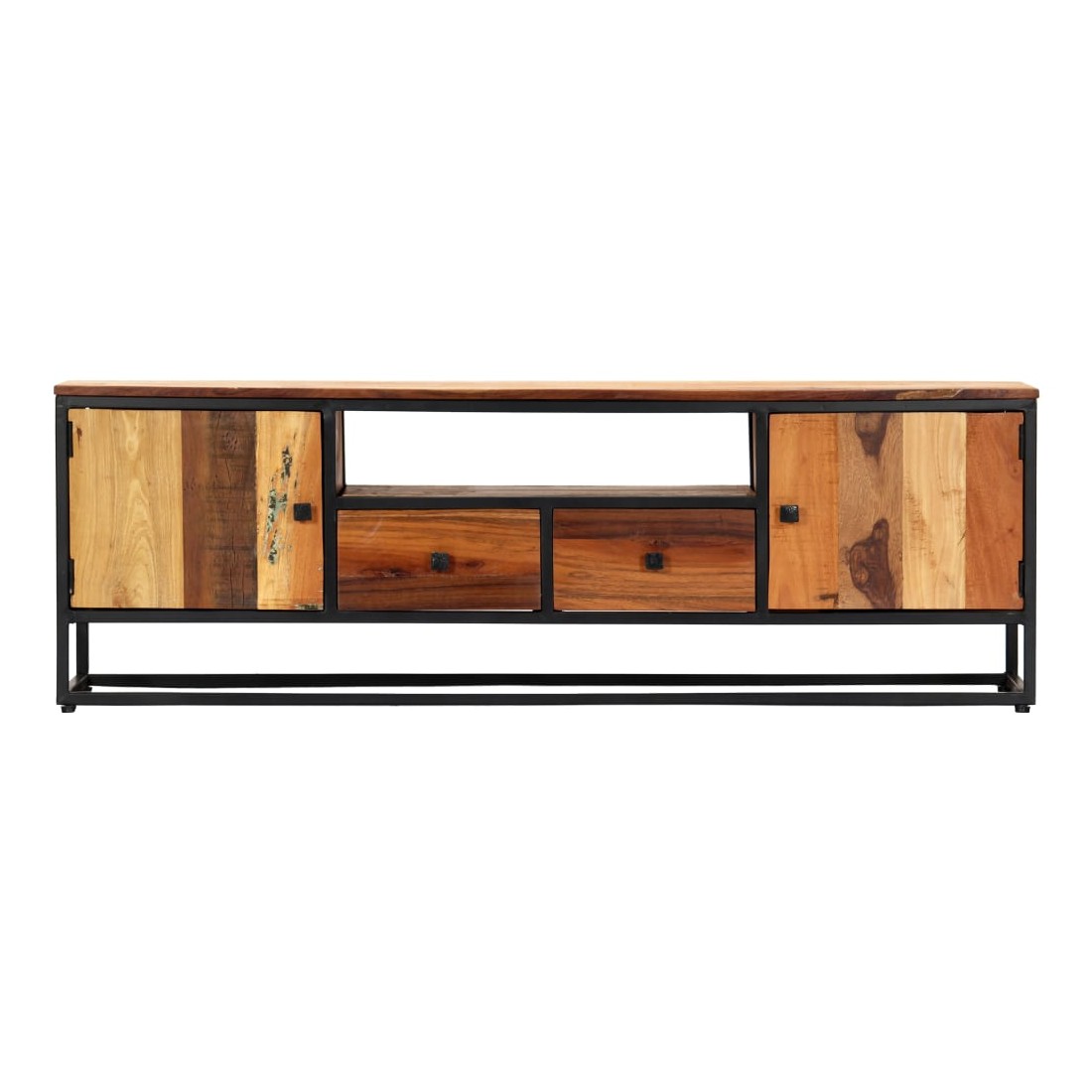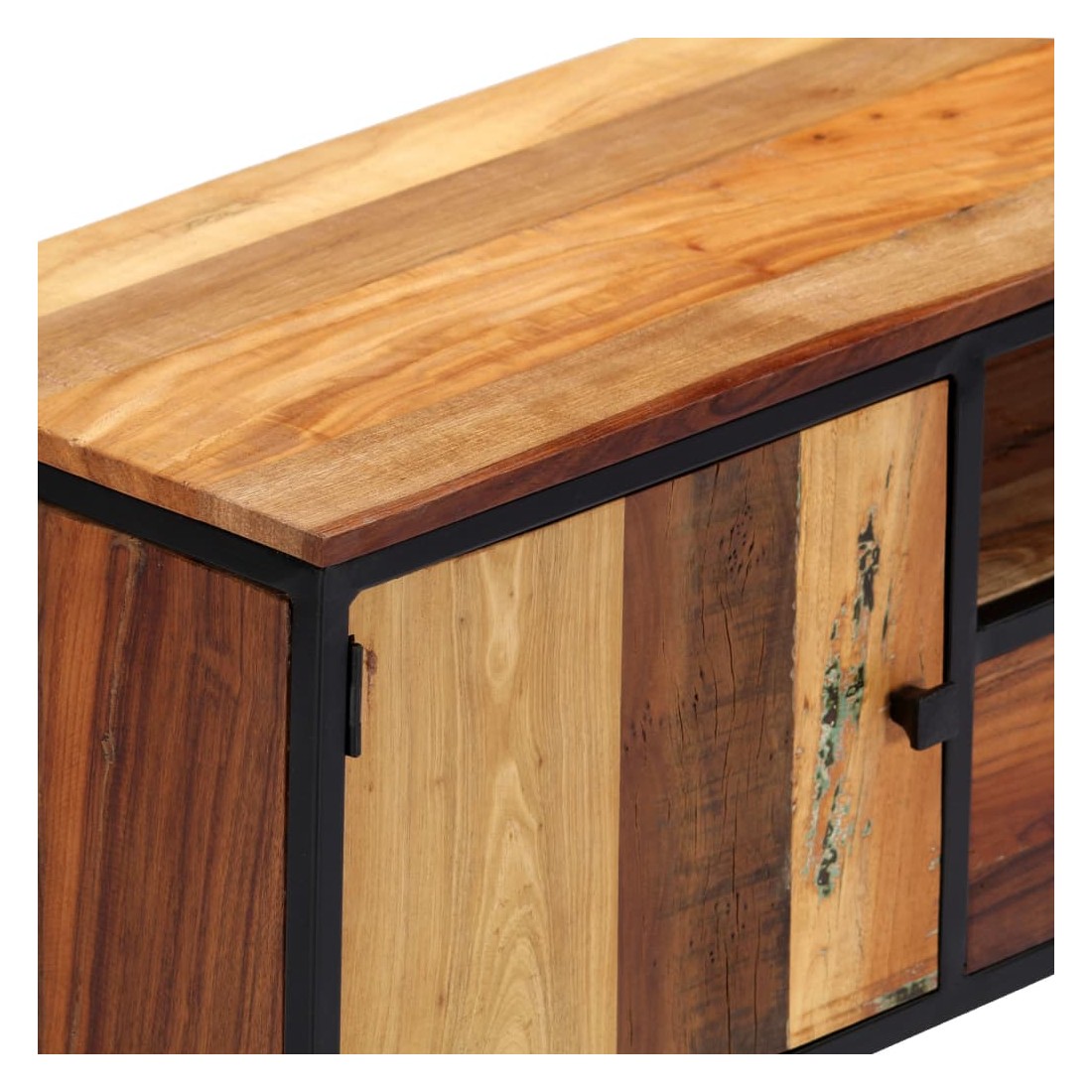 Apportez une touche d'élégance du milieu du siècle à votre intérieur avec notre beau meuble TV en bois de récupération massif ! Cette armoire Hi-Fi est fabriquée en bois de récupération massif provenant des solives, des planchers et des poutres de soutènement de vieux bâtiments démolis et peut être composée de différents types de bois comme pin, teck, hêtre, chêne, cèdre, bois de manguier, acacia etc. Cela signifie que le bois de récupération conserve les caractéristiques de ces différents types de bois. Le bois de récupération est déjà vieilli, patiné et séché, donc il ne rétrécit pas et ne se plie pas. Chaque étape du processus est réalisée avec le plus grand soin, que ce soit le polissage, la peinture ou le laquage. L'artisanat exquis et les grains de bois gracieux rendent chaque meuble distinctif et légèrement différent l'un de l'autre. Cette armoire à plasma se distingue par 2 portes, 2 tiroirs et 1 compartiment, offrant une solution idéale pour garder vos petits objets rangés et à portée de main. De plus, la structure en acier enduit de poudre ajoute à la robustesse et à la stabilité de l'armoire. Le support TV est facile à assembler. Note importante : Les couleurs et les grains de bois varient d'une pièce à l'autre, ce qui rend chacun de nos meubles TV unique. La livraison est aléatoire, ce qui garantit l'exclusivité et l'individualité de votre produit.