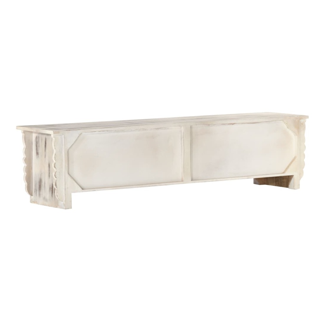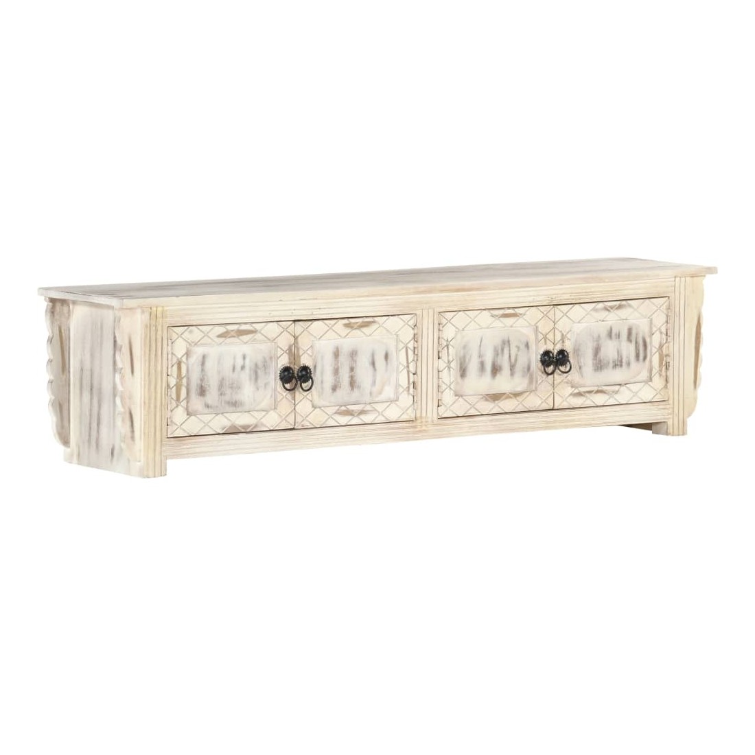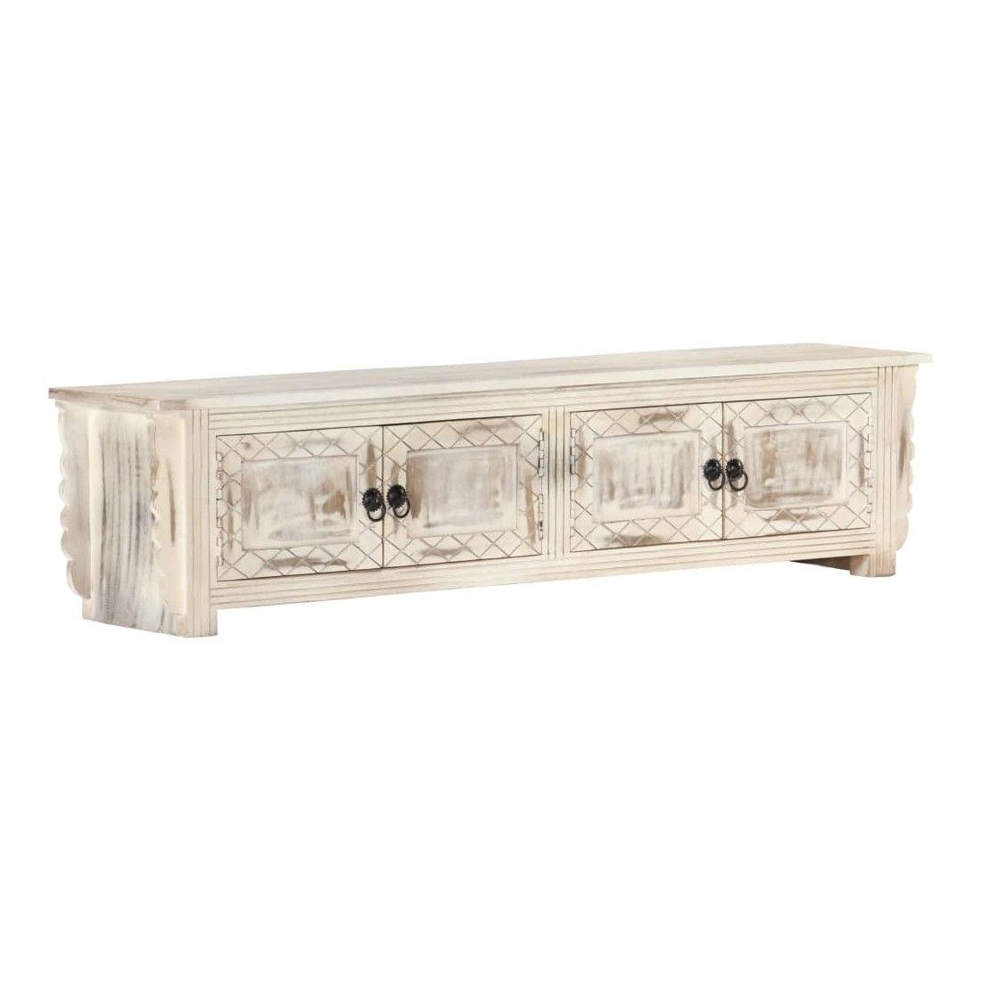 Ce meuble TV en bois dégage un charme rustique et sera un excellent supplément à votre intérieur. Ce meuble TV est en bois de manguier massif et dispose d'un magnifique lavage blanc. Chaque étape du processus est réalisée avec le plus grand soin, que ce soit le polissage, la peinture ou le laquage. Doté de 4 portes, ce meuble offre suffisamment d'espace pour ranger vos appareils multimédia, vos livres, ainsi que divers autres articles. Remarque importante : Les couleurs et le grain du bois peuvent varier d'une pièce à l'autre, ce qui rend chaque table basse unique en son genre. La livraison est aléatoire, ce qui garantit l'exclusivité et l'individualité de votre produit.