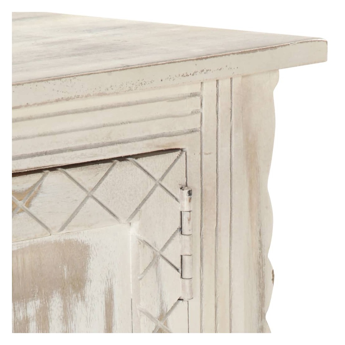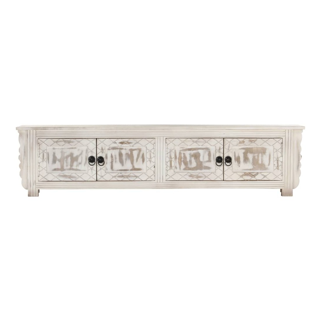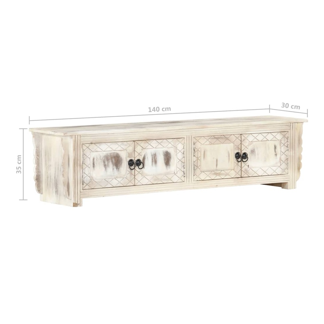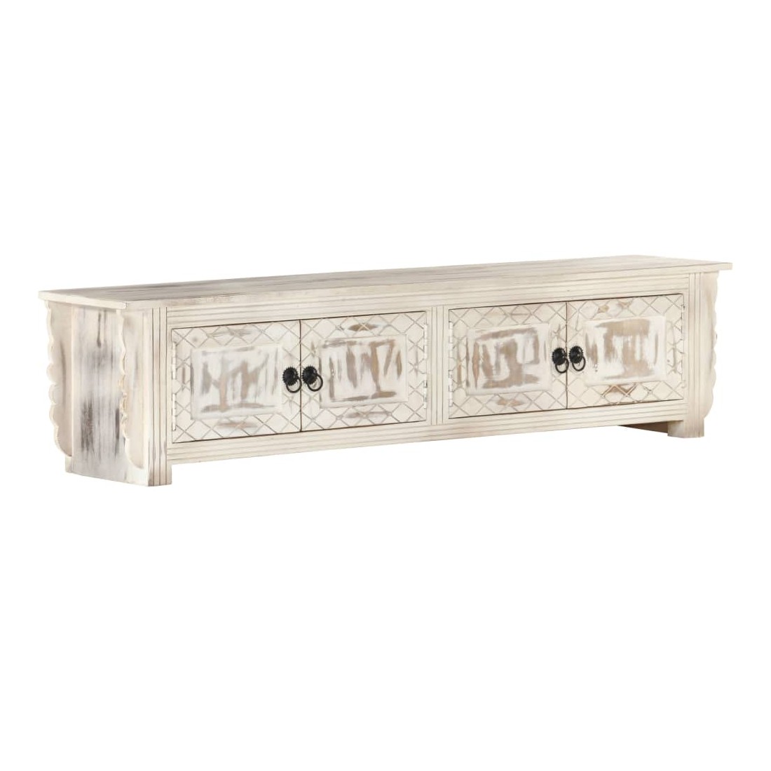 Ce meuble TV en bois dégage un charme rustique et sera un excellent supplément à votre intérieur. Ce meuble TV est en bois de manguier massif et dispose d'un magnifique lavage blanc. Chaque étape du processus est réalisée avec le plus grand soin, que ce soit le polissage, la peinture ou le laquage. Doté de 4 portes, ce meuble offre suffisamment d'espace pour ranger vos appareils multimédia, vos livres, ainsi que divers autres articles. Remarque importante : Les couleurs et le grain du bois peuvent varier d'une pièce à l'autre, ce qui rend chaque table basse unique en son genre. La livraison est aléatoire, ce qui garantit l'exclusivité et l'individualité de votre produit.