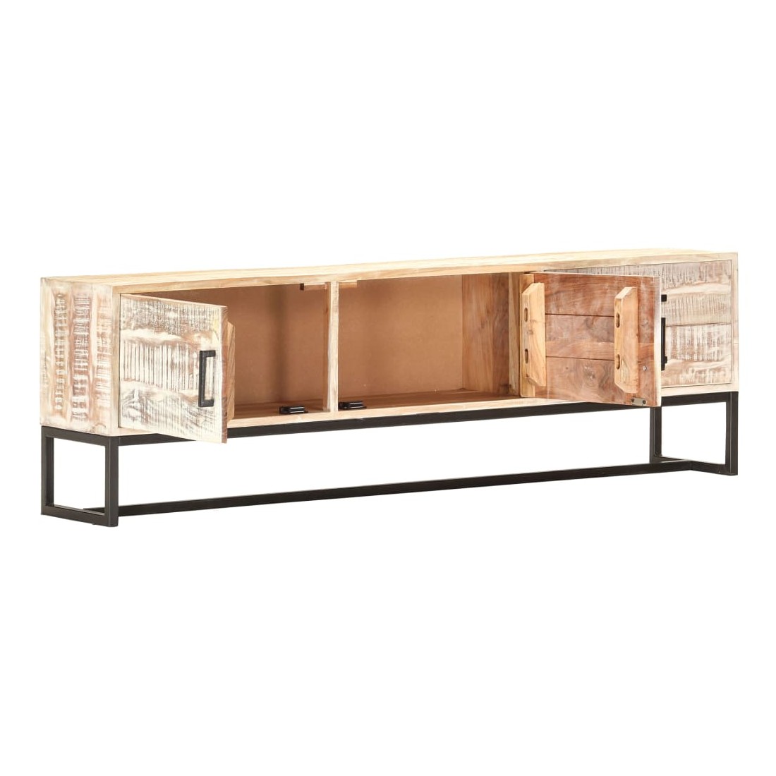 Ce meuble TV en bois d'acacia massif sera un excellent supplément à votre salon grâce à son design remarquable. Il peut également être utilisé en tant que buffet ou meuble de rangement et attirera certainement l'attention de vos visiteurs. L'armoire est en bois d'acacia massif et en acier enduit de poudre, ce qui est très stable et durable. L'artisanat et les beaux grains de bois rendent chaque pièce de meuble unique et légèrement différente l'une de l'autre. La grande surface supérieure peut également être utilisée pour placer temporairement des ornements. Le meuble TV a 2 portes et 2 tiroirs, ce qui offre un grand espace de rangement pour ranger les magazines, livres, DVD et appareils multimédia. Le meuble TV est facile à assembler. Remarque importante : les couleurs et les grains va