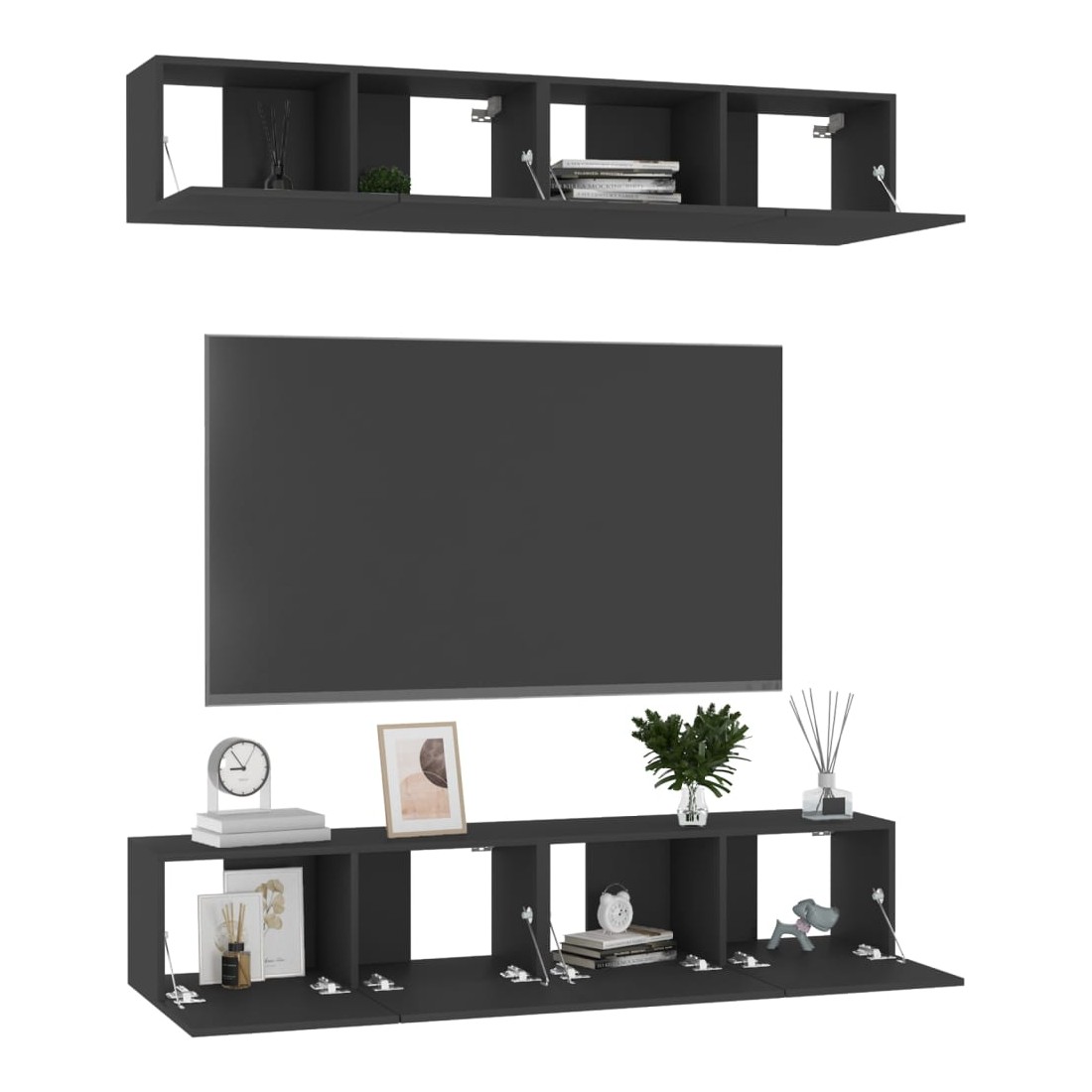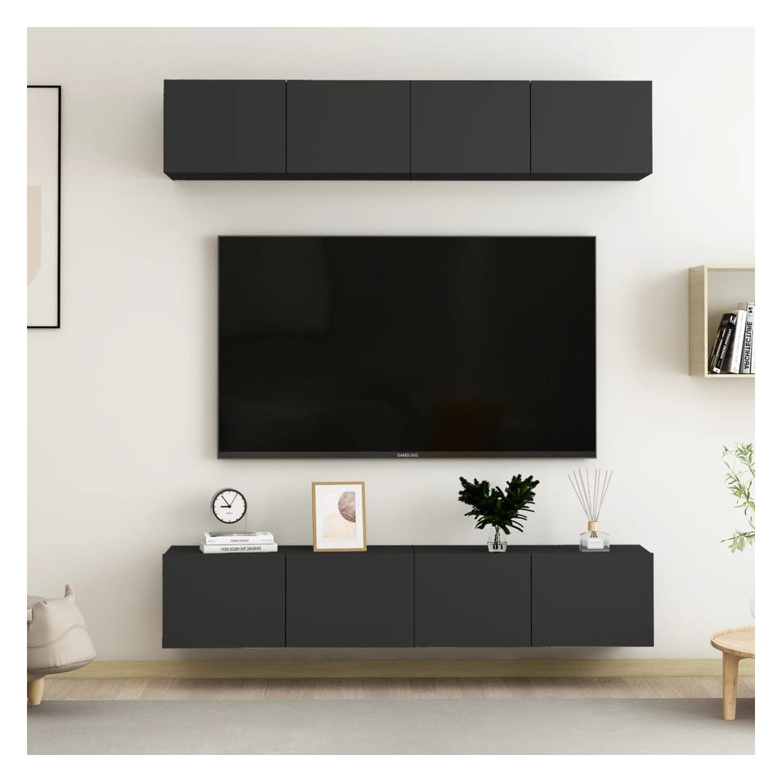 Cet ensemble de meuble TV robuste est destiné à être le point de mire de votre pièce avec un design à la fois tendance et pratique. Le meuble TV est fixé au mur, ce qui en fait un supplément intemporel à votre maison. Il offre de nombreux compartiments de rangement, ce qui en fait un endroit idéal pour stocker tous vos livres, magazines, DVD ou autres objets. Le meuble stéréo est facile à entretenir et à nettoyer avec un chiffon humide.