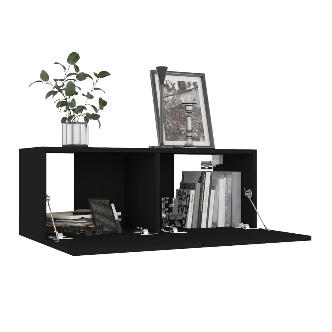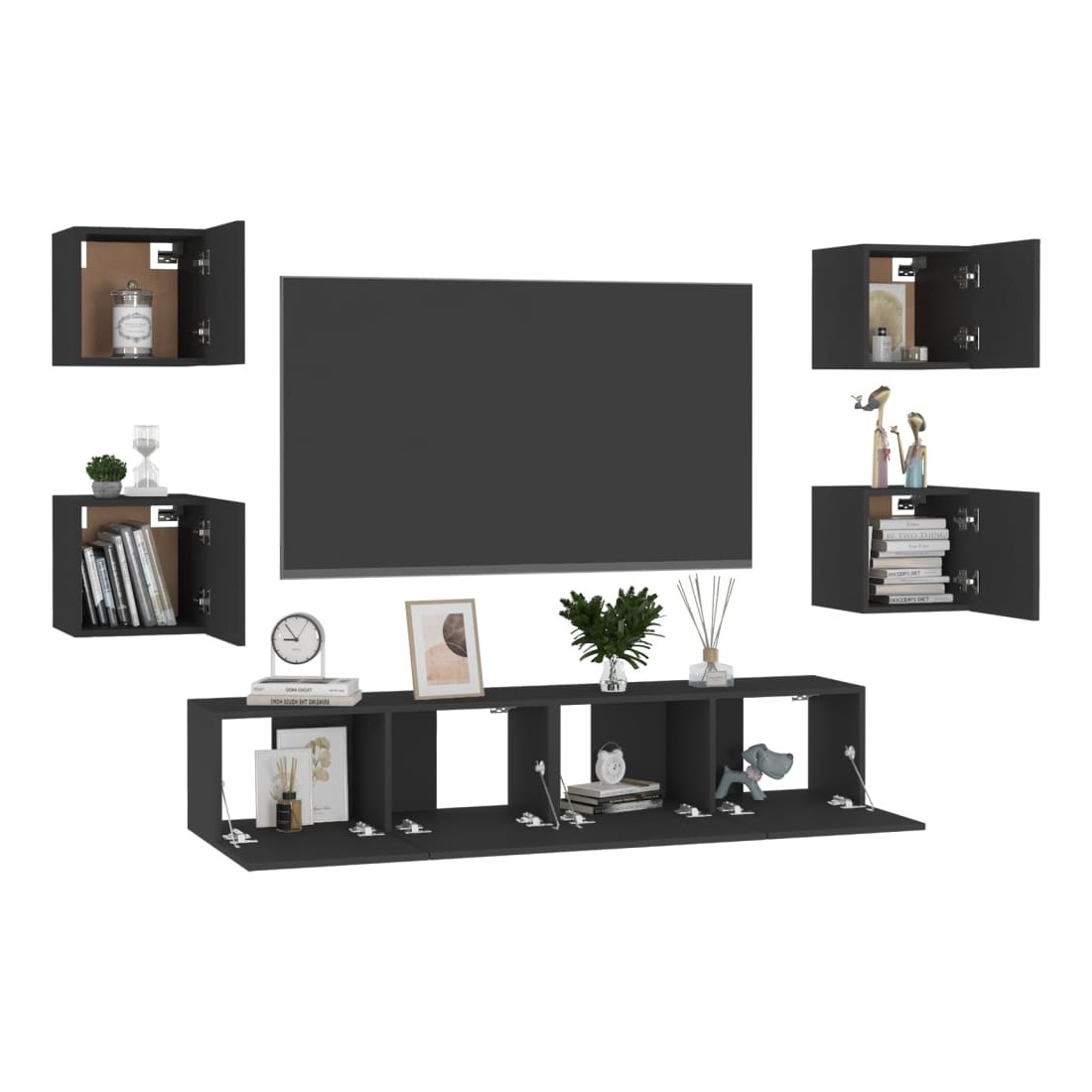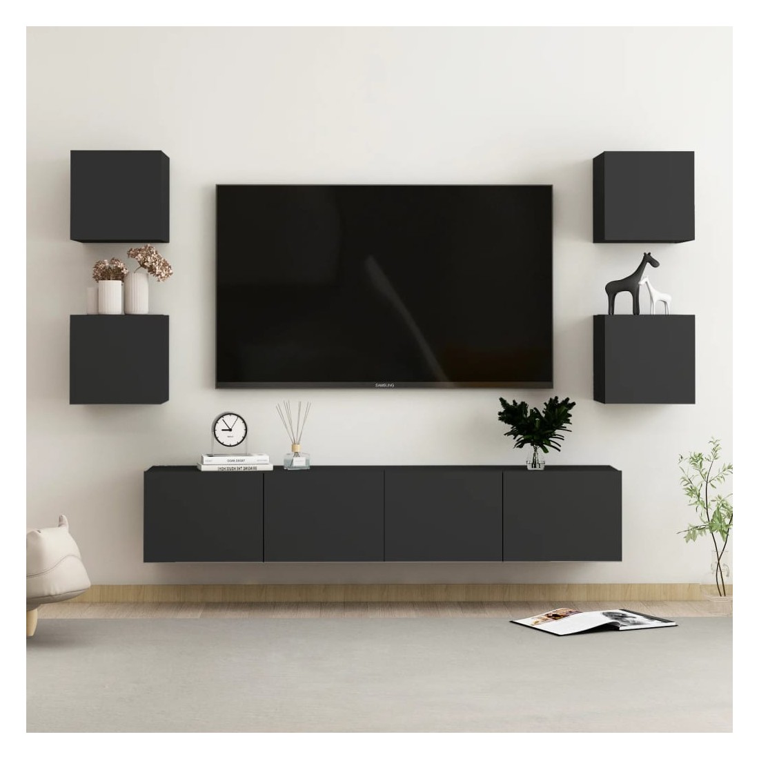 Cet ensemble de meuble TV robuste est destiné à être le point de mire de votre pièce avec un design à la fois tendance et pratique. Le meuble TV est fixé au mur, ce qui en fait un supplément intemporel à votre maison. Il offre de nombreux compartiments de rangement, ce qui en fait un endroit idéal pour stocker tous vos livres, magazines, DVD ou autres objets. Le meuble stéréo est facile à entretenir et à nettoyer avec un chiffon humide.