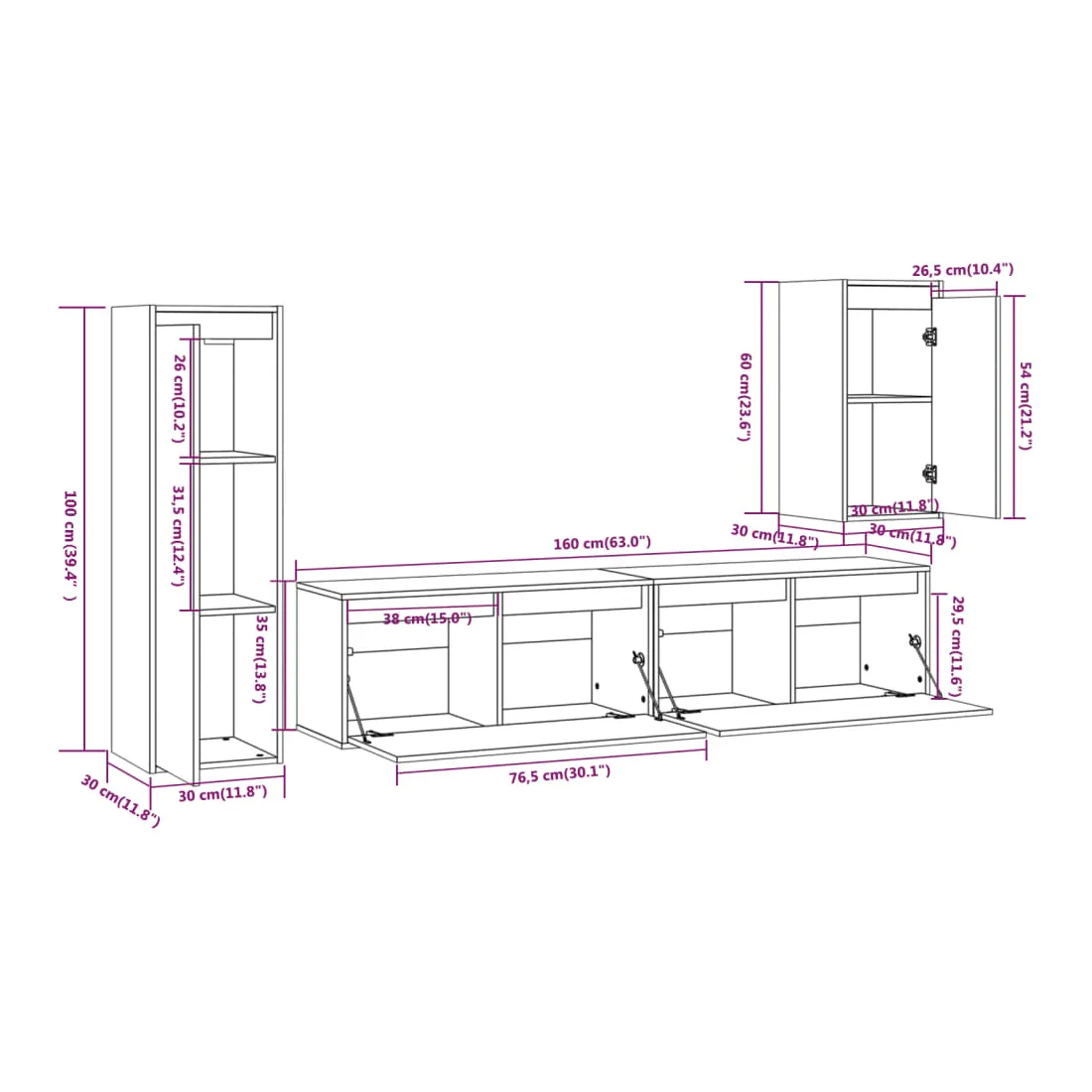 • 1 x meuble TV : 30 x 30 x 100 cm (l x P x H)