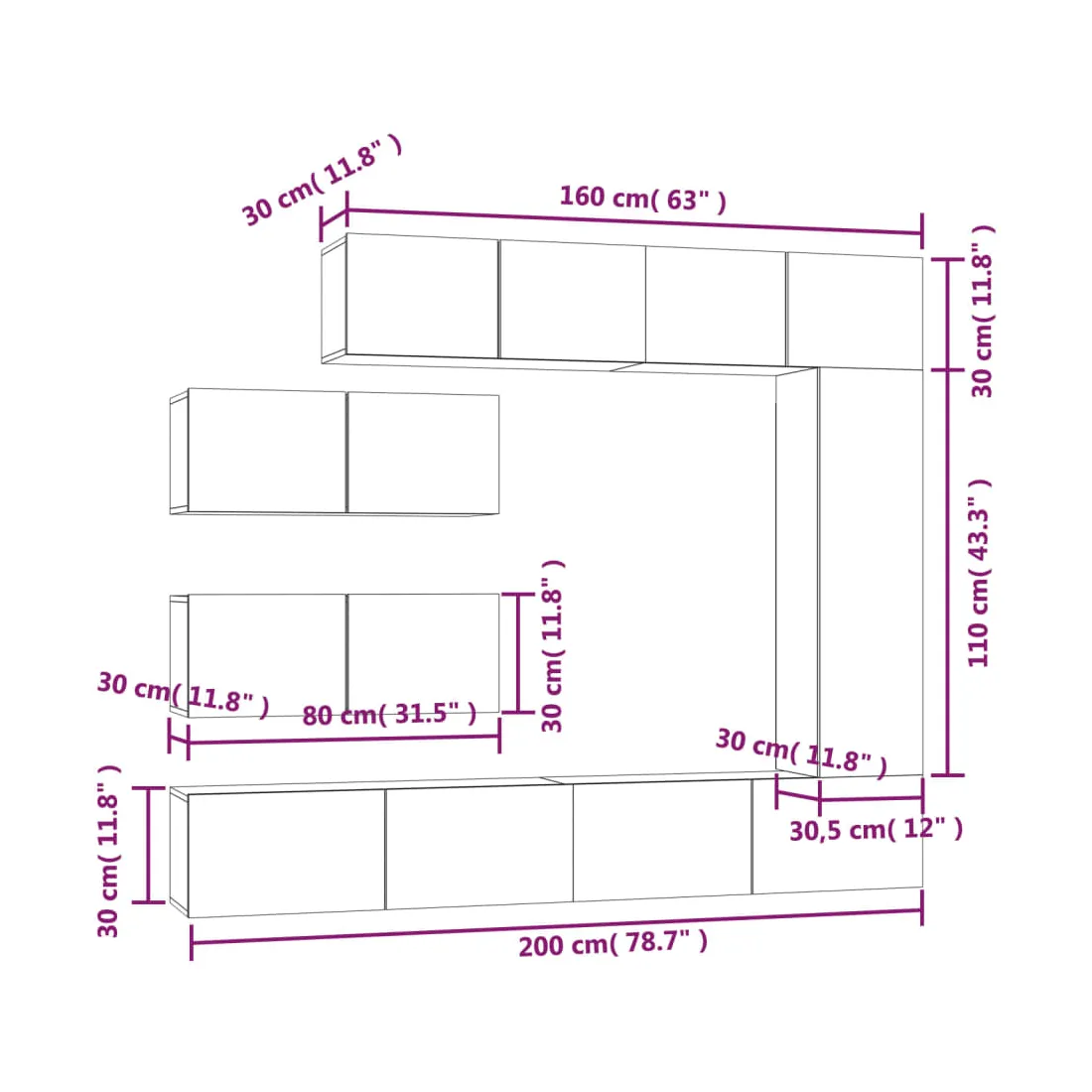 - 4 x meuble TV : 80 x 30 x 30 cm (L x l x H)