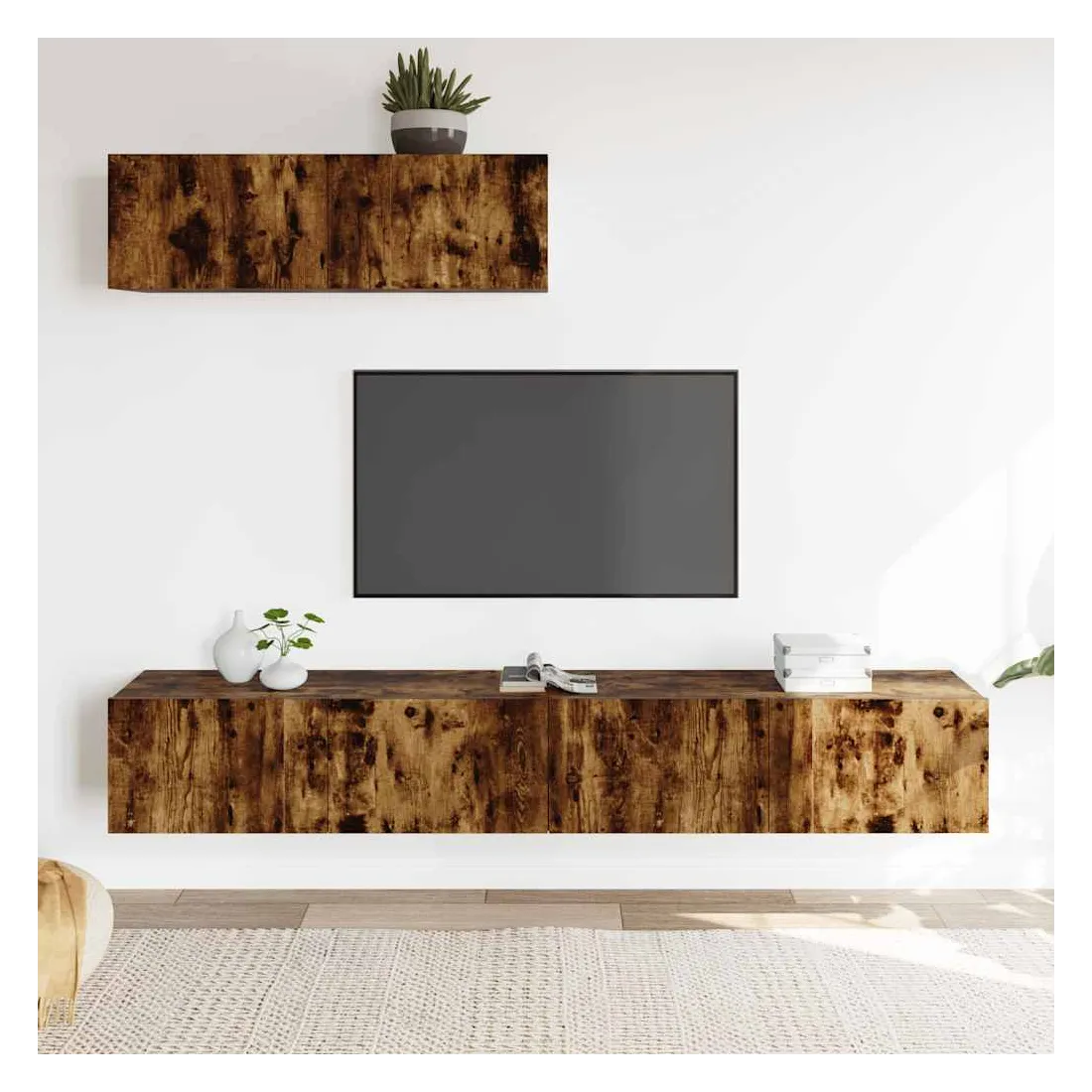 Cet ensemble de meubles TV classique est conçu pour être le point central de votre pièce, avec un design à la fois tendance et pratique. Matériau robuste : le bois d'ingénierie est d'une qualité exceptionnelle avec une surface lisse et présente également résistance, stabilité et résistance à l'humidité. Grand espace de rangement : l'ensemble de meubles TV offre un grand espace de rangement pour garder tous vos magazines, DVD et autres articles bien organisés. Design mural : le meuble TV ne prend pas de place au sol. Vous pouvez l'accrocher au mur facilement. Remarque : Les vis et les chevilles pour l'intérieur du mur ne sont pas incluses. Recherchez et utilisez des vis et des chevilles adaptées à vos murs. Si vous n'êtes pas sûr, demandez conseil à un professionnel. Lisez et suivez att