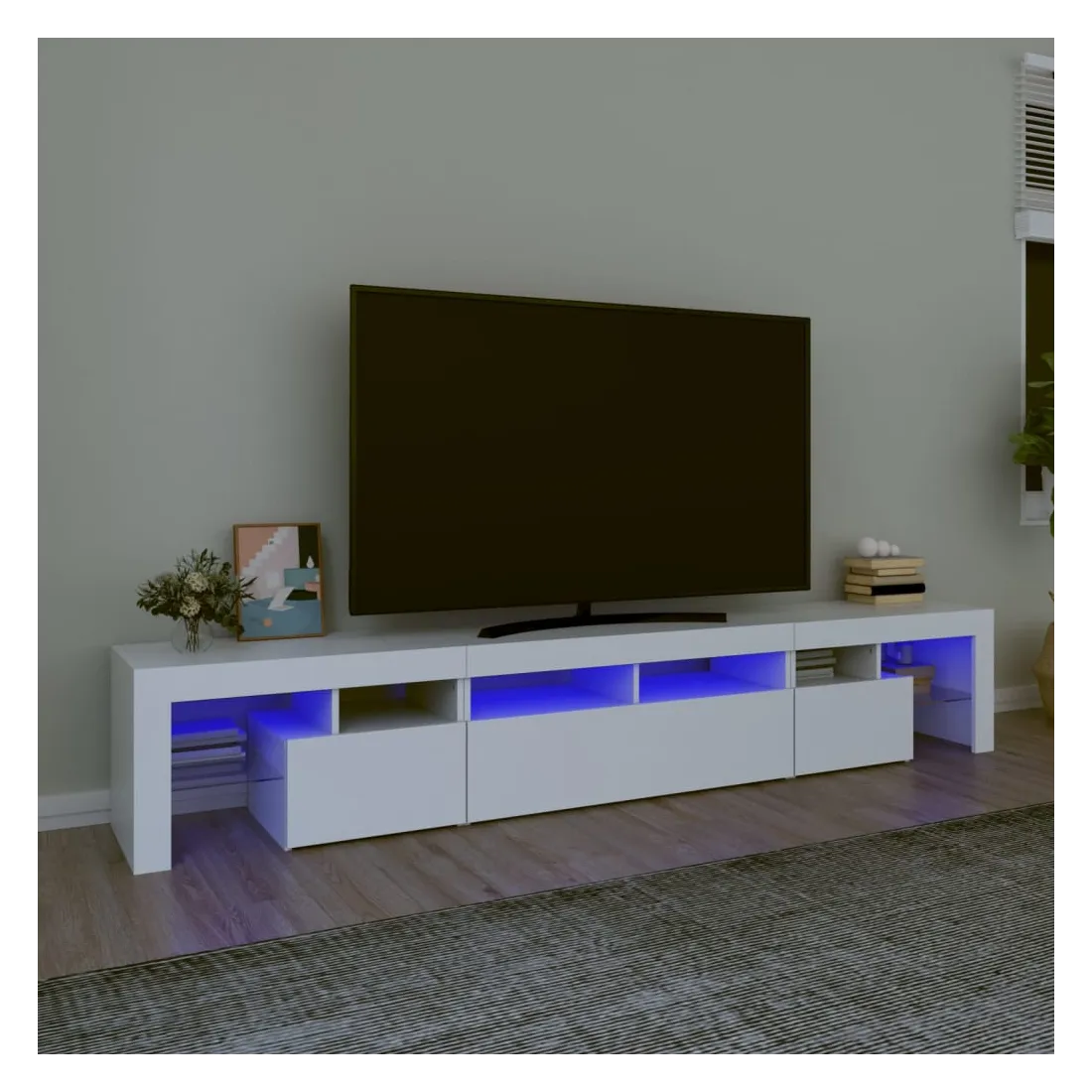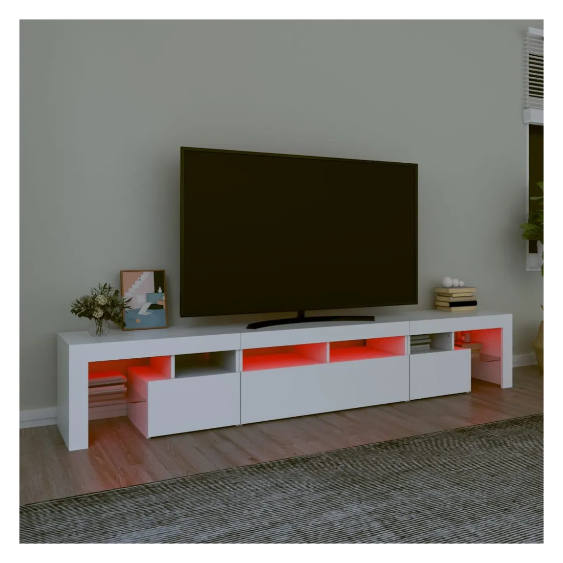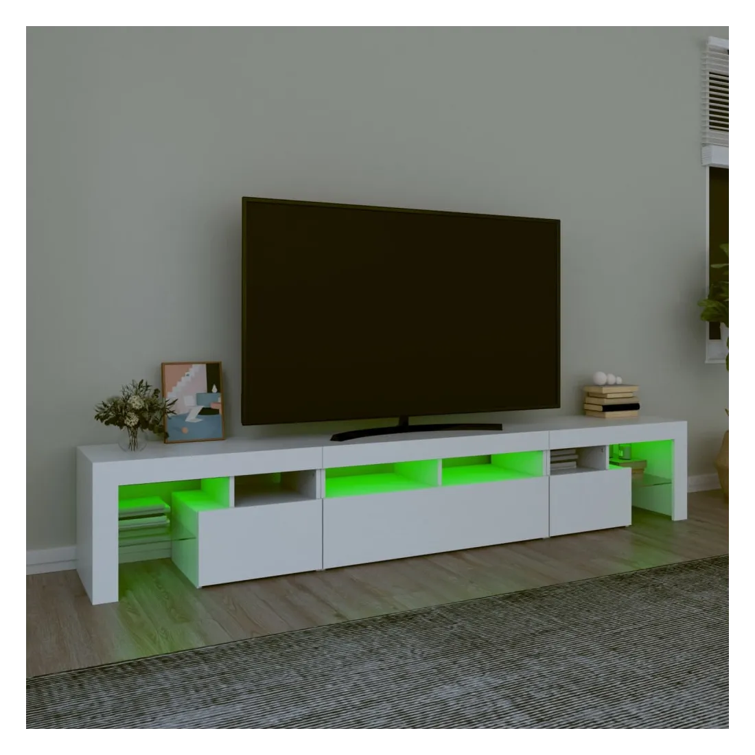Avec un design à la fois tendance et pratique, ce meuble TV avec éclairage LED deviendra certainement un point central de votre pièce. Matériau pratique : le bois d'ingénierie est d'une qualité exceptionnelle avec une surface lisse et présente également résistance, stabilité et résistance à l'humidité. Lumières LED colorées : le meuble TV est doté de lumières LED RVB, qui ont différents menus pour changer la couleur des lumières et laisser la couleur s'ajuster automatiquement. Les lumières LED soulignent l'aspect moderne et contribuent à la sensation de tendance.Grand espace de rangement : le meuble TV offre un grand espace de rangement pour garder vos magazines, livres, télécommandes et autres petits objets bien organisés et à portée de main.Fonction d'affichage : le dessus robuste du meuble média est idéal pour exposer des objets décoratifs, des cadres photo et des plantes en pot. Remarque :Ce produit est doté d'un connecteur USB, mais la source d'alimentation certifiée de USB 5V n'est pas incluse.Chaque produit est livré avec un manuel de montage dans la boîte pour un montage facile.