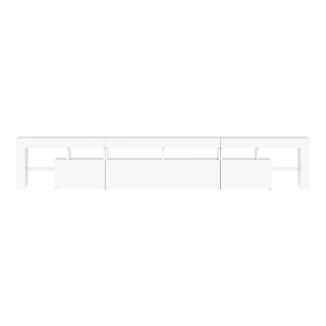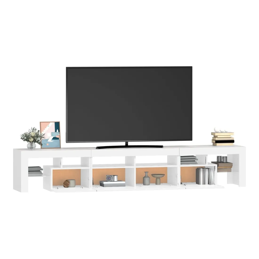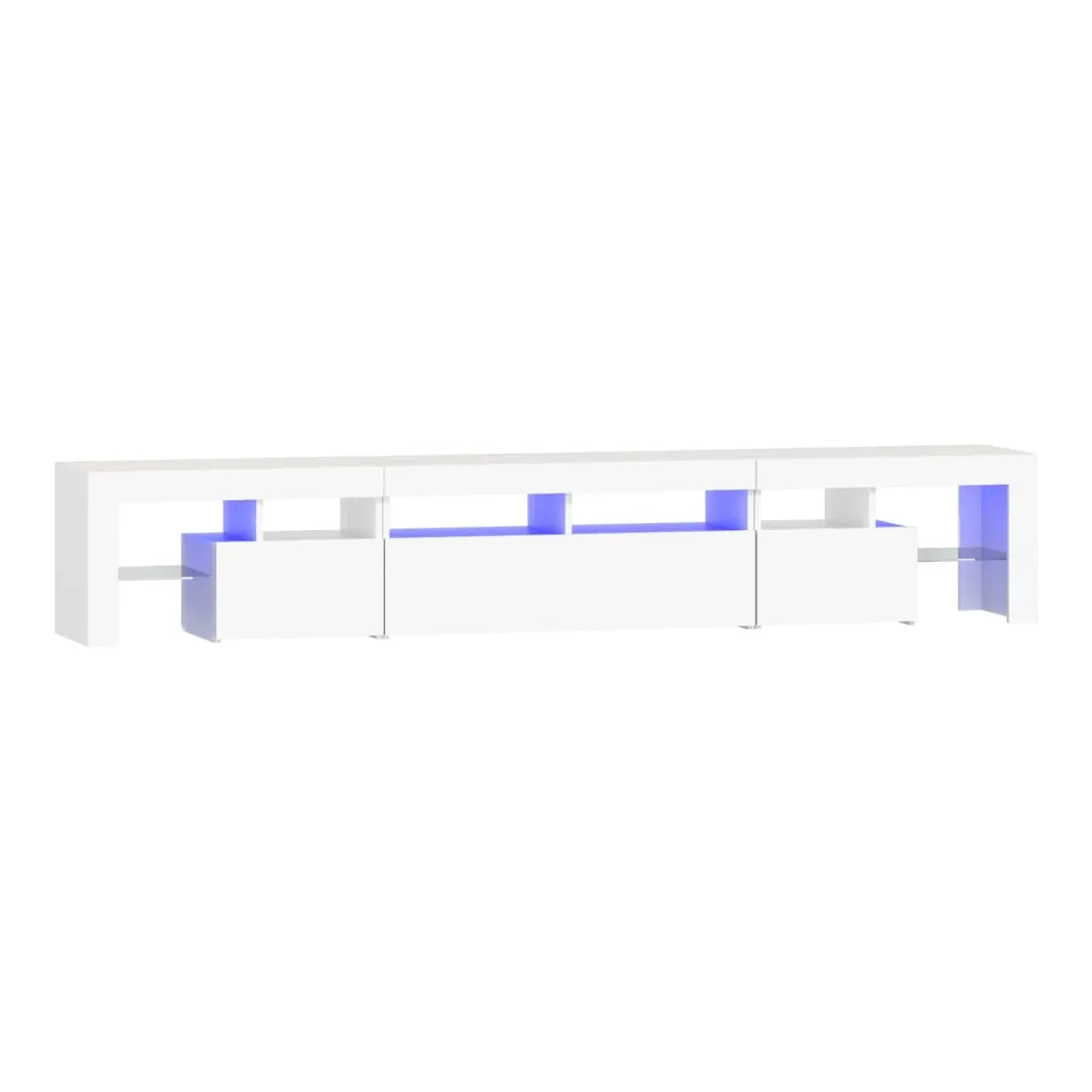 Avec un design à la fois tendance et pratique, ce meuble TV avec éclairage LED deviendra certainement un point central de votre pièce. Matériau pratique : le bois d'ingénierie est d'une qualité exceptionnelle avec une surface lisse et présente également résistance, stabilité et résistance à l'humidité. Lumières LED colorées : le meuble TV est doté de lumières LED RVB, qui ont différents menus pour changer la couleur des lumières et laisser la couleur s'ajuster automatiquement. Les lumières LED soulignent l'aspect moderne et contribuent à la sensation de tendance.Grand espace de rangement : le meuble TV offre un grand espace de rangement pour garder vos magazines, livres, télécommandes et autres petits objets bien organisés et à portée de main.Fonction d'affichage : le dessus robuste du meuble média est idéal pour exposer des objets décoratifs, des cadres photo et des plantes en pot. Remarque :Ce produit est doté d'un connecteur USB, mais la source d'alimentation certifiée de USB 5V n'est pas incluse.Chaque produit est livré avec un manuel de montage dans la boîte pour un montage facile.