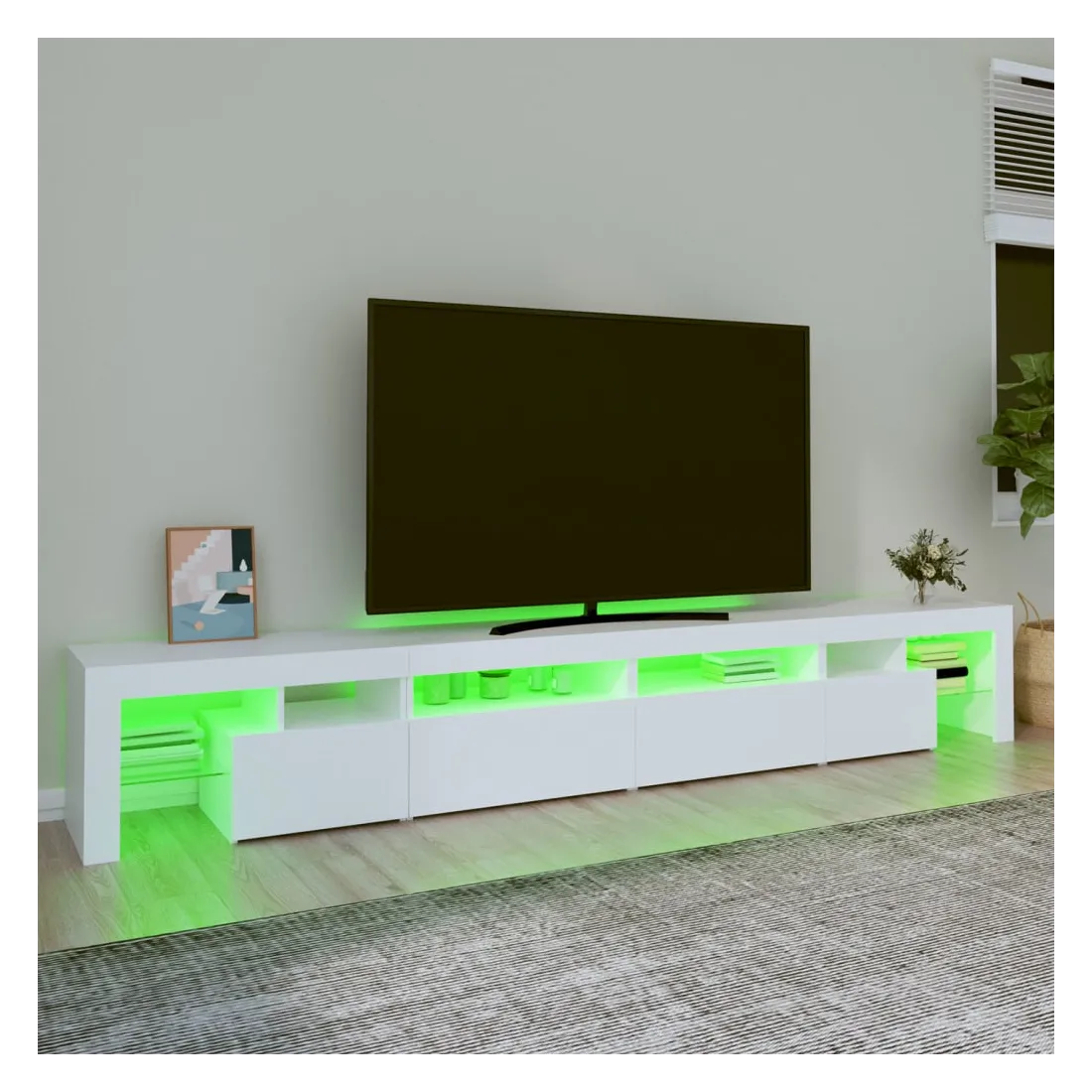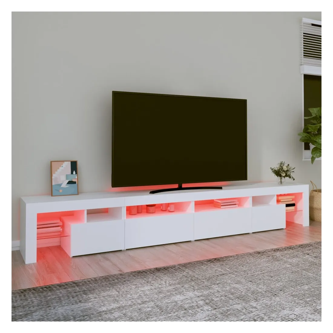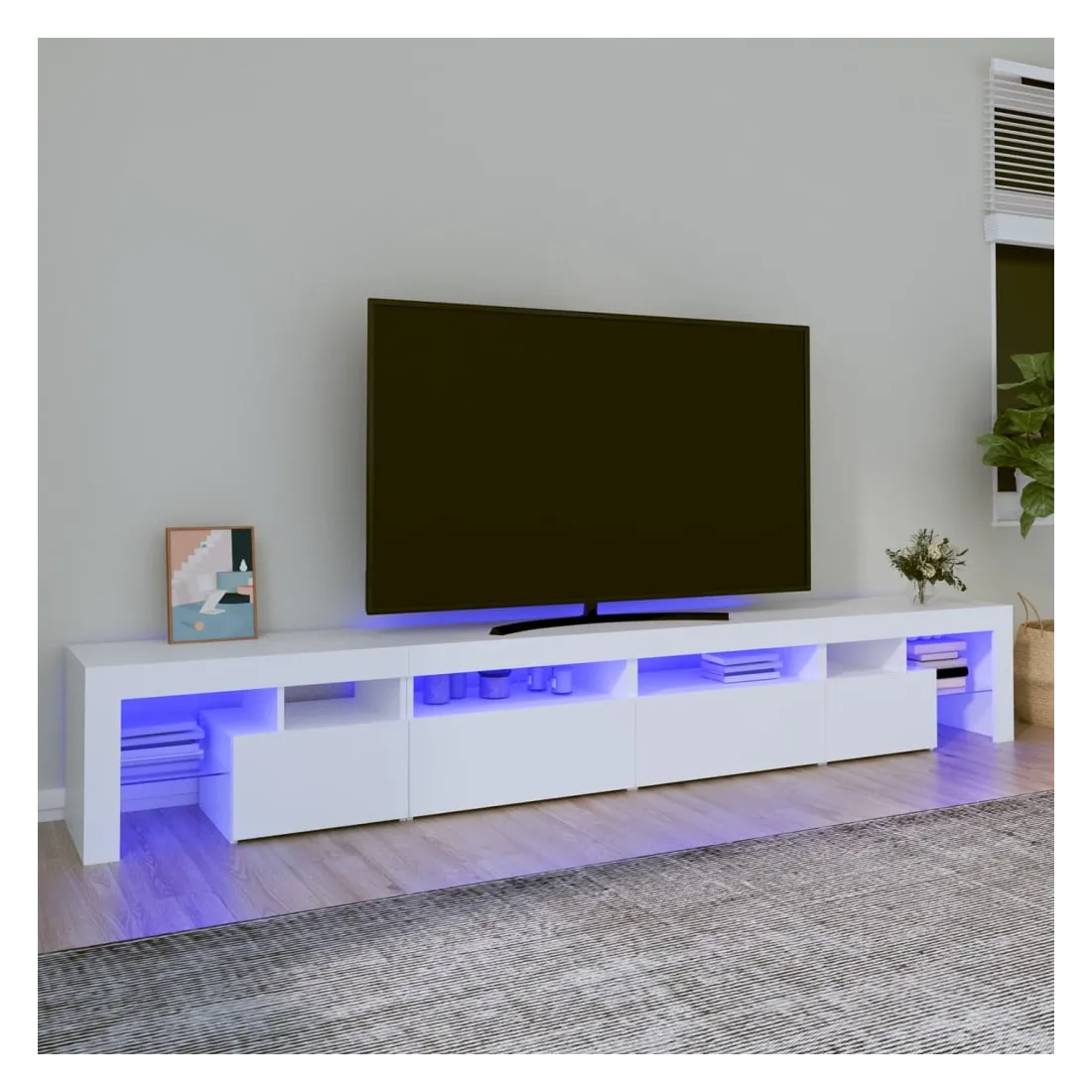Avec un design à la fois tendance et pratique, ce meuble TV avec éclairage LED deviendra certainement un point central de votre pièce. Matériau pratique : le bois d'ingénierie est d'une qualité exceptionnelle avec une surface lisse et présente également résistance, stabilité et résistance à l'humidité. Lumières LED colorées : le meuble TV est doté de lumières LED RVB, qui ont différents menus pour changer la couleur des lumières et laisser la couleur s'ajuster automatiquement. Les lumières LED soulignent l'aspect moderne et contribuent à la sensation de tendance.Grand espace de rangement : le meuble TV offre un grand espace de rangement pour garder vos magazines, livres, télécommandes et autres petits objets bien organisés et à portée de main.Fonction d'affichage : le dessus robuste du meuble média est idéal pour exposer des objets décoratifs, des cadres photo et des plantes en pot. Remarque :Ce produit est doté d'un connecteur USB, mais la source d'alimentation certifiée de USB 5V n'est pas incluse.Chaque produit est livré avec un manuel de montage dans la boîte pour un montage facile.