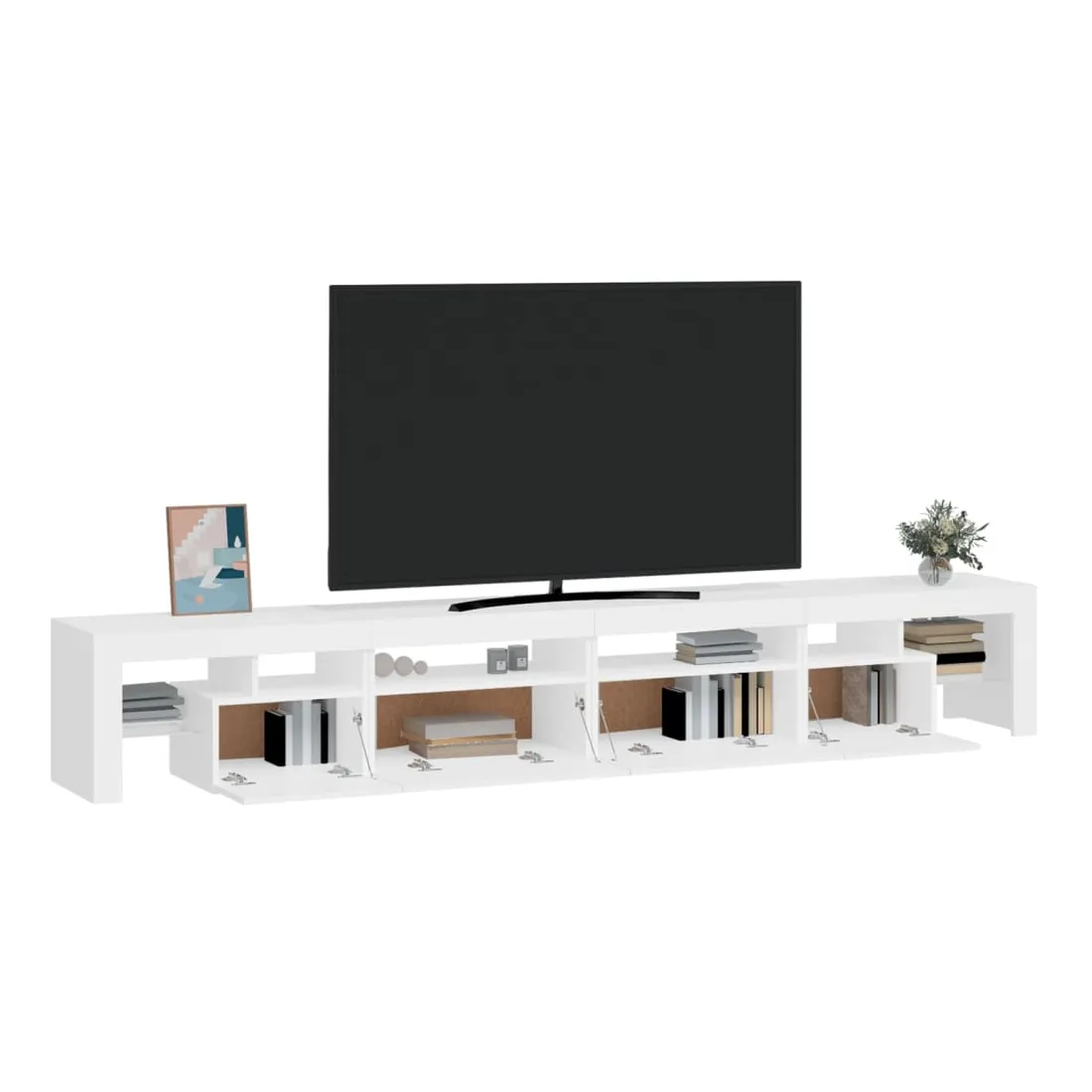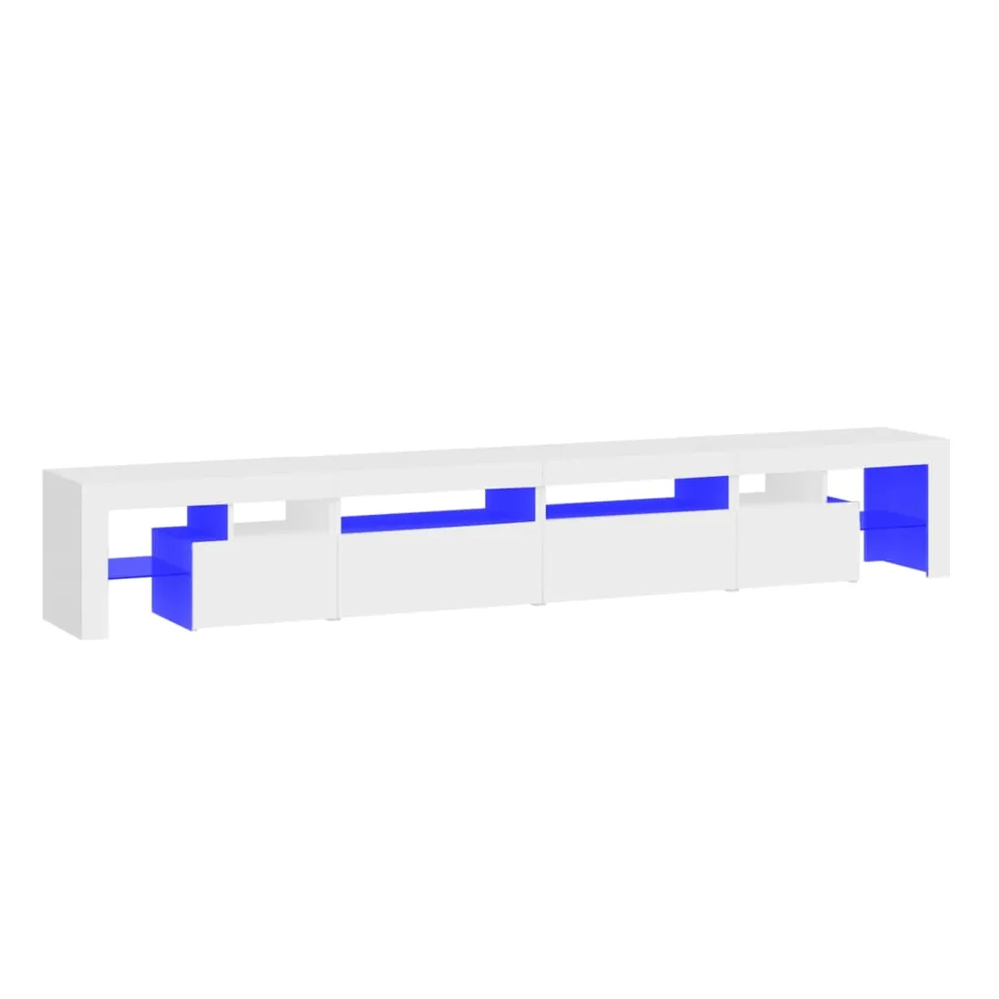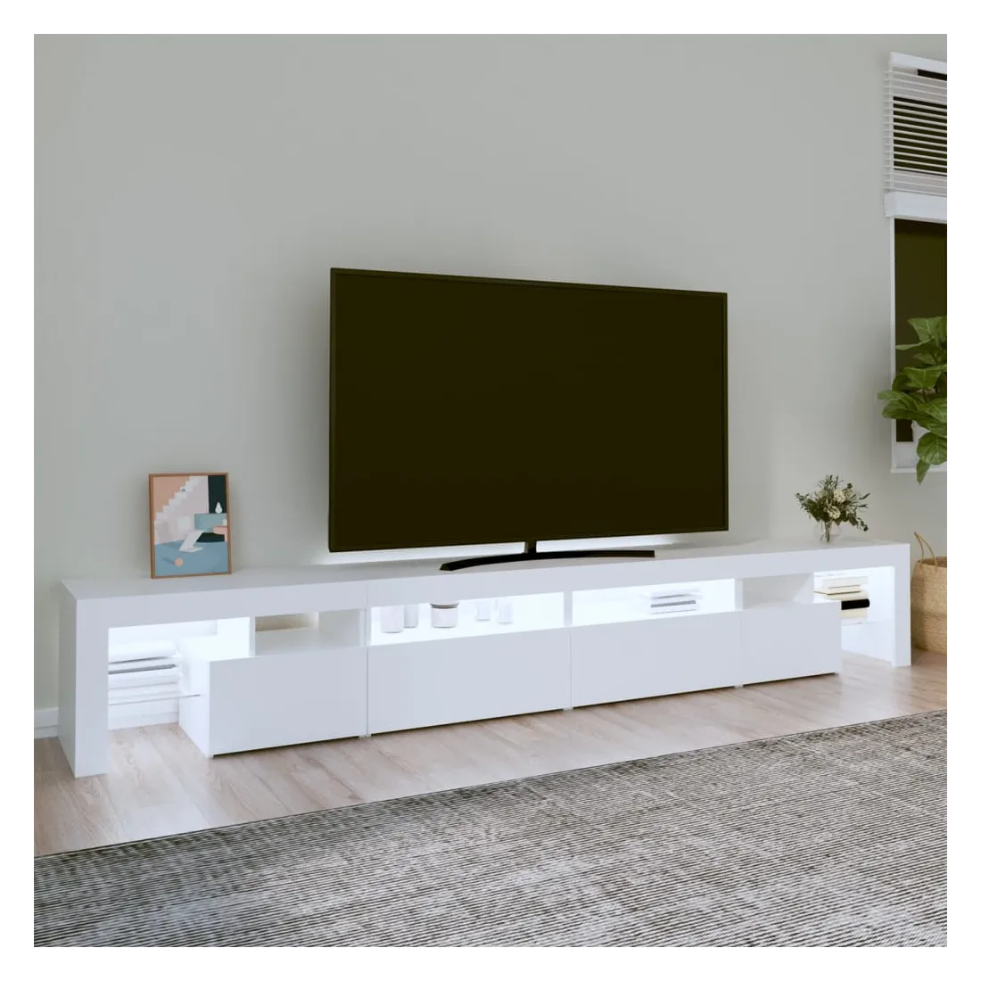 Avec un design à la fois tendance et pratique, ce meuble TV avec éclairage LED deviendra certainement un point central de votre pièce. Matériau pratique : le bois d'ingénierie est d'une qualité exceptionnelle avec une surface lisse et présente également résistance, stabilité et résistance à l'humidité. Lumières LED colorées : le meuble TV est doté de lumières LED RVB, qui ont différents menus pour changer la couleur des lumières et laisser la couleur s'ajuster automatiquement. Les lumières LED soulignent l'aspect moderne et contribuent à la sensation de tendance.Grand espace de rangement : le meuble TV offre un grand espace de rangement pour garder vos magazines, livres, télécommandes et autres petits objets bien organisés et à portée de main.Fonction d'affichage : le dessus robuste du meuble média est idéal pour exposer des objets décoratifs, des cadres photo et des plantes en pot. Remarque :Ce produit est doté d'un connecteur USB, mais la source d'alimentation certifiée de USB 5V n'est pas incluse.Chaque produit est livré avec un manuel de montage dans la boîte pour un montage facile.