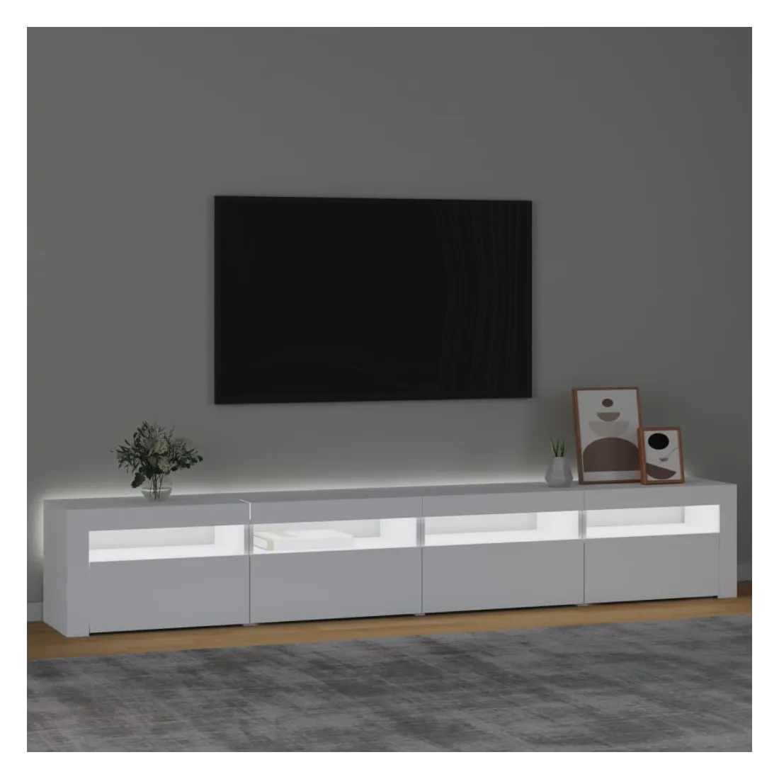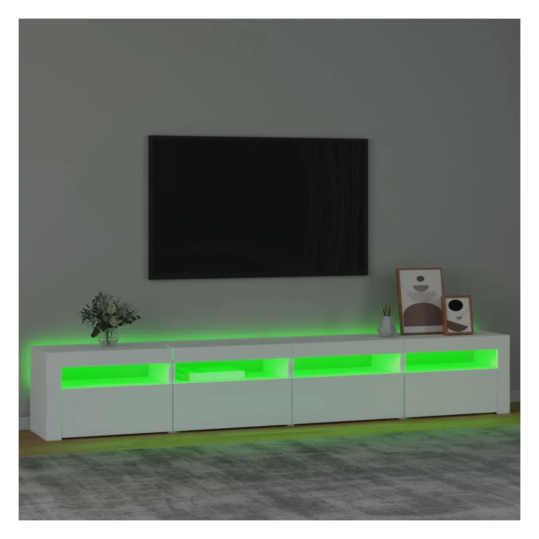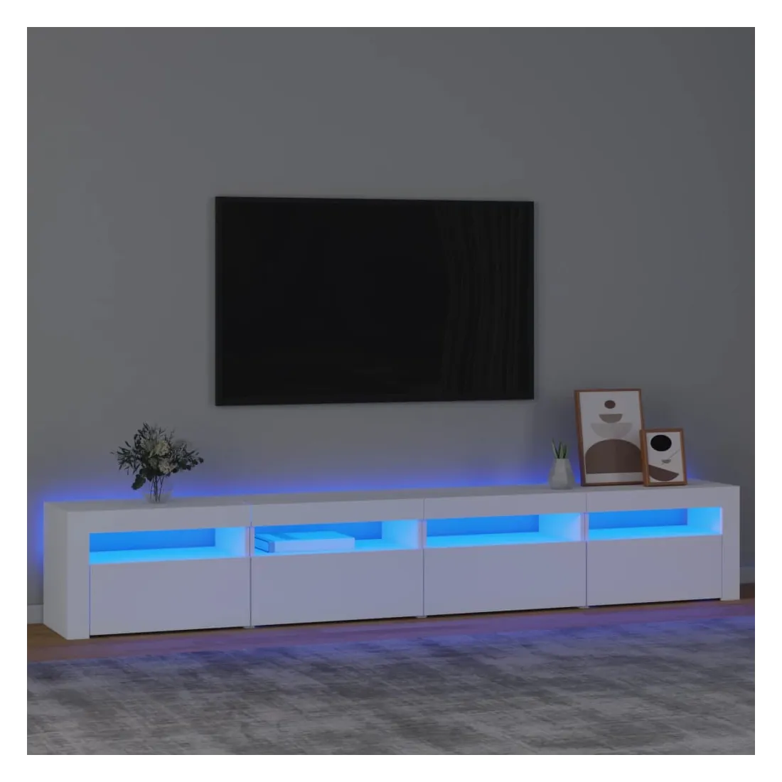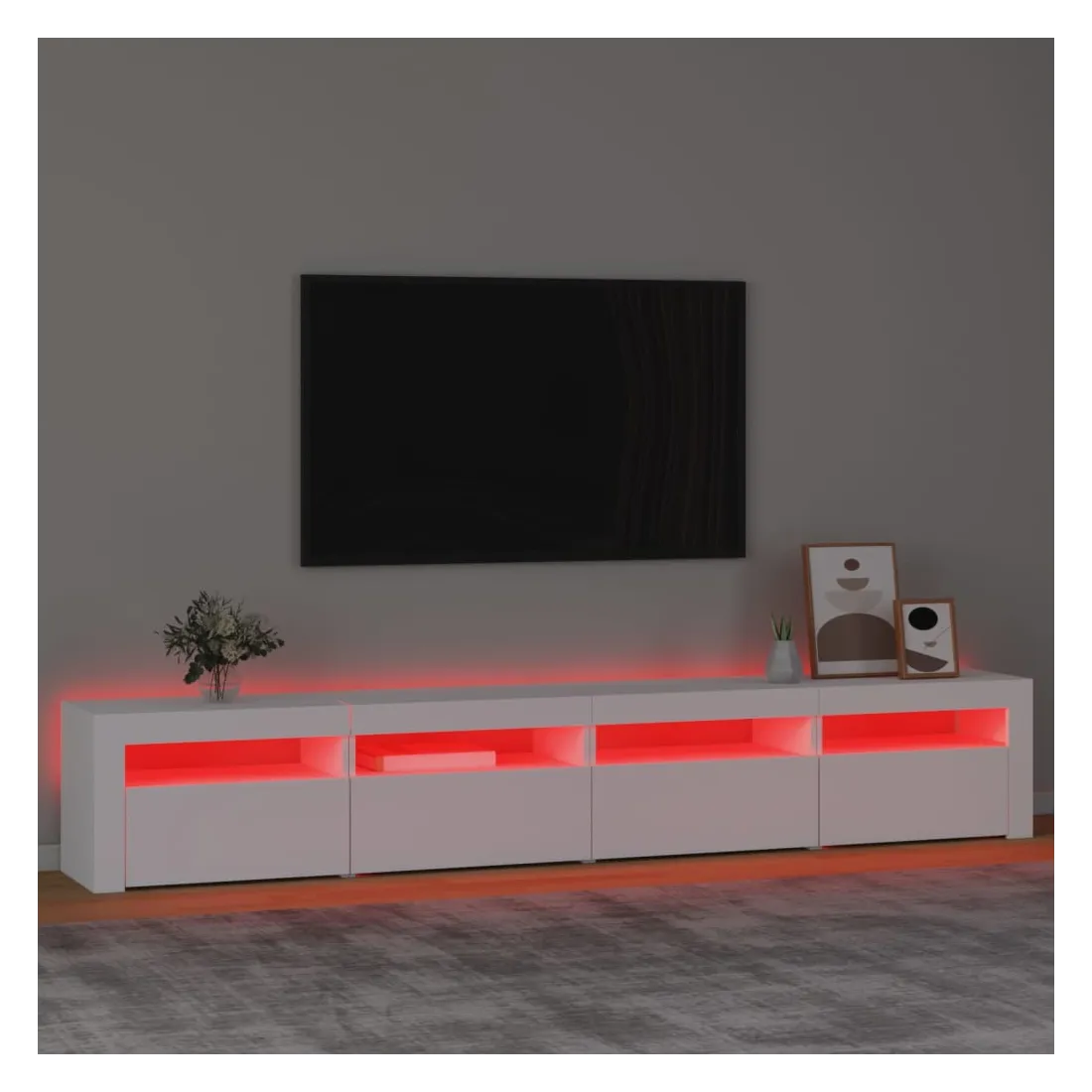 Avec un design à la fois tendance et pratique, ce meuble TV avec éclairage LED deviendra certainement un point central de votre pièce. Matériau pratique : le bois d'ingénierie est d'une qualité exceptionnelle avec une surface lisse et présente également résistance, stabilité et résistance à l'humidité. Lumières LED colorées : le meuble TV est doté de lumières LED RVB, qui ont différents menus pour changer la couleur des lumières et laisser la couleur s'ajuster automatiquement. Les lumières LED soulignent l'aspect moderne et contribuent à la sensation de tendance.Grand espace de rangement : le meuble TV offre un grand espace de rangement pour garder vos magazines, livres, télécommandes et autres petits objets bien organisés et à portée de main.Fonction d'affichage : le dessus robuste du meuble média est idéal pour exposer des objets décoratifs, des cadres photo et des plantes en pot. Remarque :Ce produit est doté d'un connecteur USB, mais la source d'alimentation certifiée de USB 5V n'est pas incluse.Chaque produit est livré avec un manuel de montage dans la boîte pour un montage facile.