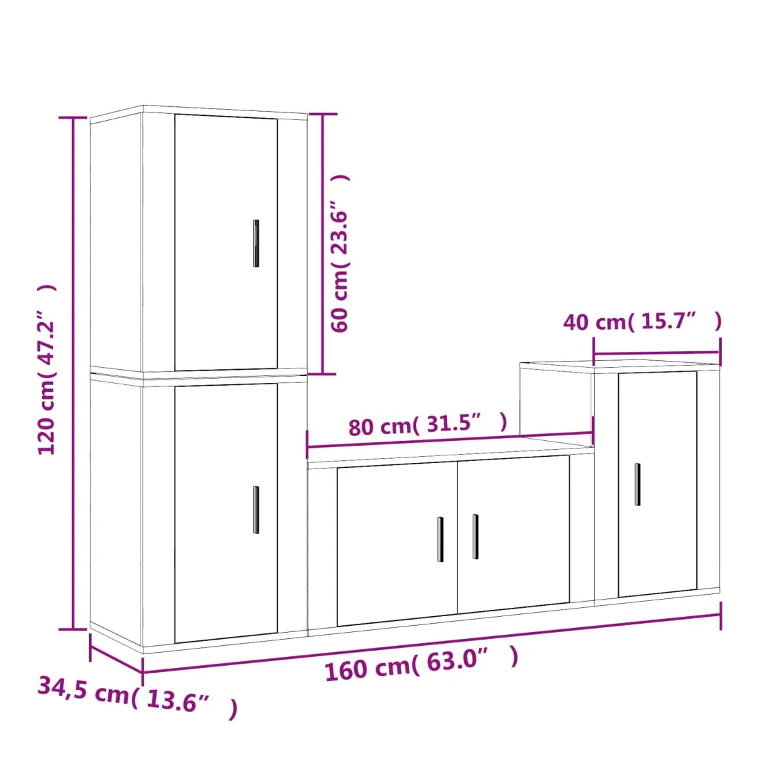 - 3 x meuble TV : 40 x 34,5 x 60 cm (L x l x H)