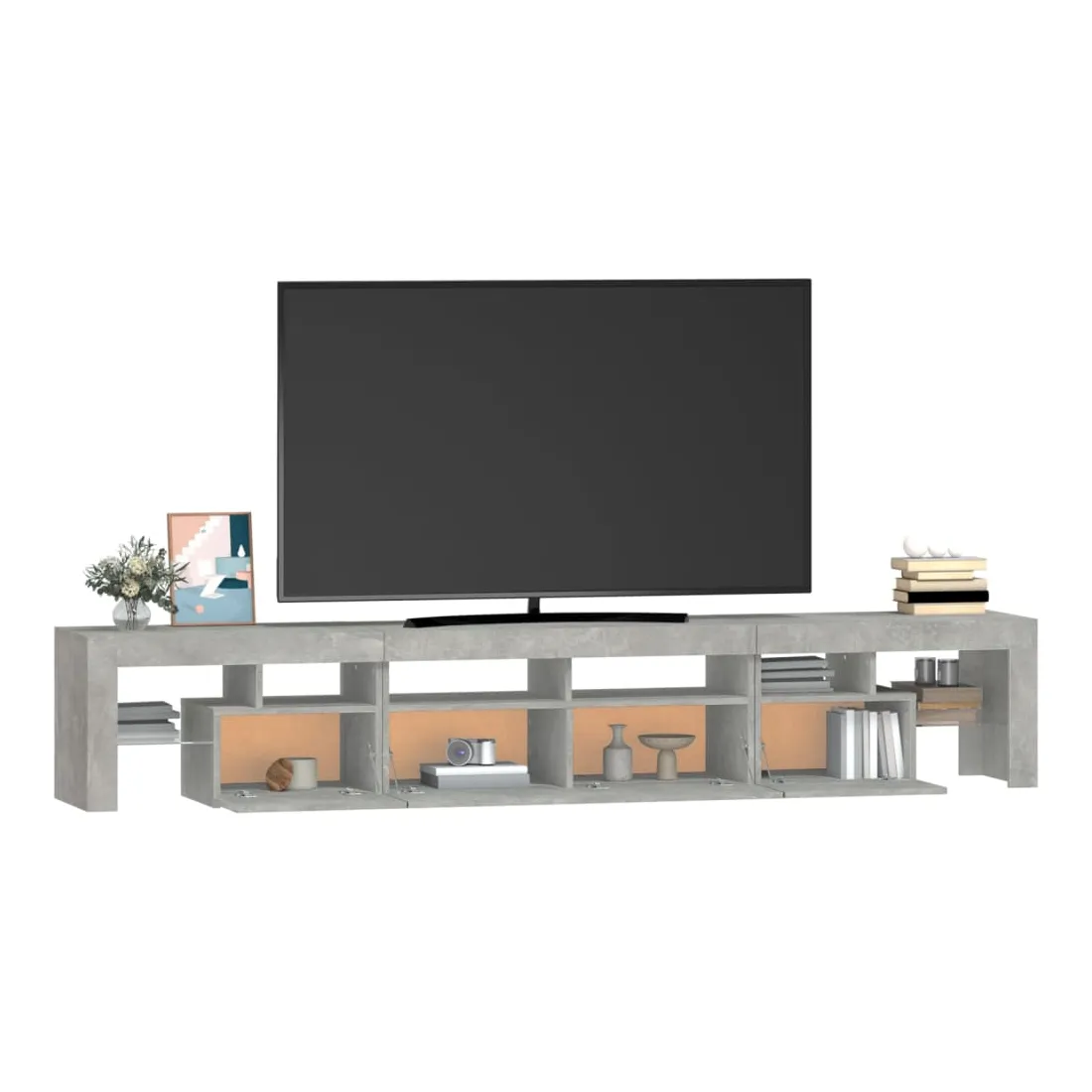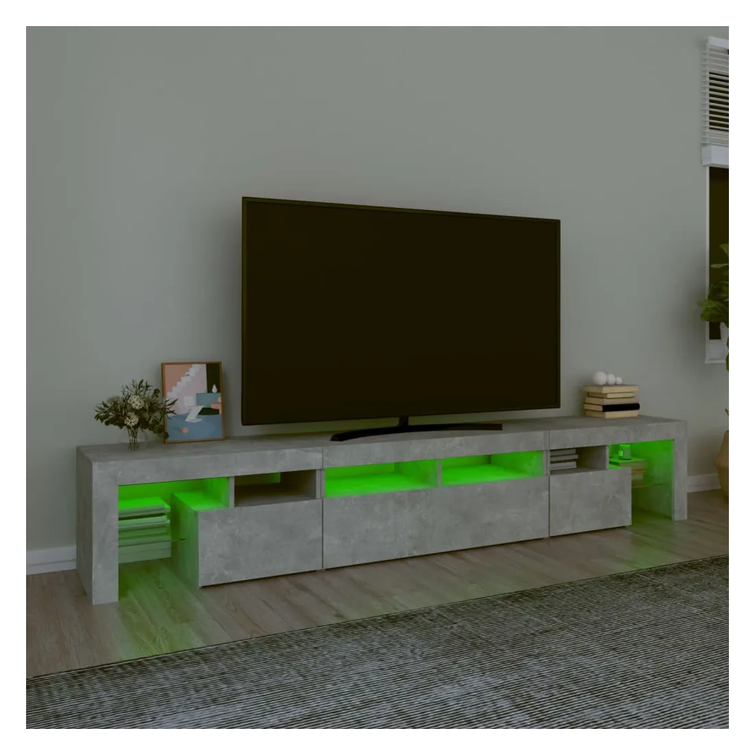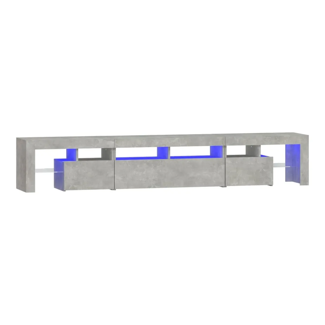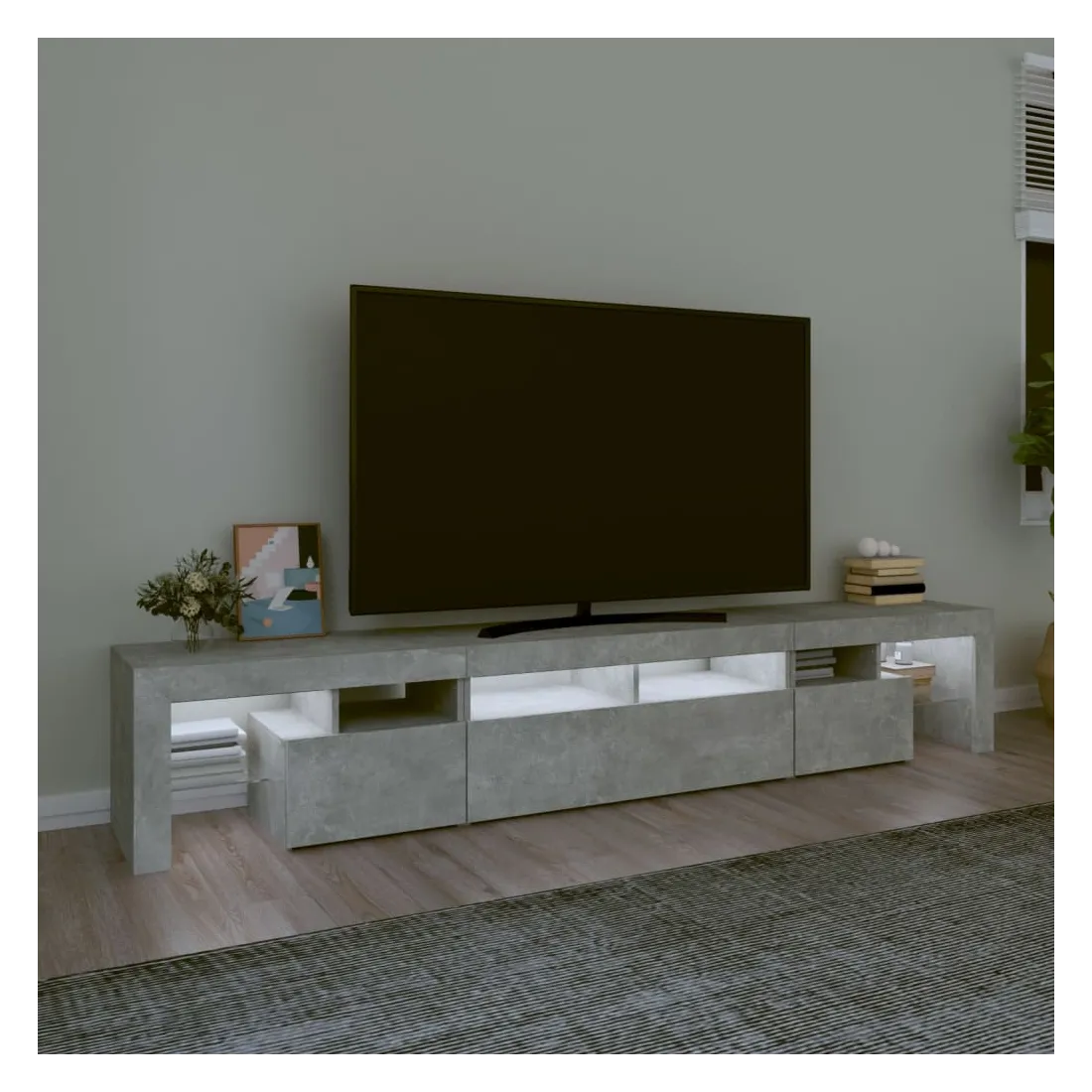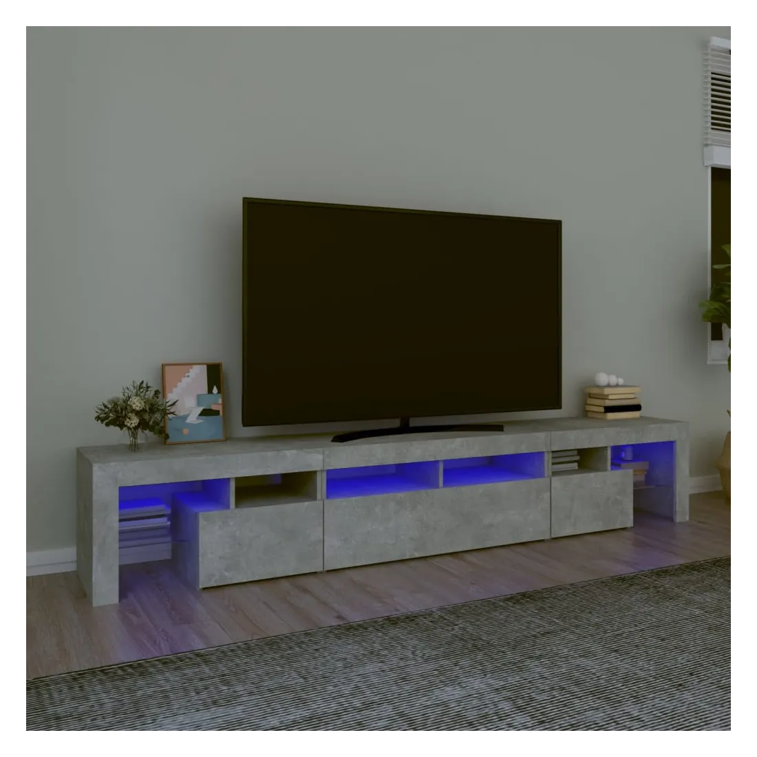 Avec un design à la fois tendance et pratique, ce meuble TV avec éclairage LED deviendra certainement un point central de votre pièce. Matériau pratique : le bois d'ingénierie est d'une qualité exceptionnelle avec une surface lisse et présente également résistance, stabilité et résistance à l'humidité. Lumières LED colorées : le meuble TV est doté de lumières LED RVB, qui ont différents menus pour changer la couleur des lumières et laisser la couleur s'ajuster automatiquement. Les lumières LED soulignent l'aspect moderne et contribuent à la sensation de tendance.Grand espace de rangement : le meuble TV offre un grand espace de rangement pour garder vos magazines, livres, télécommandes et autres petits objets bien organisés et à portée de main.Fonction d'affichage : le dessus robuste du meuble média est idéal pour exposer des objets décoratifs, des cadres photo et des plantes en pot. Remarque :Ce produit est doté d'un connecteur USB, mais la source d'alimentation certifiée de USB 5V n'est pas incluse.Chaque produit est livré avec un manuel de montage dans la boîte pour un montage facile.