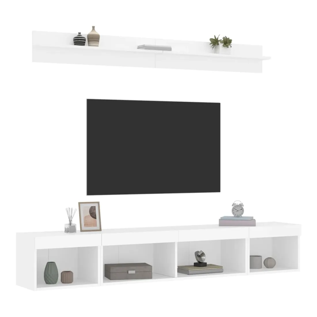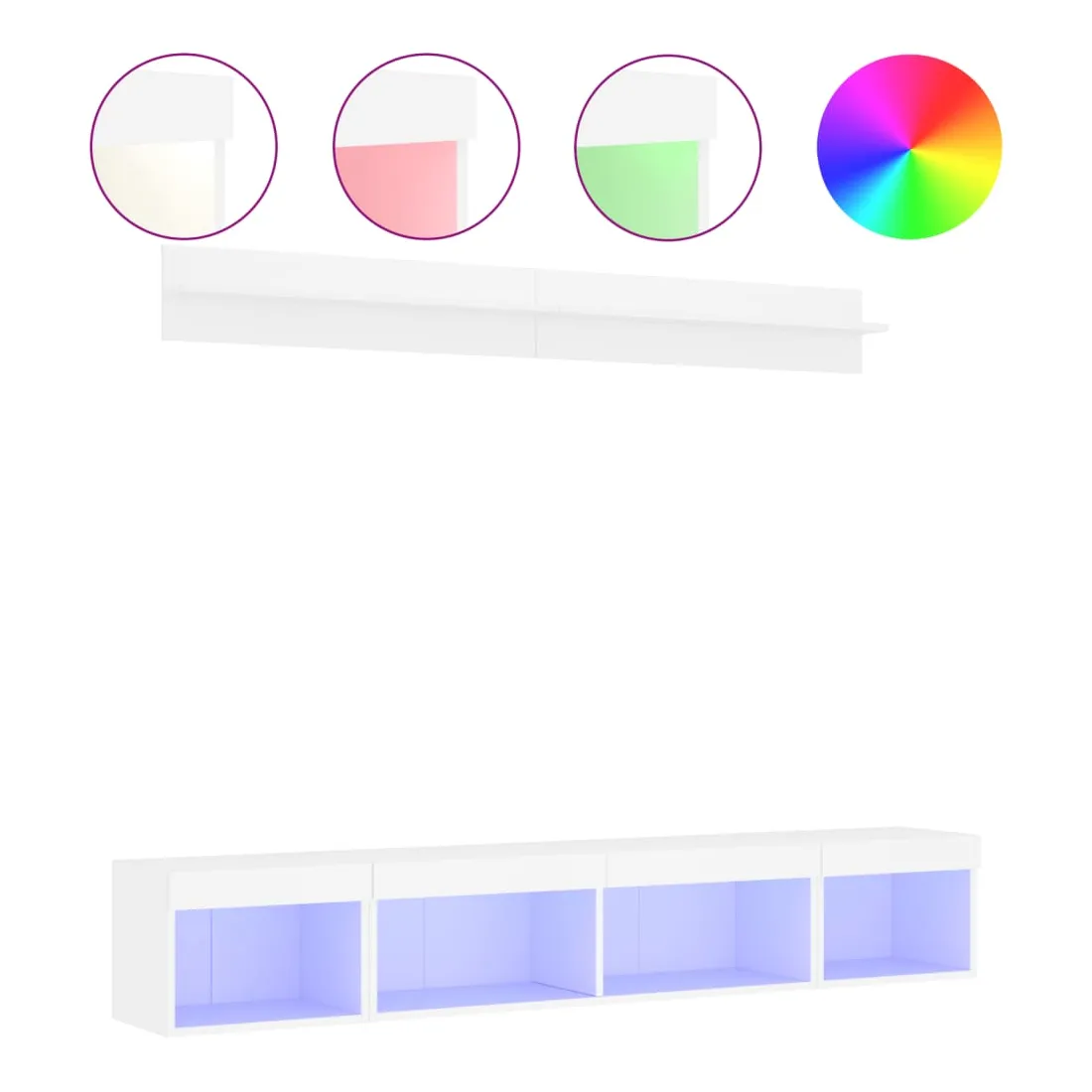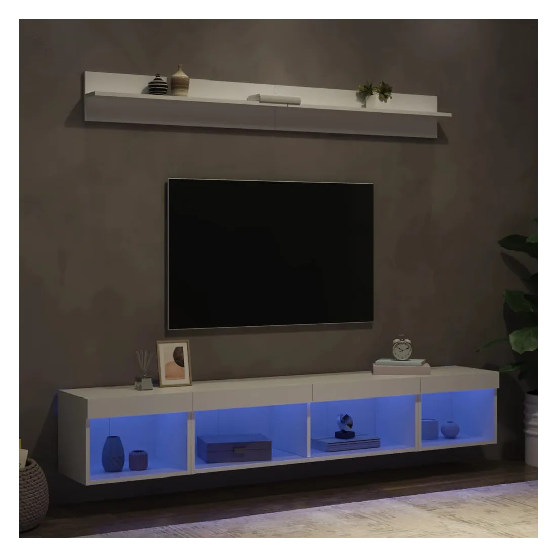 Ces unités murales TV sont la solution parfaite pour votre espace de vie afin de maximiser l'espace et de garder les surfaces au sol sans encombrement. Matériau robuste : le bois d'ingénierie est d'une qualité exceptionnelle avec une surface lisse et présente également résistance, stabilité et résistance à l'humidité.Lumières LED RVB : la unité TV est équipée de lumières LED RVB vibrantes. Avec divers menus personnalisables, vous pouvez changer sans effort la couleur des lumières et même les régler automatiquement. Ces lumières LED renforcent non seulement l'aspect contemporain du meuble TV flottant, mais aussi son attrait pour la mode.Design mural : le meuble de télévision peut être fixé au mur pour ajouter un espace de stockage supplémentaire. De cette façon, vous pouvez maximiser votre espace au sol et garder la zone propre.Grand espace de rangement : le meuble TV flottant est doté de différentes options de rangement, offrant ainsi un grand espace pour ranger vos objets quotidiens tels que les livres, les DVD, les accessoires multimédias et d'autres articles bien organisés et à portée de main.Design polyvalent : vous pouvez l'utiliser comme meuble TV ou le monter sur le mur du lieu de travail pour un rangement pratique des outils ou d'autres articles divers. De plus, il transforme un mur vide en un élément de décoration. Bon à savoir :Les vis et les chevilles pour l'intérieur du mur ne sont pas incluses. Nous vous conseillons de trouver et d'utiliser des vis et des chevilles adaptées spécifiquement à vos murs. Si vous n'êtes pas sûr, vous pouvez consulter un professionnel. Veuillez lire et suivre chaque étape des instructions.Ce produit est doté d'un connecteur USB qui nécessite une source d'alimentation USB de 5V certifiée (non incluse).