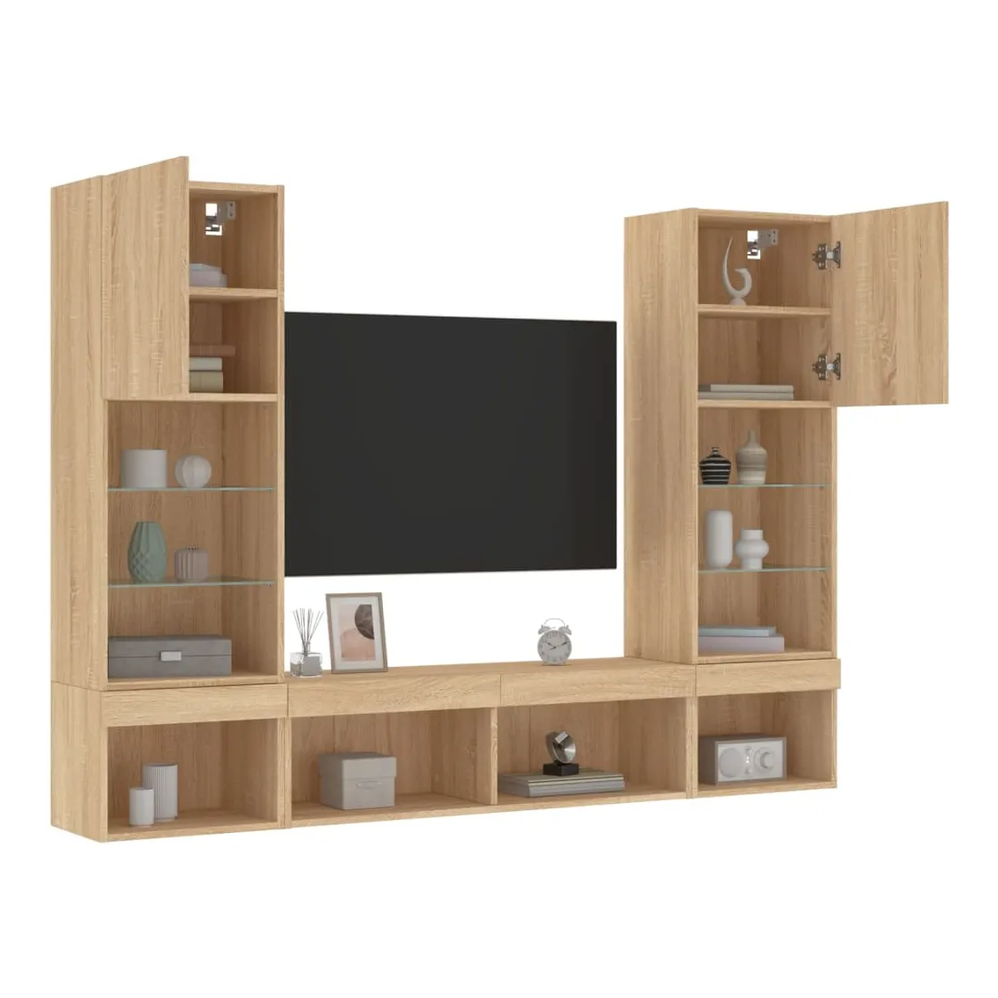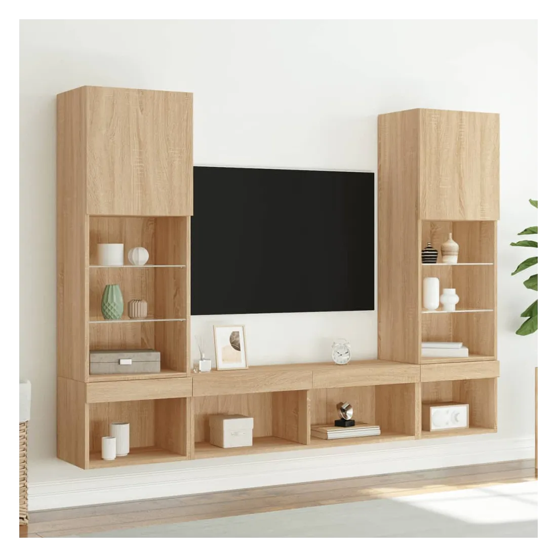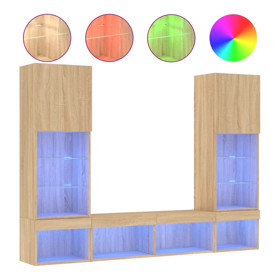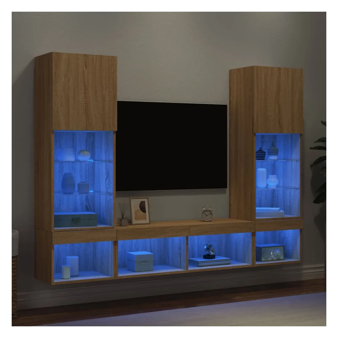 Ces unités murales TV sont la solution parfaite pour votre espace de vie afin de maximiser l'espace et de garder les surfaces au sol sans encombrement. Matériau robuste : le bois d'ingénierie est d'une qualité exceptionnelle avec une surface lisse et présente également résistance, stabilité et résistance à l'humidité.Lumières LED RVB : la unité TV est équipée de lumières LED RVB vibrantes. Avec divers menus personnalisables, vous pouvez changer sans effort la couleur des lumières et même les régler automatiquement. Ces lumières LED renforcent non seulement l'aspect contemporain du meuble TV flottant, mais aussi son attrait pour la mode.Design mural : le meuble de télévision peut être fixé au mur pour ajouter un espace de stockage supplémentaire. De cette façon, vous pouvez maximiser votre espace au sol et garder la zone propre.Grand espace de rangement : le meuble TV flottant est doté de différentes options de rangement, offrant ainsi un grand espace pour ranger vos objets quotidiens tels que les livres, les DVD, les accessoires multimédias et d'autres articles bien organisés et à portée de main.Design polyvalent : vous pouvez l'utiliser comme meuble TV ou le monter sur le mur du lieu de travail pour un rangement pratique des outils ou d'autres articles divers. De plus, il transforme un mur vide en un élément de décoration. Bon à savoir :Les vis et les chevilles pour l'intérieur du mur ne sont pas incluses. Nous vous conseillons de trouver et d'utiliser des vis et des chevilles adaptées spécifiquement à vos murs. Si vous n'êtes pas sûr, vous pouvez consulter un professionnel. Veuillez lire et suivre chaque étape des instructions.Ce produit est doté d'un connecteur USB qui nécessite une source d'alimentation USB de 5V certifiée (non incluse).