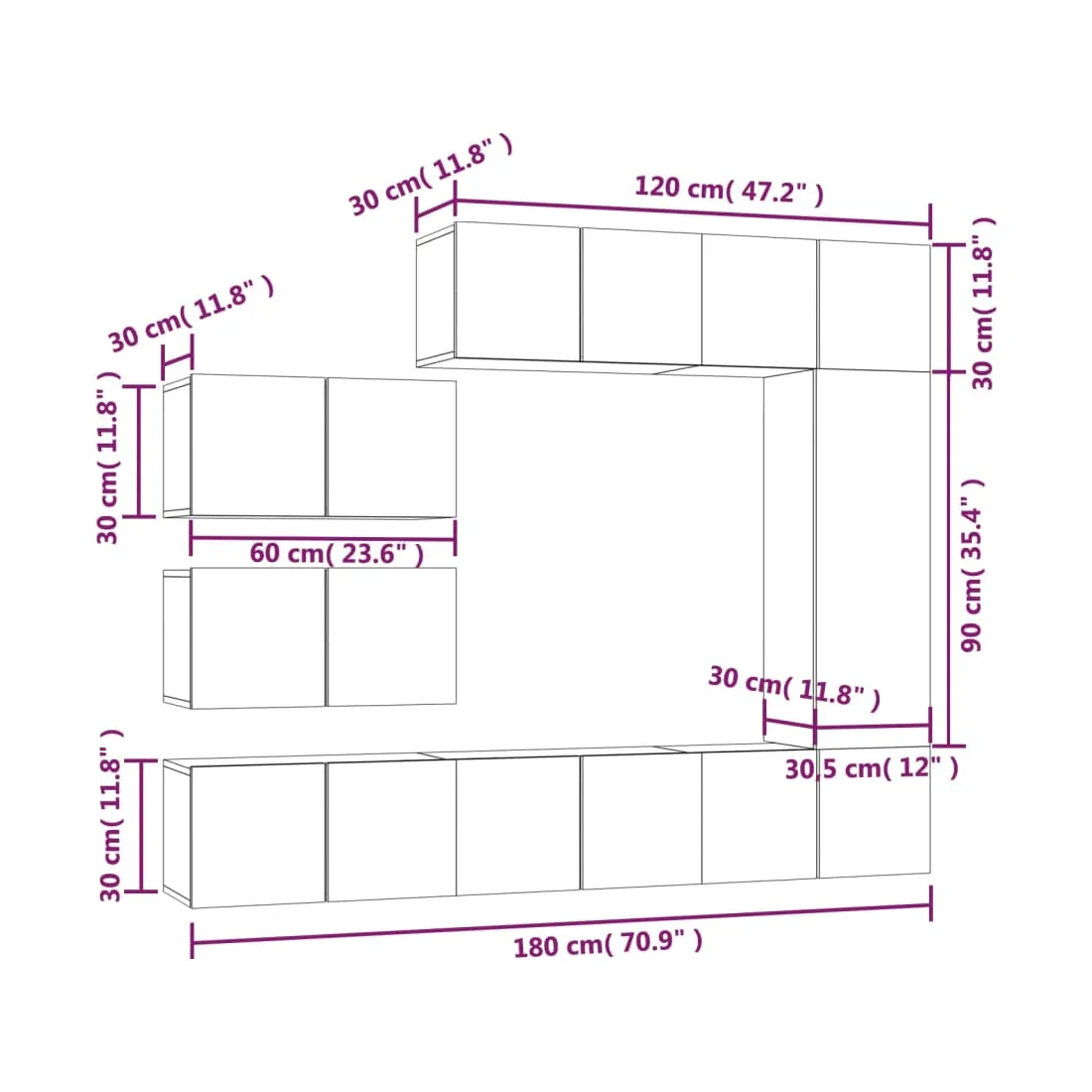 - Meuble TV (avec 1 porte) : 30,5 x 30 x 90 cm (l x P x H)