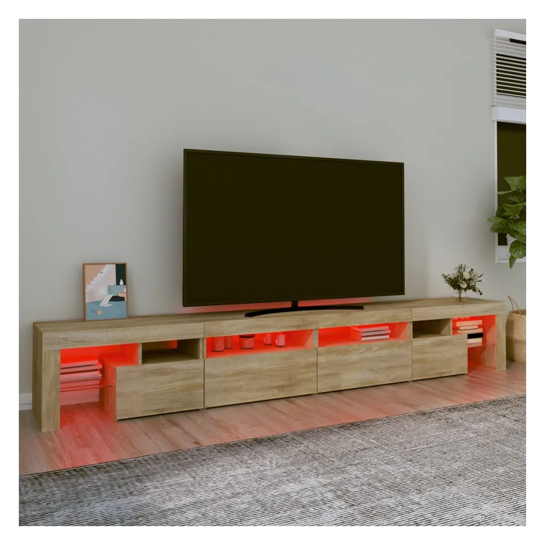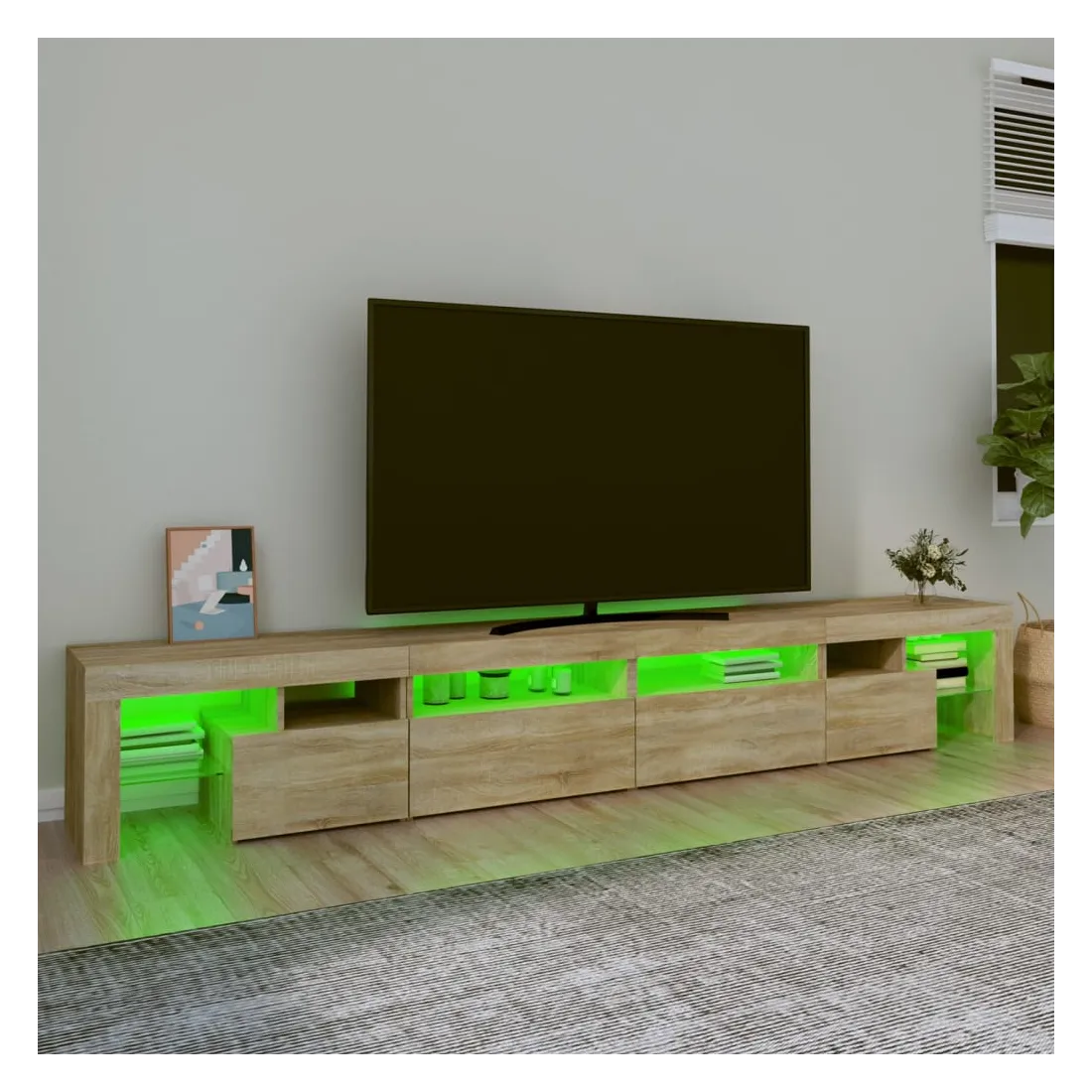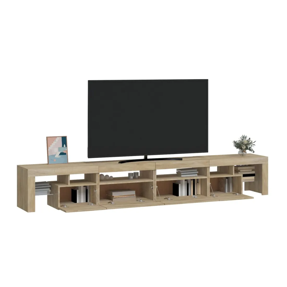 Avec un design à la fois tendance et pratique, ce meuble TV avec éclairage LED deviendra certainement un point central de votre pièce. Matériau pratique : le bois d'ingénierie est d'une qualité exceptionnelle avec une surface lisse et présente également résistance, stabilité et résistance à l'humidité. Lumières LED colorées : le meuble TV est doté de lumières LED RVB, qui ont différents menus pour changer la couleur des lumières et laisser la couleur s'ajuster automatiquement. Les lumières LED soulignent l'aspect moderne et contribuent à la sensation de tendance.Grand espace de rangement : le meuble TV offre un grand espace de rangement pour garder vos magazines, livres, télécommandes et autres petits objets bien organisés et à portée de main.Fonction d'affichage : le dessus robuste du meuble média est idéal pour exposer des objets décoratifs, des cadres photo et des plantes en pot. Remarque :Ce produit est doté d'un connecteur USB, mais la source d'alimentation certifiée de USB 5V n'est pas incluse.Chaque produit est livré avec un manuel de montage dans la boîte pour un montage facile.