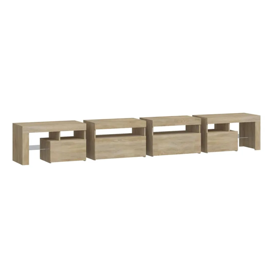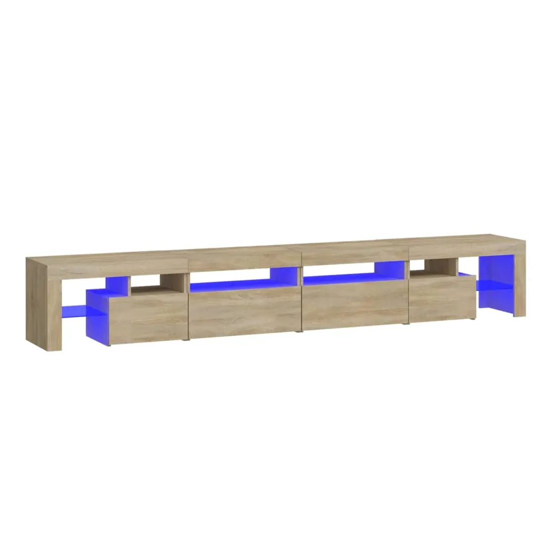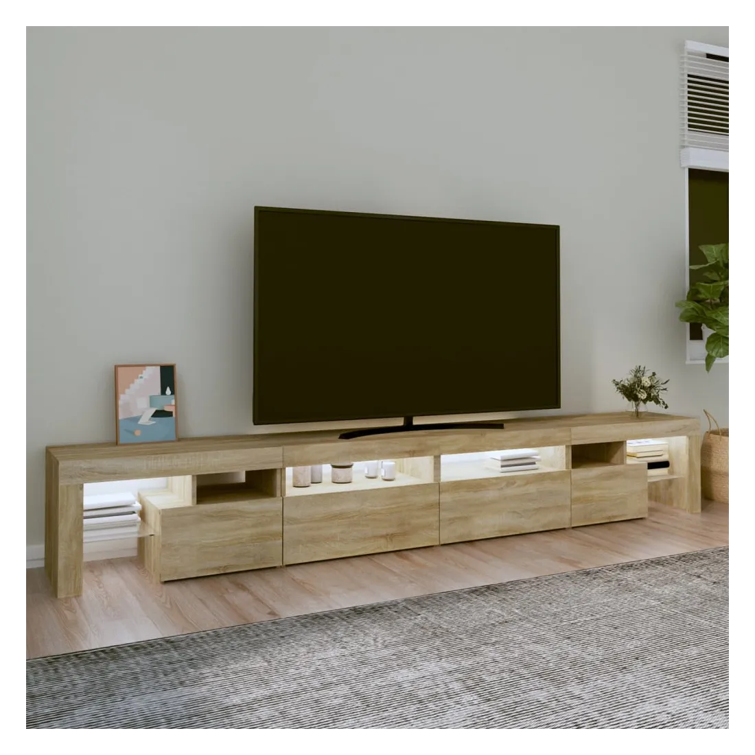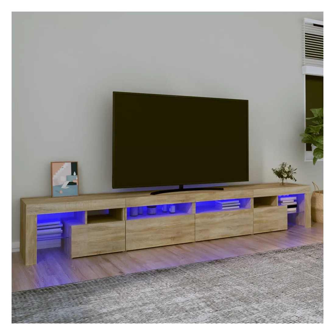 Avec un design à la fois tendance et pratique, ce meuble TV avec éclairage LED deviendra certainement un point central de votre pièce. Matériau pratique : le bois d'ingénierie est d'une qualité exceptionnelle avec une surface lisse et présente également résistance, stabilité et résistance à l'humidité. Lumières LED colorées : le meuble TV est doté de lumières LED RVB, qui ont différents menus pour changer la couleur des lumières et laisser la couleur s'ajuster automatiquement. Les lumières LED soulignent l'aspect moderne et contribuent à la sensation de tendance.Grand espace de rangement : le meuble TV offre un grand espace de rangement pour garder vos magazines, livres, télécommandes et autres petits objets bien organisés et à portée de main.Fonction d'affichage : le dessus robuste du meuble média est idéal pour exposer des objets décoratifs, des cadres photo et des plantes en pot. Remarque :Ce produit est doté d'un connecteur USB, mais la source d'alimentation certifiée de USB 5V n'est pas incluse.Chaque produit est livré avec un manuel de montage dans la boîte pour un montage facile.