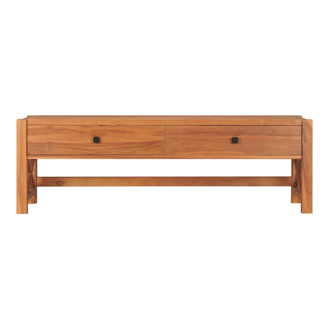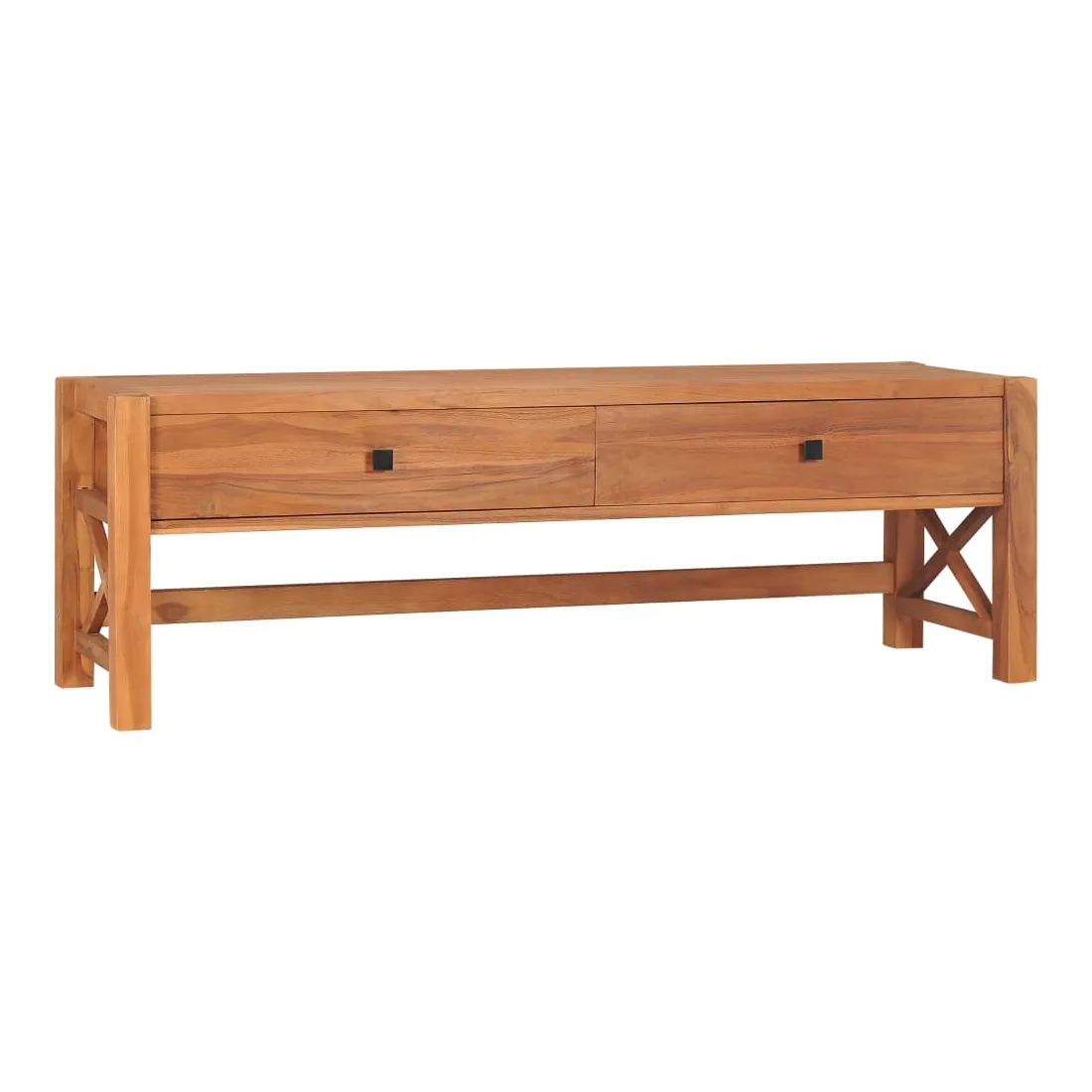Ce meuble TV en bois est un choix parfait pour apporter un charme rustique à votre espace de vie actuel. Ce meuble TV, construit à partir de bois de teck, est chevronné, séché au four et poncé pour lui donner un aspect très lisse. Le bois de teck est connu pour sa résistance exceptionnelle, ce qui le rend beaucoup plus adapté pour les meubles que tout autre type de bois. Ce meuble TV présente une couleur naturelle avec un dessus en bois dur robuste. Vous pouvez placer votre téléviseur, votre routeur, vos appareils multimédia ou afficher des objets décoratifs comme des cadres photo, des paniers de fruits ou des vases. Équipée de 2 tiroirs, cette armoire hifi en bois offre amplement d’espace pour garder toutes sortes de petits objets organisés et à portée de main. De plus, l'unité de télévision est durable et facile à nettoyer. Remarque importante : les couleurs et les grains peuvent varier d'une pièce à l'autre, rendant chaque meuble unique. La livraison est aléatoire, ce qui garantit l'exclusivité et l'individualité de votre produit.