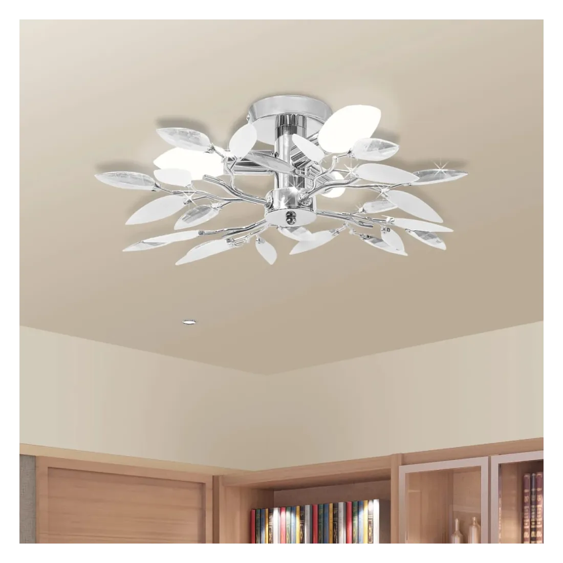 Ce magnifique plafonnier, avec quatre bras en forme de feuille d'acrylique, présente un design élégant. Sa finition chromée donne à ce plafonnier un style contemporain - parfait pour tout salon ou chambre à coucher moderne. Cette lampe peut être facilement montée sur n'importe quel plafond avec une base en métal de haute qualité. Une lumière merveilleuse passera à travers ces feuilles acryliques délicates, illuminant chaque coin de la pièce. Ce plafonnier exclusif garantit une ambiance relaxante et agréable. Cette lampe convient à trois ampoules E14. Veuillez noter que les ampoules ne sont pas incluses dans la livraison.