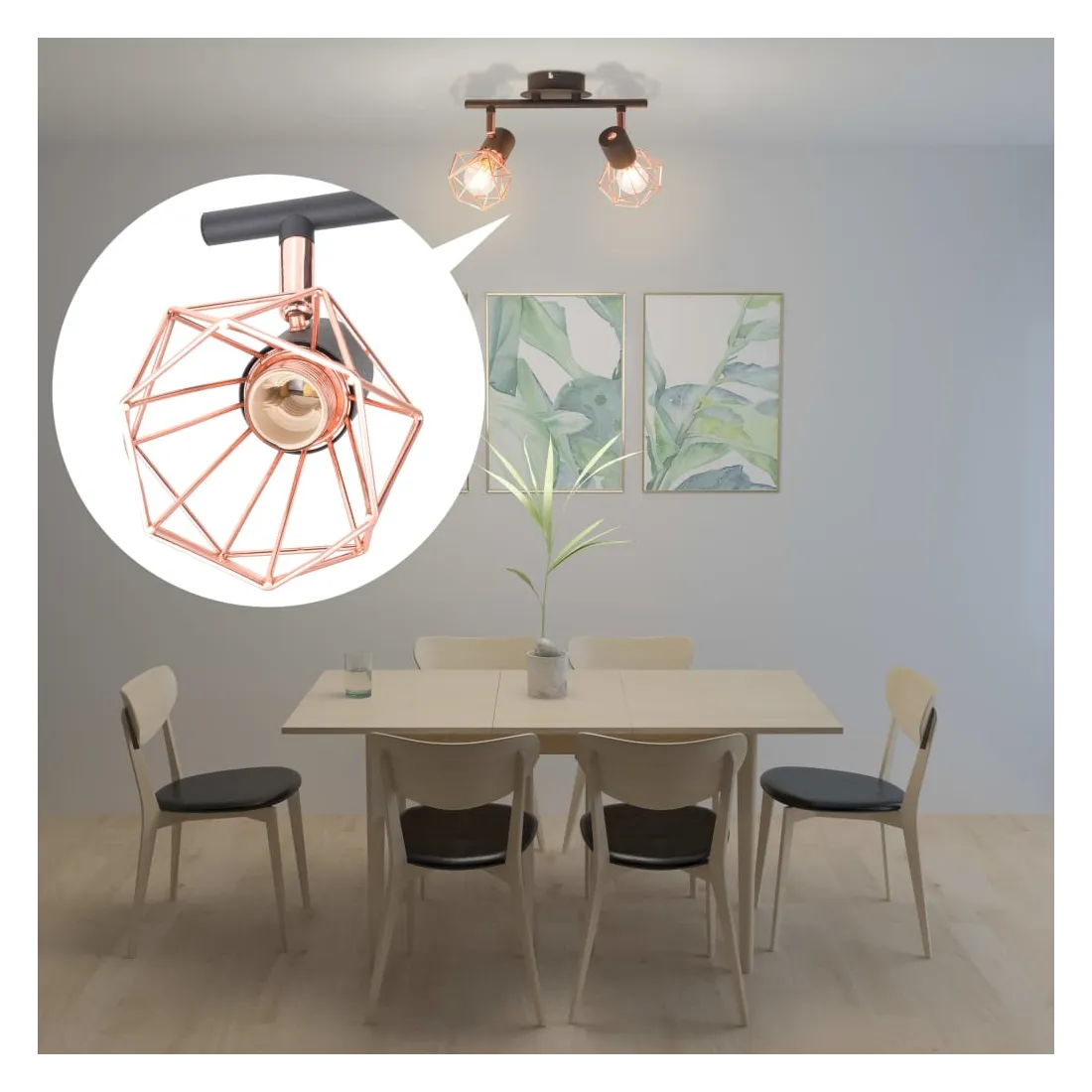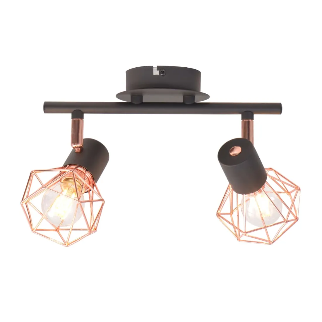 Ce plafonnier avec 2 projecteurs présente un design industriel et améliorera le look de n'importe quelle pièce. La lampe peut être facilement montée au mur ou au plafond grâce à sa base en métal noir de haute qualité. Les abats-jour des projecteurs uniques en fil de fer cuivré ajoutent à son style industriel et créent un effet agréable, lorsque la lumière est émise à travers eux pour éclairer chaque coin de la pièce. Cette lampe convient aux ampoules E14, mais veuillez noter que les ampoules ne sont pas incluses dans la livraison.