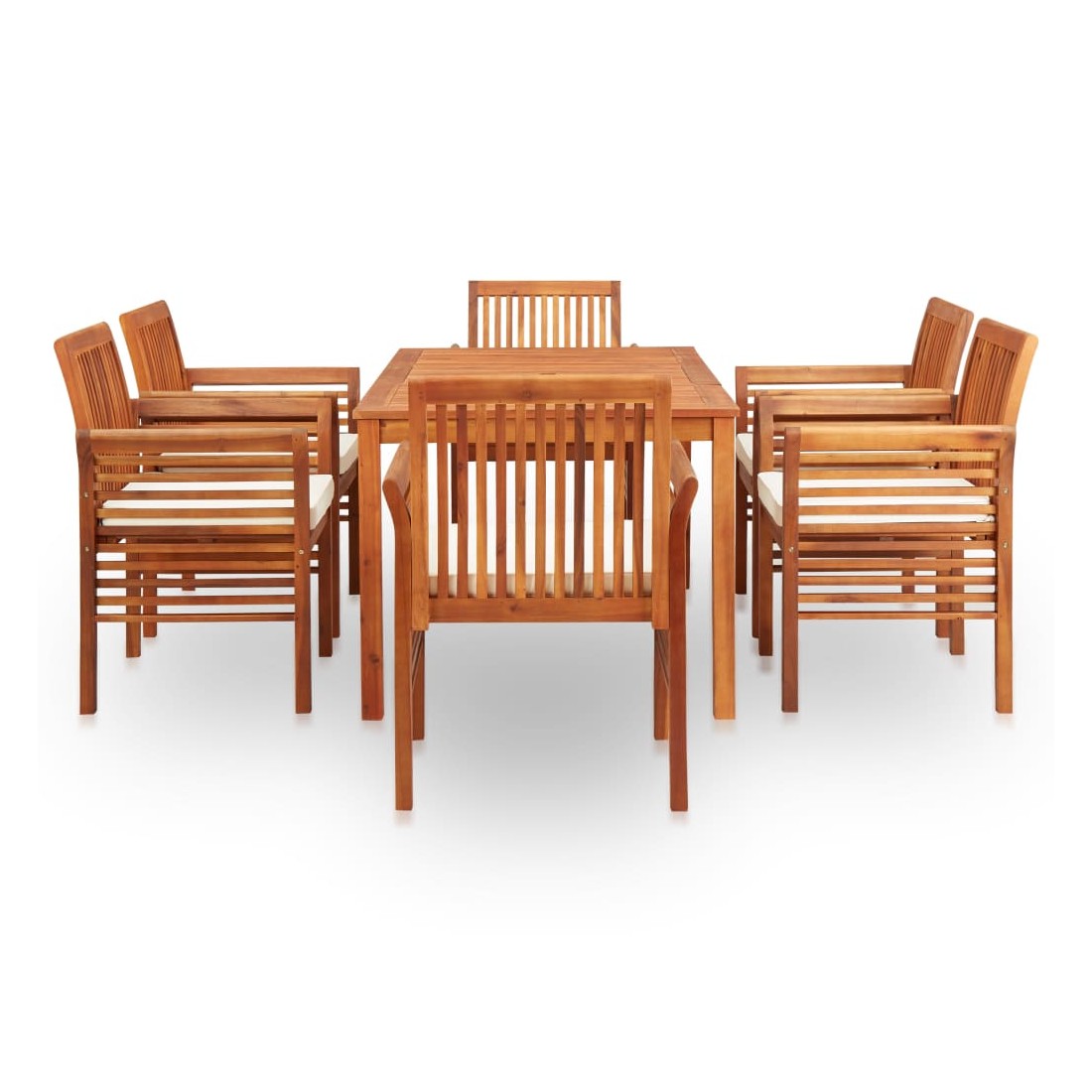 vidaXLDonnez à votre terrasse ou votre arrière-cour un bel aspect naturel avec notre ensemble de salle à manger de 7 pièces simple mais élégant. Vous pouvez facilement profiter d'un bon repas en plein air avec les membres de votre famille et vos amis ! La table et les chaises sont en bois d'acacia massif avec une finition à l'huile et ont un design à lattes, qui est résistant aux intempéries et adapté à une utilisation à l'extérieur. La surface à l'huile est également facile à nettoyer. Équipé de coussinets en mousse confortables, vous pouvez passer tous vos moments de détente à l'extérieur dans un grand confort. Lorsqu'il n'est pas utilisé, vous pouvez couvrir ou ranger l'appareil pour prolonger sa durée de vie. La livraison comprend 1 table et 6 chaises de salle à manger.