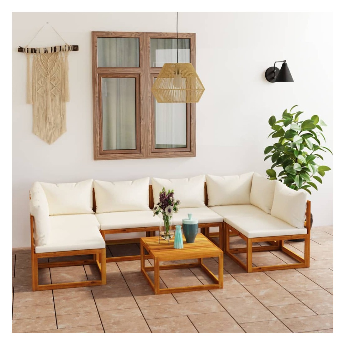 Ce mobilier de jardin compact et très confortable sera certainement le point central de votre terrasse, jardin ou patio. Bois d’acacia massif : doté d'un cadre en bois d'acacia massif, l'ensemble de canapé est solide, robuste et durable; et sa finition à l'huile rend l'ensemble de canapé adapté à une utilisation en extérieur.Coussins confortables : les coussins d'assise et de dossier amovibles sont épaississement rembourrés, afin d'offrir un grand confort d'assise.Table basse élégante : une table basse au design à lattes unique est également incluse.Conception modulaire : de plus, grâce à sa conception modulaire, toutes les pièces peuvent être arrangées et personnalisées selon vos besoins.