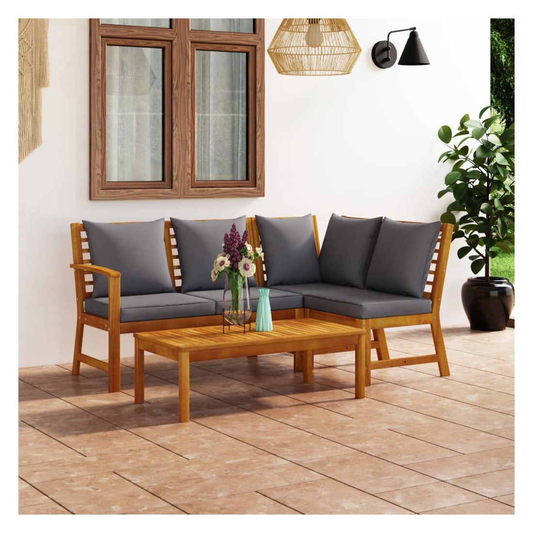 Cet ensemble de salon de jardin de 4 pièces sera un excellent supplément à votre espace de vie extérieur. Il ajoutera une touche d'élégance moderne à votre patio, balcon ou jardin avec son design élégant. Doté d’un cadre en bois d’acacia massif, l’ensemble de canapés est solide, robuste et durable; et sa finition à l'huile rend l’ensemble de canapés adapté à une utilisation à l'extérieur. Une table basse au design unique à lattes est également incluse. Vous pouvez mettre quelques collations, boissons, tasses à thé, livre, etc, sur la table basse et garder tous les essentiels à portée de main. Cet ensemble est livré avec des coussins d’assise et de dossier rembourrés très confortables. Les housses en polyester à faible entretien peuvent également être retirées et lavées. De plus, grâce à sa conception modulaire, toutes les pièces peuvent être disposées et personnalisées selon vos besoins.