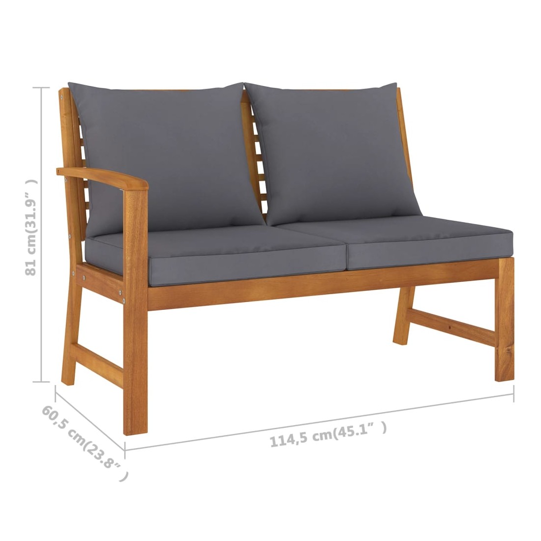 • Banc à 2 places avec dimensions des bras à droite : 114,5 x 60,5 x 81 cm (l x P x H)