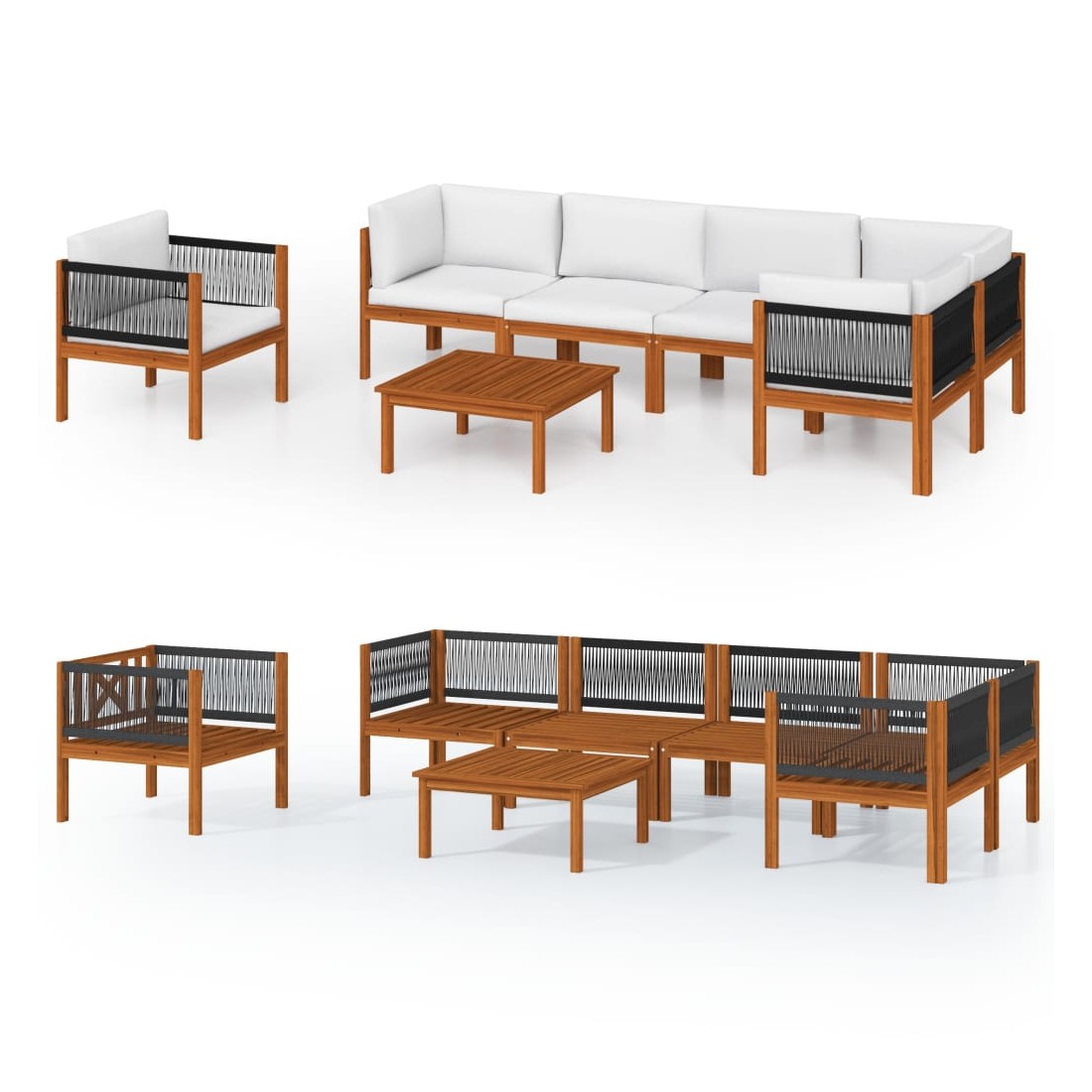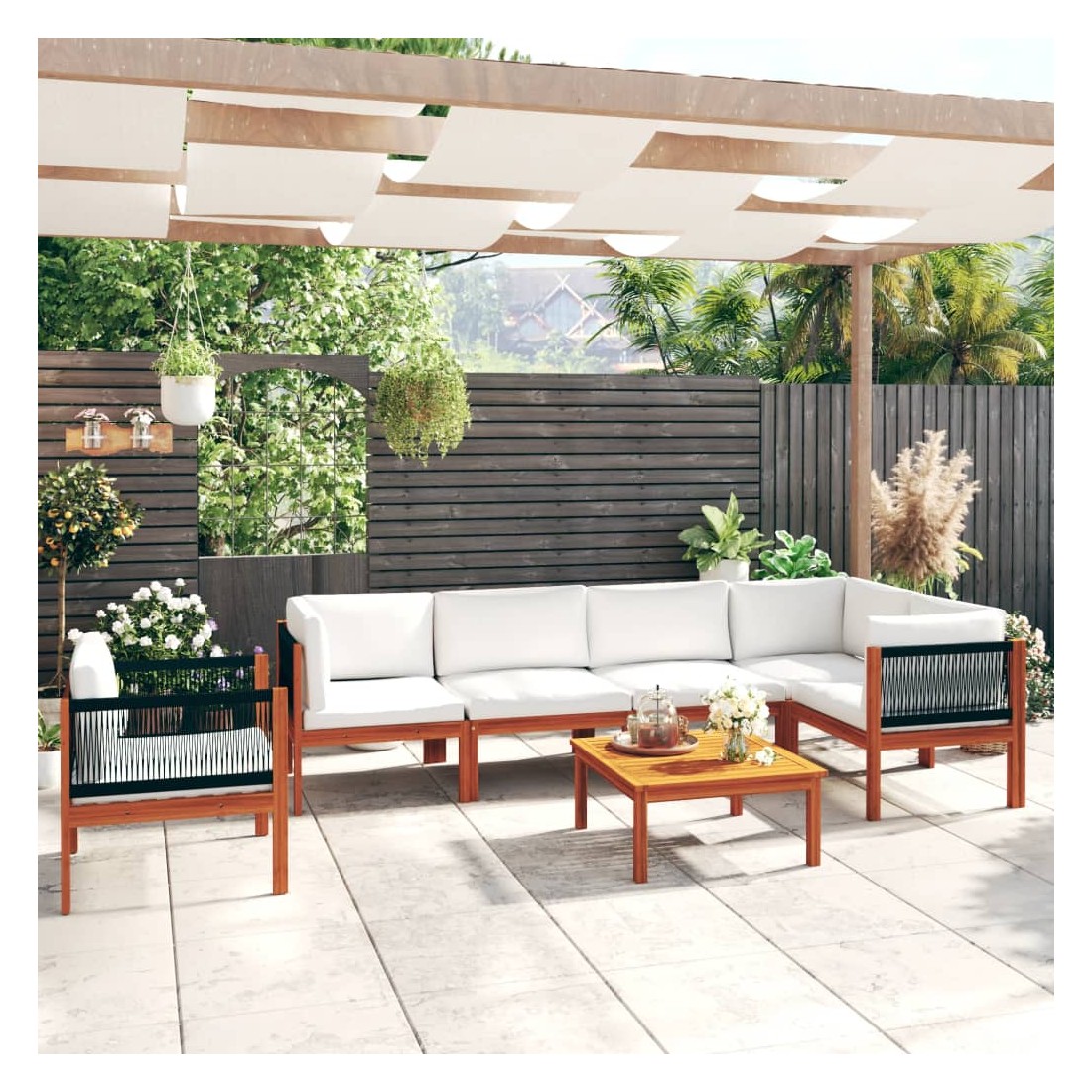 Ce salon de jardin avec dossiers en corde tressée sera idéal pour vous détendre et profiter du beau temps, faire une sieste ou discuter en famille ou entre amis. Avec son design intemporel, ce salon en bois apportera une touche de charme rustique à votre terrasse, jardin ou salon. Ce canapé de jardin est doté de dossiers en corde finement travaillés, ajoutant une touche sophistiquée à tout espace extérieur. Cet ensemble de jardin est fabriqué en bois d'acacia massif de haute qualité, un bois dur tropical résistant aux intempéries et très durable. Grâce à sa finition à l'huile, ce salon de jardin arbore une couleur chaleureuse et est facile à nettoyer et à entretenir. De plus, la livraison comprend des coussins d'assise et de dossier épais pour un confort optimal.