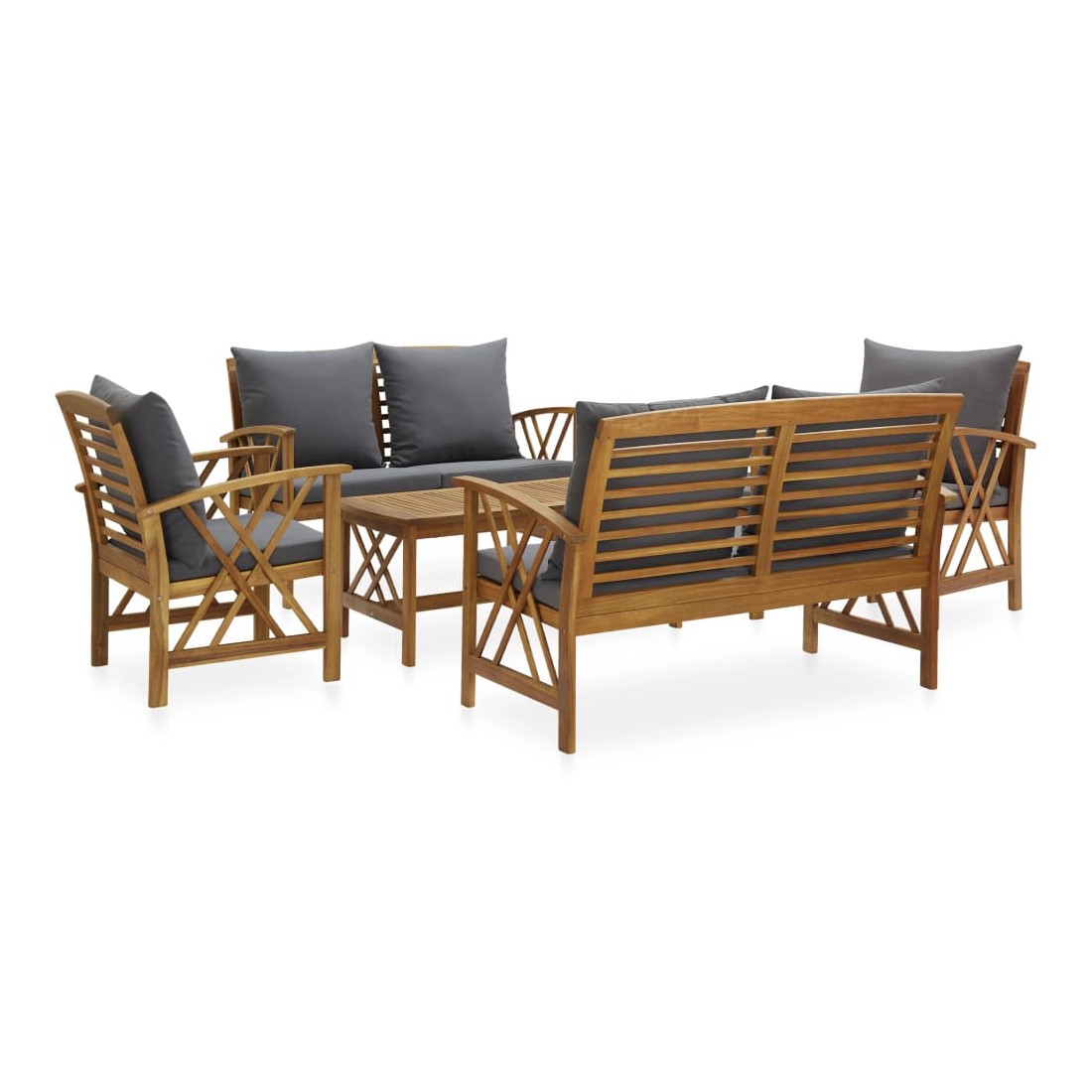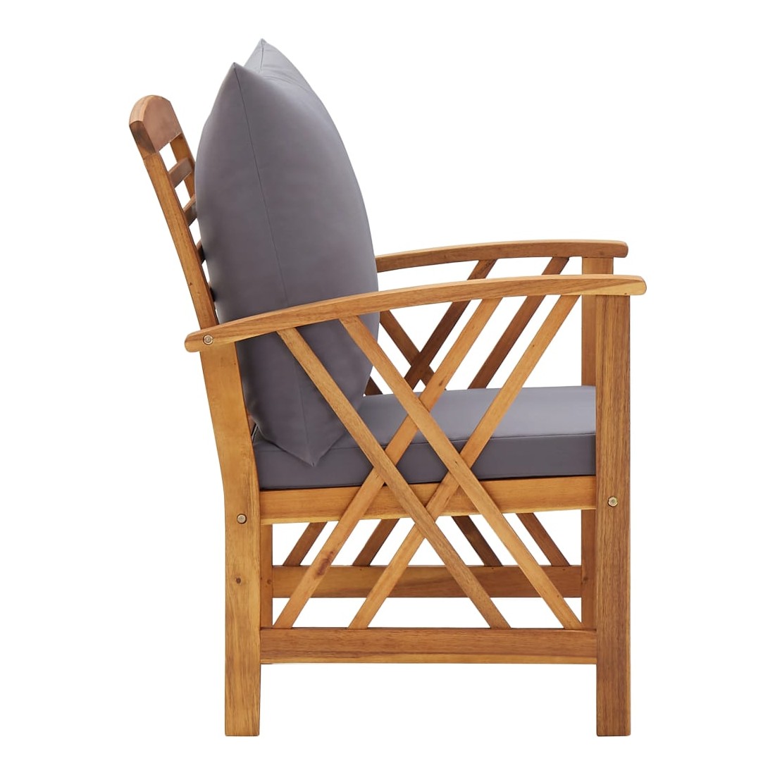 L'ensemble de salon de jardin en bois ajoute un look vintage et est spécialement conçu pour votre jardin, patio ou autre espace de vie extérieur ! Matériau durable : l’ensemble de meubles d’extérieur est construit en bois d'acacia massif avec une finition à l’huile, ce qui le rend stable et durable. Dessus de table à lattes : grâce au dessus de table en bois massif au design à lattes, la table basse vous offre de l’espace pour mettre vos collations, paniers de fruits, objets décoratifs, ainsi que d’autres essentiels. Expérience d’assise confortable : le dossier légèrement incurvé et les accoudoirs ajoutent au confort d'assise. Les coussins d'assise et de dossier épais rendent l'ensemble agréable à l'assise. Bon à savoir :Chaque article est unique, avec des variations de couleurs et de grains. La livraison est aléatoire, ce qui garantit l'exclusivité et l'individualité de votre produit.