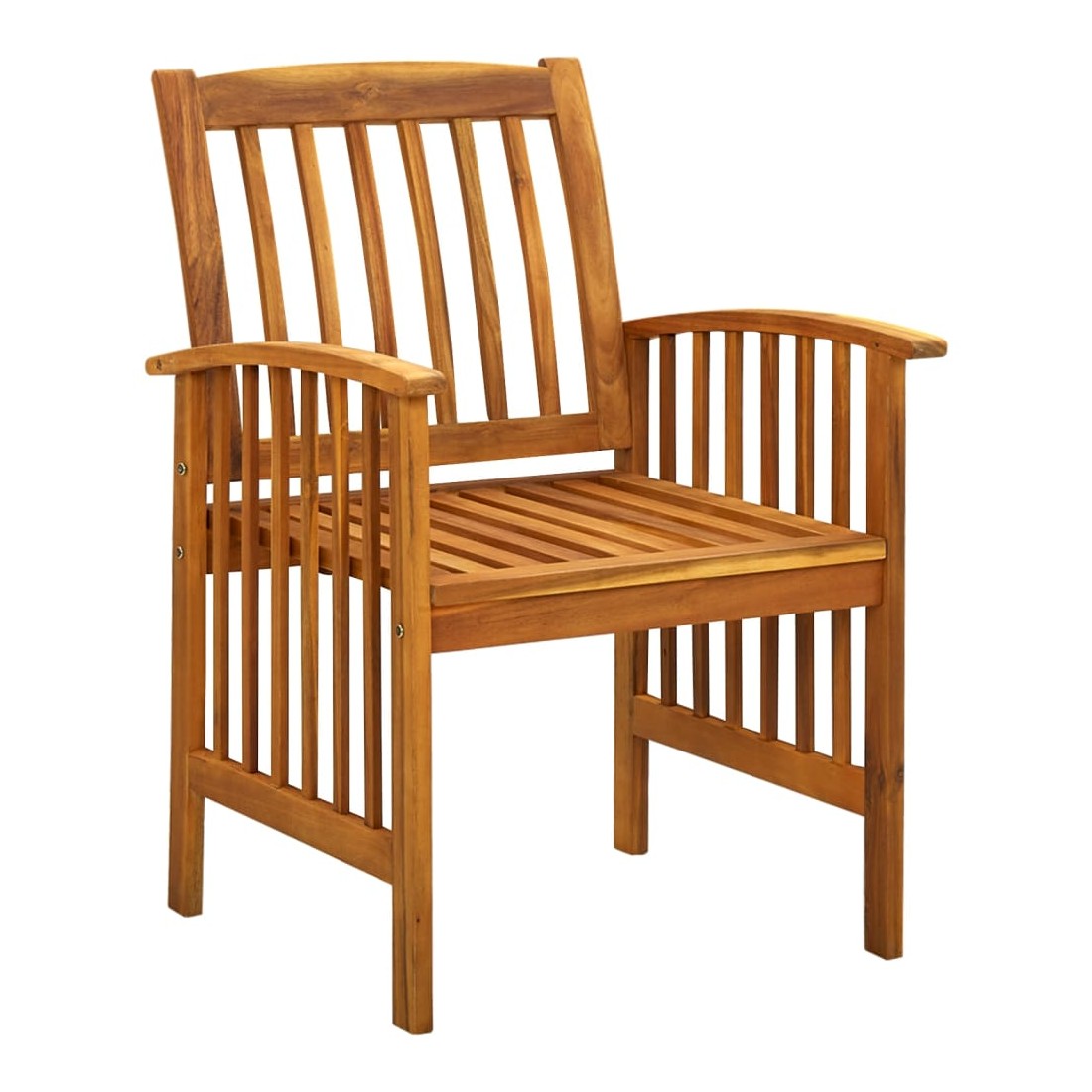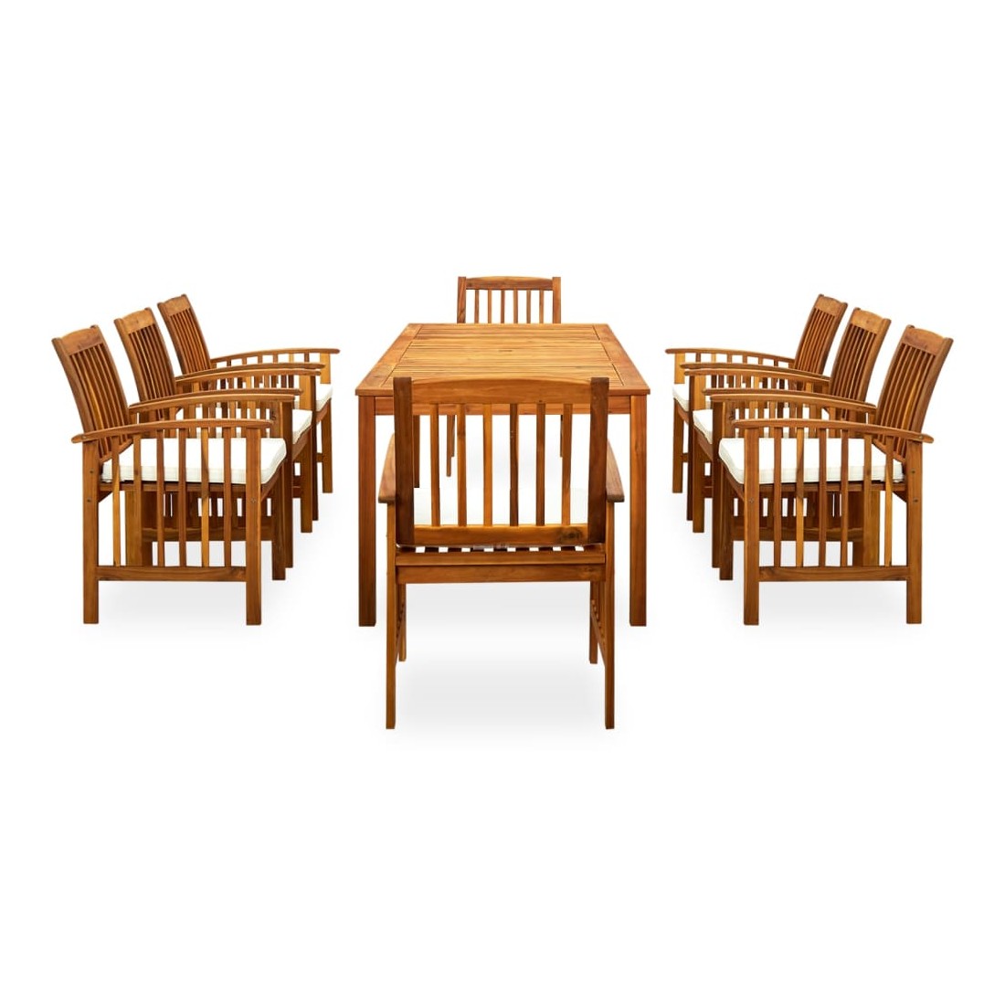 Créez une esthétique convaincante et uniforme dans votre espace extérieur avec cet ensemble de salle à manger de jardin ! La table de salle à manger est en bois d'acacia massif, un bois dur aux grains denses, ce qui la rend robuste, durable et facile à entretenir. Le dessus en bois peut être utilisé pour placer des aliments, des boissons et d'autres articles. Dotées d'un cadre en bois avec une finition à l'huile, ces chaises de salle à manger apportent un look classique à votre terrasse ou à votre arrière-cour tout en donnant à votre espace extérieur une sensation naturelle. Les coussins bien rembourrés ajoutent également un confort d'assise supplémentaire pendant votre temps de détente. De plus, cet ensemble est facile à nettoyer avec un chiffon humide. Remarque : afin de prolonger la