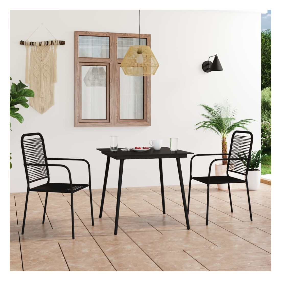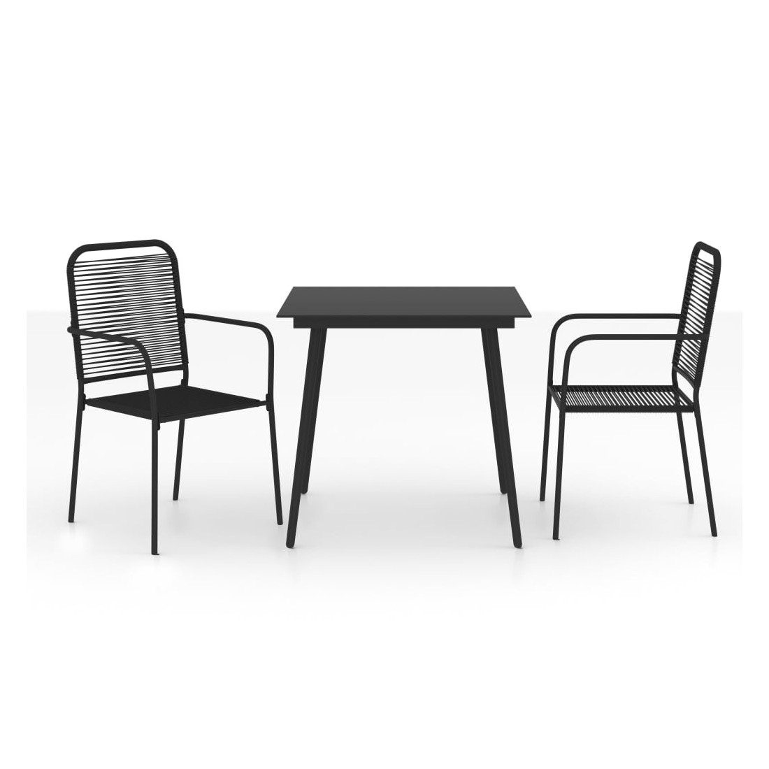 Cet ensemble de mobilier de salle à manger de 3 pièces au design élégant et aux lignes épurées sera un excellent choix pour votre jardin, patio, terrasse, ainsi que pour la cuisine et les salles à manger. L’élégance simple de cet ensemble de salle à manger rendra votre dîner quotidien spécial. Le dossier et l'assise sont en corde de coton torsadée, douce au toucher et robuste pour une utilisation à long terme. Cet ensemble de salle à manger de jardin comprend un cadre en acier enduit de poudre, ce qui rend la table et les chaises stables et durables. De plus, la table est dotée d'un dessus de table en verre trempé, facile à nettoyer.