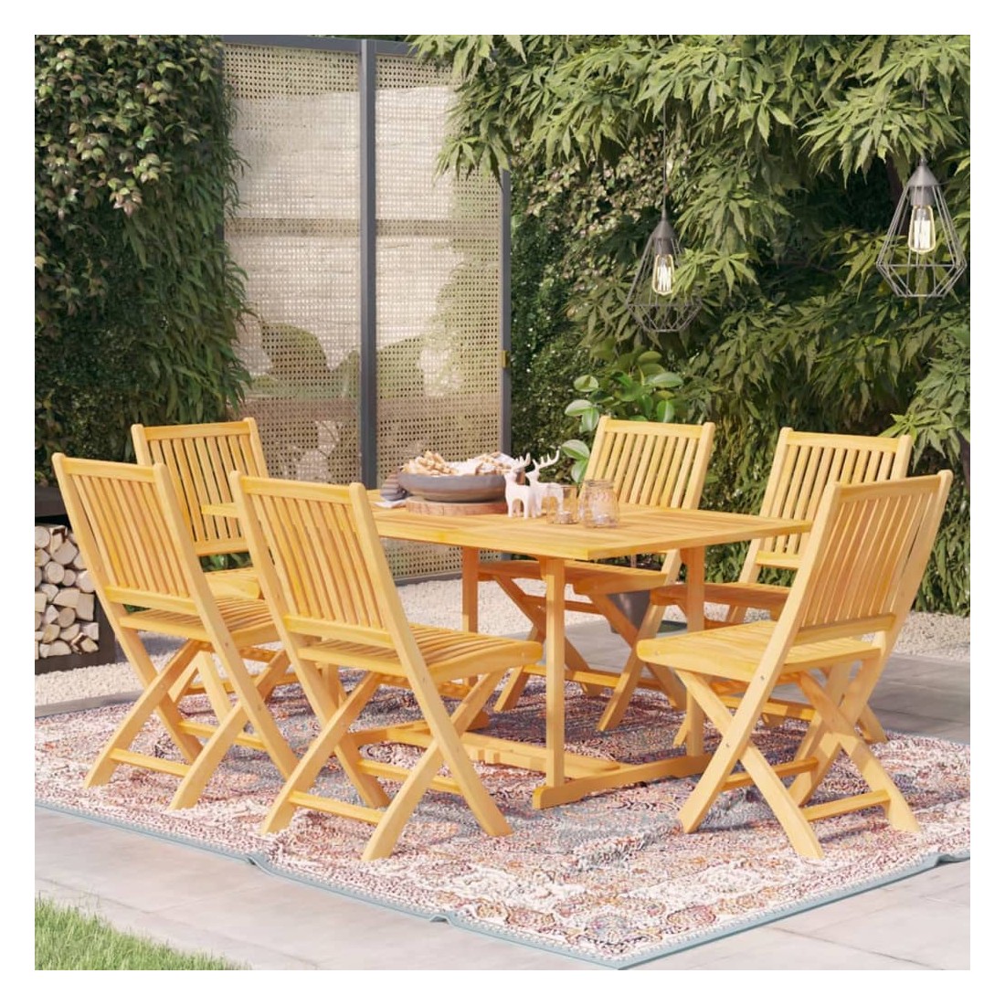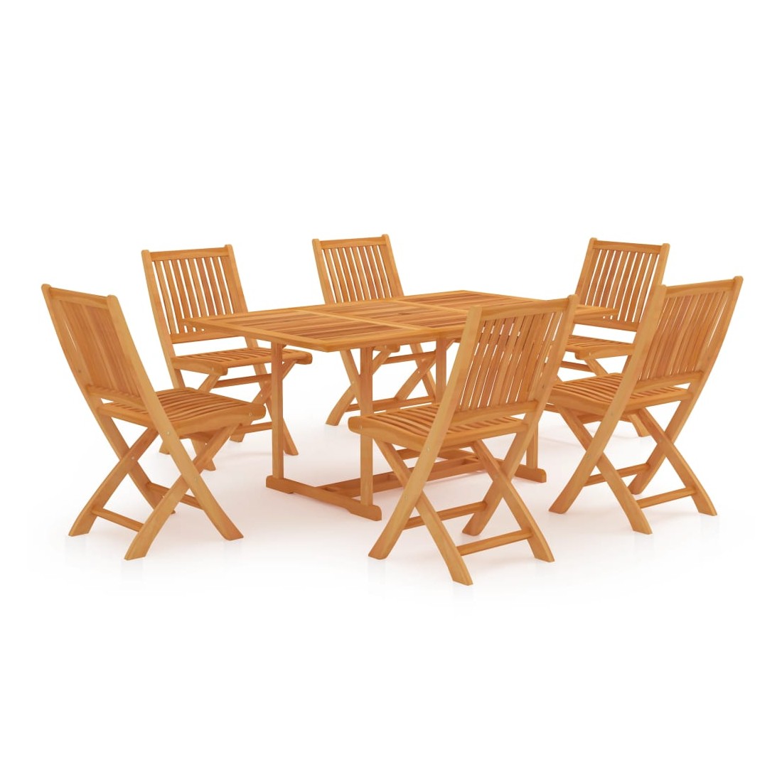 Cet ensemble de jardin en bois est parfait pour vos repas ou pour vous détendre dans le jardin ou sur le patio. Il est également idéal pour une utilisation à l'intérieur. Fabriquée en bois dur de teck extrêmement durable, cette pièce de meuble en teck a été chevronnée, séchée au four puis finement poncée pour lui donner un aspect très lisse. Le bois de teck est connu pour sa résistance exceptionnelle aux intempéries, ce qui le rend bien plus adapté aux meubles de jardin que tout autre type de bois. Le bois de teck est le choix idéal si vous souhaitez acheter une pièce de meubles de jardin durable. L’ensemble est appliqué avec une belle finition pour donner au bois une couleur chaude. La table comprend un trou pour un parasol afin de vous protéger du soleil. Les sièges et les dossiers incurvés des chaises peuvent bien s’adapter à votre corps. Avec un design pliable, les chaises peuvent être pliées pour économiser de l’espace lorsqu'elles ne sont pas utilisées. Elles sont également légères et faciles à déplacer. L’ensemble de meubles vous offre un confort et une grande commodité pour passer du temps avec votre famille et vos amis. De plus, cet ensemble est également facile à nettoyer avec un chiffon humide.