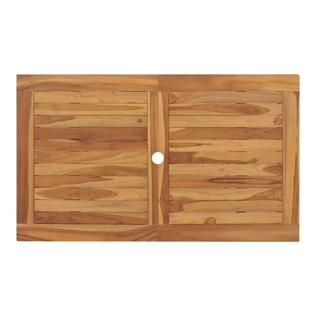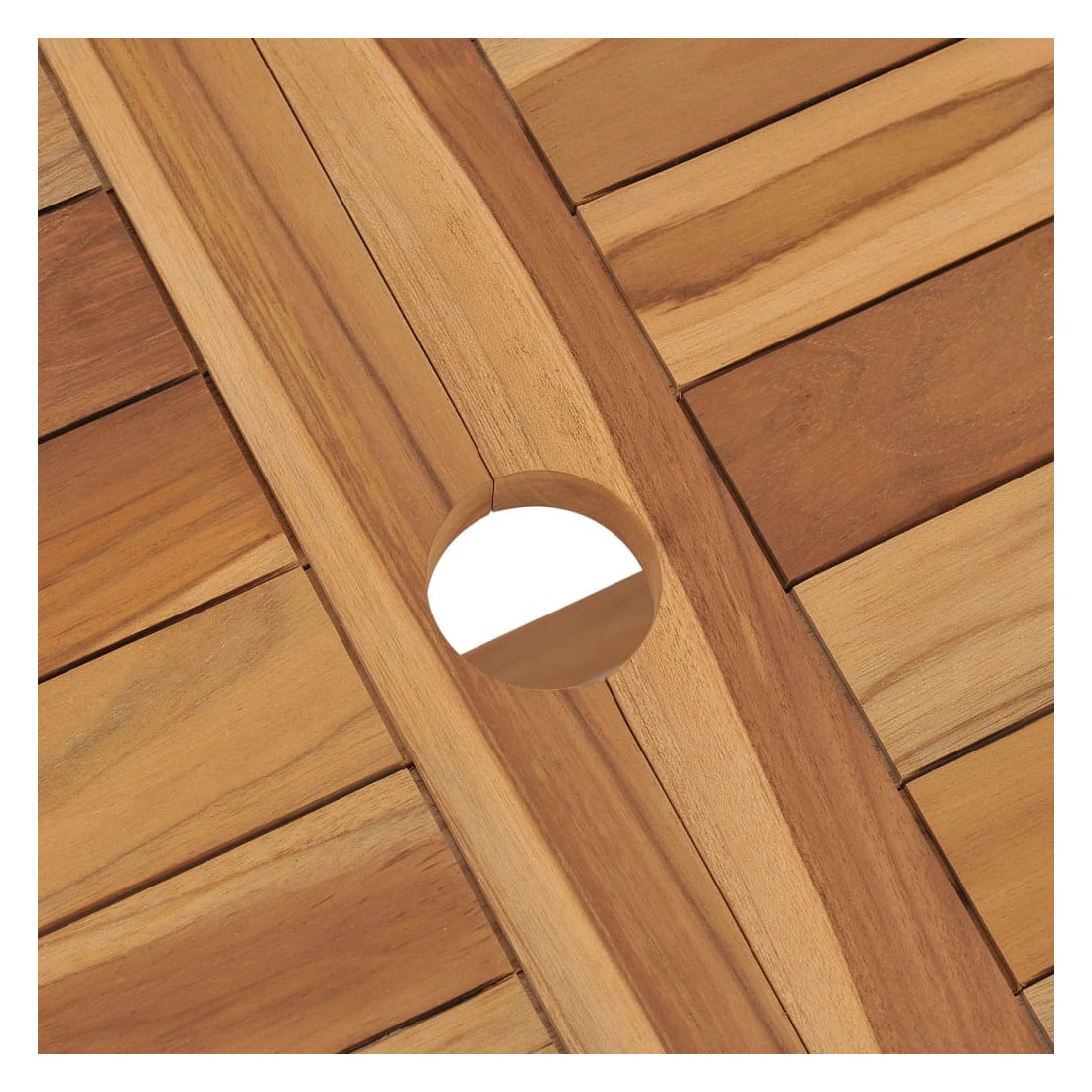 Cet ensemble de salle à manger de jardin en bois tendance est parfait pour votre camping en plein air ou le pique-nique. Cet ensemble est sûrement pratique lorsque de l’espace supplémentaire est nécessaire. Fabriquée en bois dur de teck extrêmement durable, cette pièce de meuble en teck a été chevronnée, séchée au four puis finement poncée pour lui donner un aspect très lisse. Le bois de teck est connu pour sa résistance exceptionnelle aux intempéries, ce qui le rend bien plus adapté aux meubles de jardin que tout autre type de bois. Le bois de teck est le choix idéal si vous souhaitez acheter une pièce de meubles de jardin durable. De plus, ils résistent également à l’humidité et aux insectes. L’ensemble est appliqué avec une belle finition pour donner au bois une couleur chaude. Grâce à son design unique, le parasol peut être monté au milieu de la table pour offrir une protection contre le soleil. La table et les chaises peuvent être facilement repliées lorsqu'elles ne sont pas utilisées. Elles vous offrent un confort et une grande commodité pour passer du temps avec votre famille et vos amis. En outre, cet ensemble est également facile à nettoyer avec un chiffon humide.