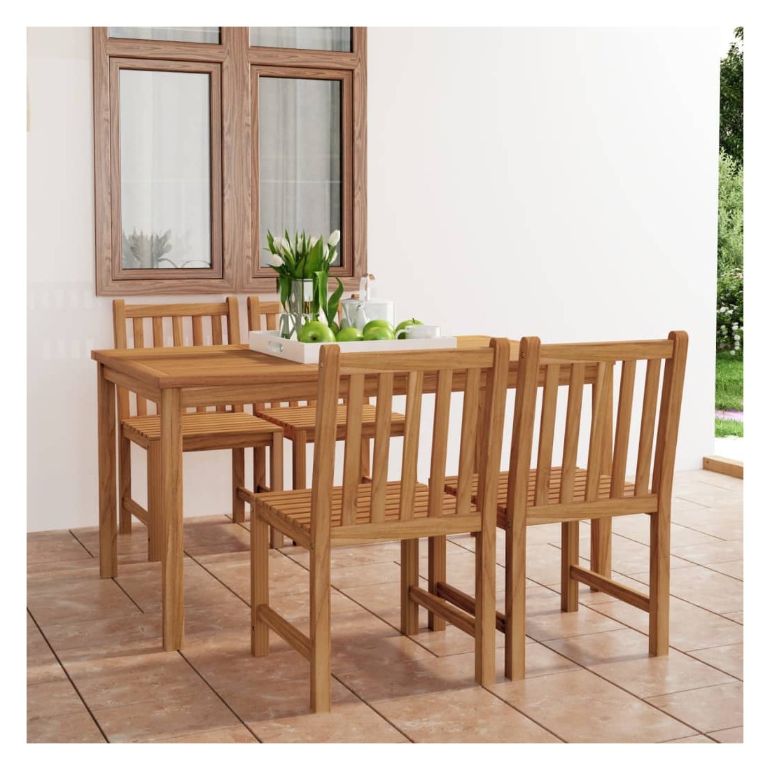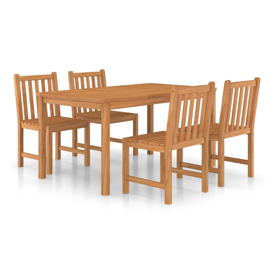 Cet ensemble de salle à manger de jardin en bois ajoute une touche de charme naturel à votre cuisine, jardin ou terrasse. Fabriquée en bois dur de teck extrêmement durable, cette pièce de meuble en teck a été chevronnée, séchée au four puis finement poncée pour lui donner un aspect très lisse. Le bois de teck est connu pour sa résistance exceptionnelle aux intempéries, ce qui le rend bien plus adapté aux meubles de jardin que tout autre type de bois. Le bois de teck est le choix idéal si vous souhaitez acheter une pièce de meubles de jardin durable. Une belle finition à base d'eau est appliquée pour donner au bois une couleur chaude. Grâce au dessus de table extra épais et aux grands pieds, cette table en bois solide est très durable et peut accueillir confortablement vos invités. Les chaises ont un look raffiné qui peut s'intégrer instantanément dans n'importe quel espace de vie. Avec sa fonction de résistance à l'eau et son aspect classique, vous pouvez placer cet ensemble de meubles partout autour de votre maison - à l'intérieur ou à l'extérieur !