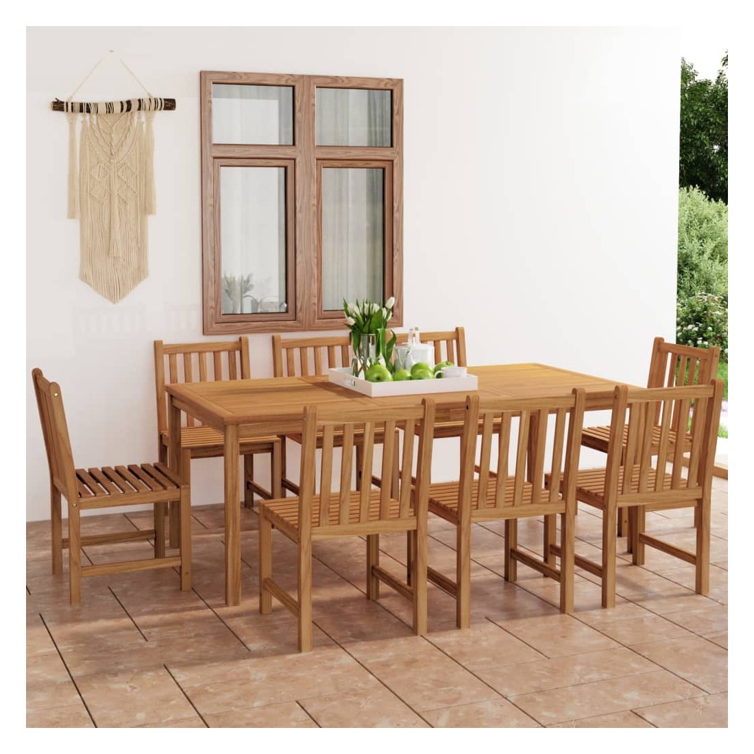 Cet ensemble de salle à manger de jardin en bois ajoute une touche de charme naturel à votre cuisine, jardin ou terrasse. Fabriquée en bois dur de teck extrêmement durable, cette pièce de meuble en teck a été chevronnée, séchée au four puis finement poncée pour lui donner un aspect très lisse. Le bois de teck est connu pour sa résistance exceptionnelle aux intempéries, ce qui le rend bien plus adapté aux meubles de jardin que tout autre type de bois. Le bois de teck est le choix idéal si vous souhaitez acheter une pièce de meubles de jardin durable. Une belle finition à base d'eau est appliquée pour donner au bois une couleur chaude. Grâce au dessus de table extra épais et aux grands pieds, cette table en bois solide est très durable et peut accueillir confortablement vos invités. Les chaises ont un look raffiné qui peut s'intégrer instantanément dans n'importe quel espace de vie. Avec sa fonction de résistance à l'eau et son aspect classique, vous pouvez placer cet ensemble de meubles partout autour de votre maison - à l'intérieur ou à l'extérieur !