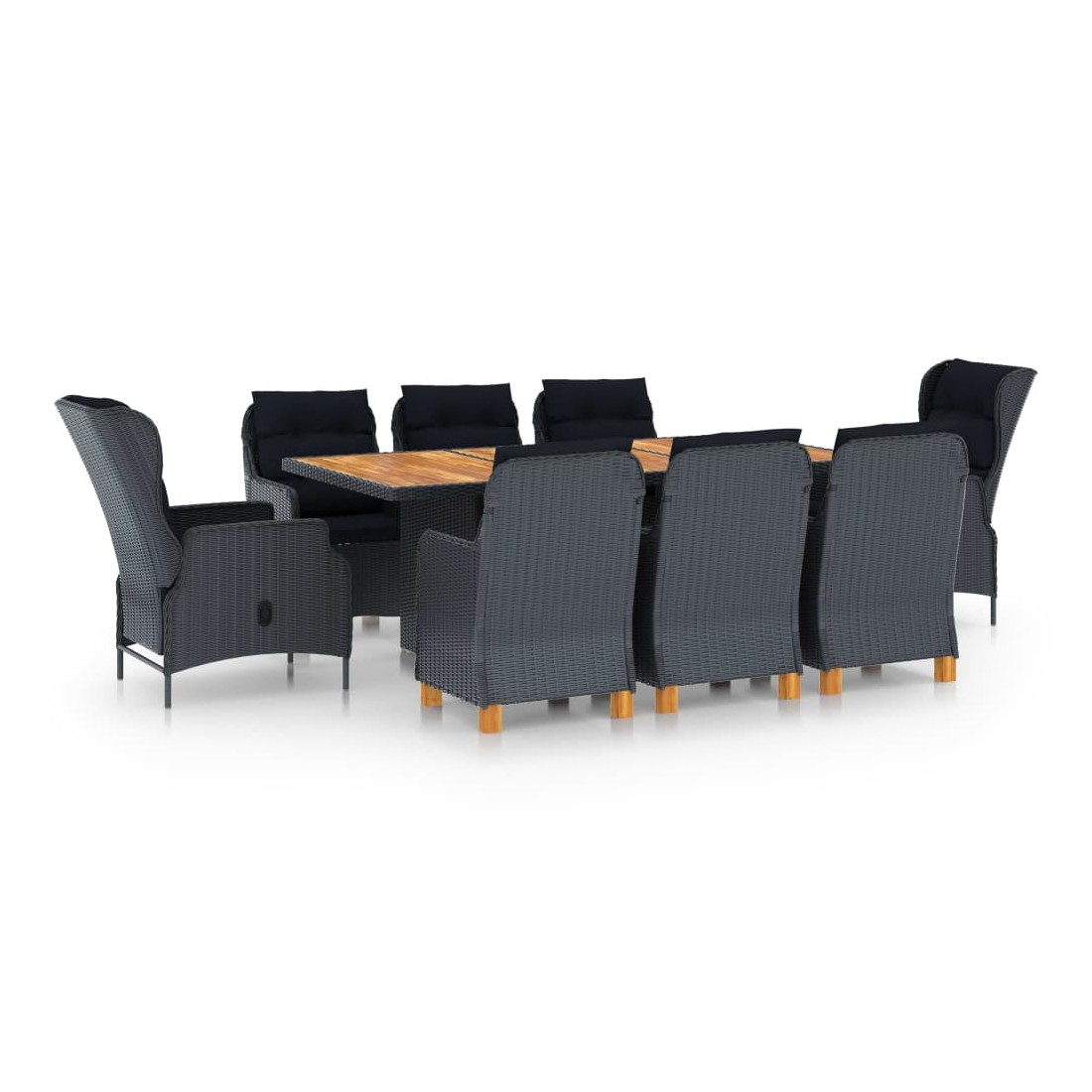 Cet ensemble à manger d'extérieur est une combinaison parfaite de style et de fonctionnalité et est destiné à être le point de mire de votre jardin, balcon ou patio. L’ensemble de meubles est fait de résine tressée ronde légère et peu exigeante d’entretien, ce qui le rend parfait pour une utilisation à l'extérieur, facile à nettoyer avec un chiffon humide. Grâce à sa structure en acier enduit de poudre, les chaises et la table sont stables et durables. Le dessus de table en bois massif est parfait pour dîner ou placer des objets décoratifs. Les coussins bien rembourrés ajoutent du confort supplémentaire pendant votre temps de détente. La housse de coussin est équipée d'une fermeture éclair, amovible et lavable. Grâce au mécanisme de levage à gaz, le dossier de la chaise inclinable est également réglable pour s’adapter à vos positions. En appuyant sur le bouton sur le côté, le dossier peut s’incliner, pour une position couchée confortable. Remarque : Nous vous recommandons de couvrir l'ensemble pendant la pluie, la neige ou le gel.