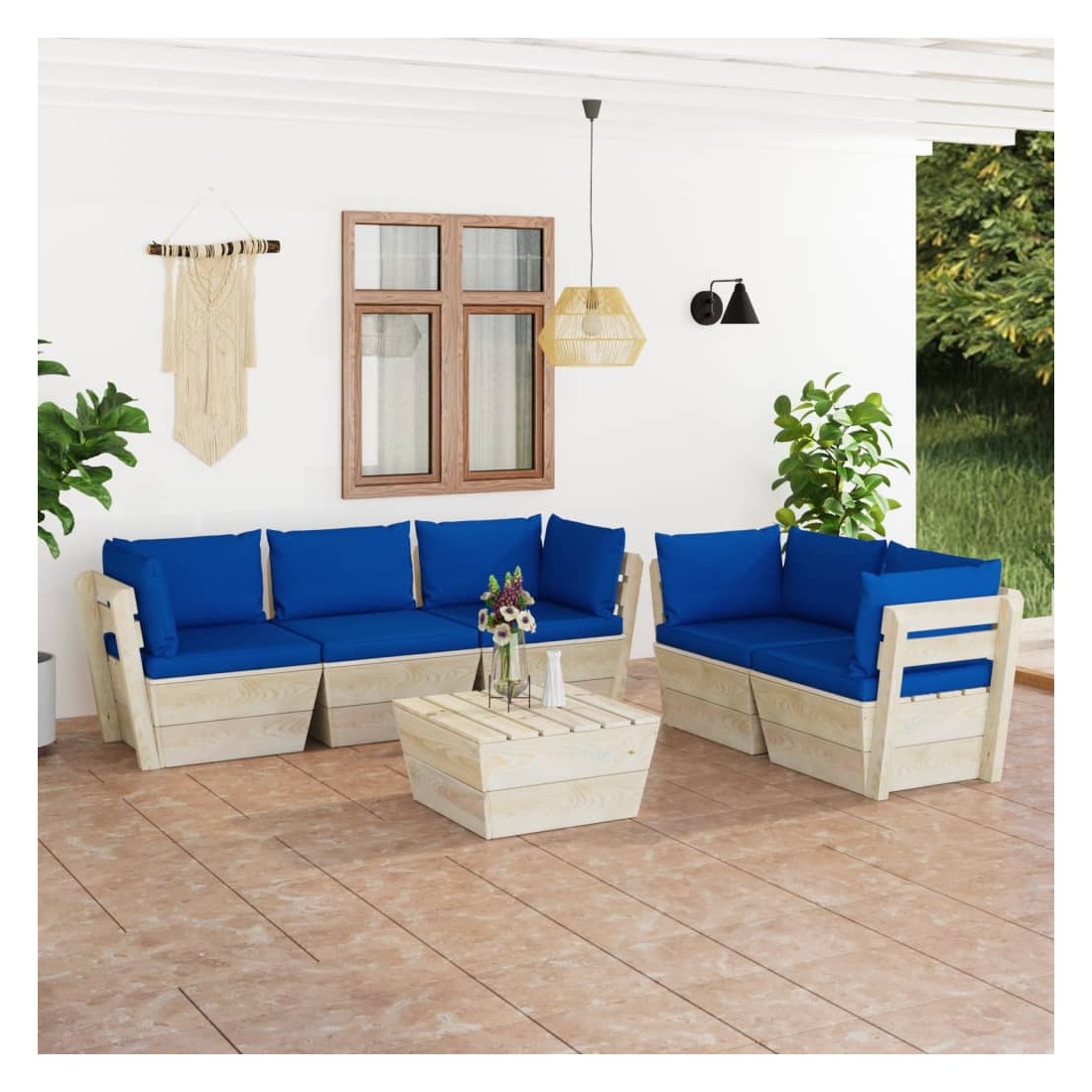vidaXLCet ensemble de salon de jardin palette de 6 pièces à la mode avec coussins est un excellent choix pour vous détendre et profiter du bon temps, faire une sieste ou discuter avec votre famille ou vos amis. L’ensemble de salon en bois, avec un design de palette intemporel, ajoute une touche de charme rustique à votre patio, jardin ou salon. L’ensemble de salon de jardin est en bois d'épicéa imprégné, ce qui le rend durable et stable. Cet ensemble de canapés de patio présente une construction solide et nécessite peu d’entretien. Avec un dessus de table solide, la table est idéale pour garder la nourriture et les boissons à portée de main. Grâce à la tapisserie 100 % polyester et au rembourrage épais, les coussins de palette sont doux et offrent le plus grand confort. De plus, la conception modulaire permet également de placer l’ensemble dans n’importe quel arrangement selon votre goût. Veuillez noter que le bois est un produit naturel et peut présenter des imperfections.