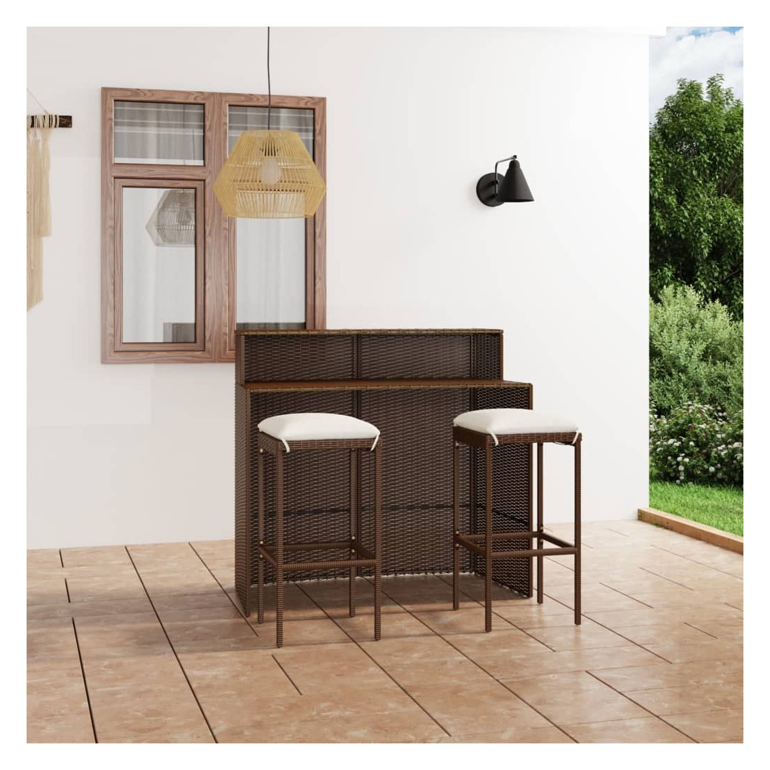 Cet ensemble de bar de jardin a un design élégant et sera le point de mire de votre jardin, patio ou terrasse. Fabriqué en résine tressée résistante aux intempéries et imperméable, cet ensemble de bar est facile à nettoyer, résistant à l'usure et adapté à une utilisation quotidienne. Le cadre en acier enduit de poudre rend la table et les tabourets très robustes et durables. Grace à la construction légère, tous les articles sont faciles à déplacer. Les coussins de siège amovibles et épais sont très confortables. Les housses des coussins avec fermetures éclair peuvent être facilement enlevées et lavées. Remarque : afin de prolonger la durée de vie des meubles d'extérieur, nous vous recommandons de les protéger avec une housse imperméable.