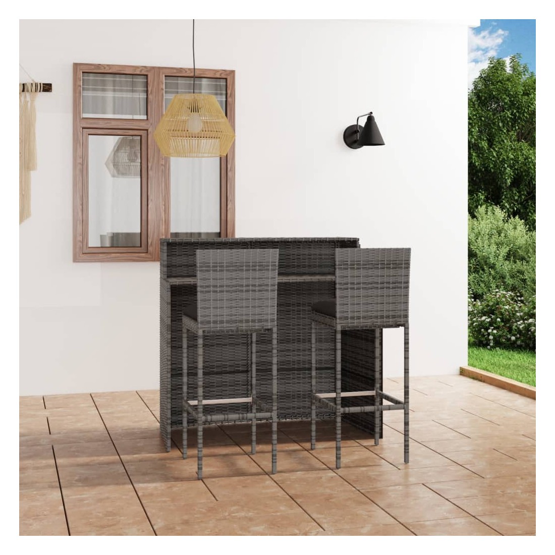 Cet ensemble de bar de jardin a un design élégant et sera le point de mire de votre jardin, patio ou terrasse. Fabriqué en résine tressée résistante aux intempéries et imperméable, cet ensemble de bar est facile à nettoyer, résistant à l'usure et adapté à une utilisation quotidienne. Le cadre en acier enduit de poudre rend la table et les tabourets très robustes et durables. Grace à la construction légère, tous les articles sont faciles à déplacer. Les coussins de siège amovibles et épais sont très confortables. Les housses des coussins avec fermetures éclair peuvent être facilement enlevées et lavées. Remarque : afin de prolonger la durée de vie des meubles d'extérieur, nous vous recommandons de les protéger avec une housse imperméable.