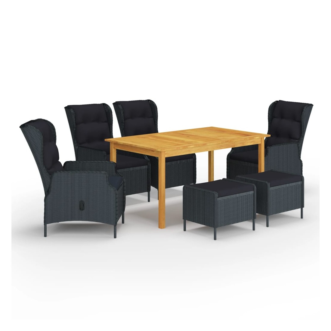 Créez une esthétique convaincante et uniforme dans votre espace extérieur avec cet ensemble de salle à manger de jardin ! La table de salle à manger est fabriquée en bois d’acacia massif avec une finition à l’huile, ce qui la rend stable, durable et facile à entretenir. La chaise et le tabouret d'extérieur, dotés d’un cadre en acier enduit de poudre recouvert de résine tressée ronde, sont robustes et faciles à nettoyer. Les coussins bien rembourrés ajoutent un confort supplémentaire lors de votre temps de détente. La housse de coussin est équipée d’une fermeture éclair, amovible et lavable. Grâce au mécanisme de levage à gaz, le dossier est également réglable pour s’adapter à vos positions. En appuyant sur le bouton sur le côté, le dossier peut s’incliner, pour une position couchée confortable. De plus, la chaise et le tabouret de jardin sont faciles à déplacer grâce à leur construction légère. Remarque importante : Nous vous recommandons de couvrir l'ensemble de salle à manger pendant la pluie, la neige et le gel pour une utilisation durable.