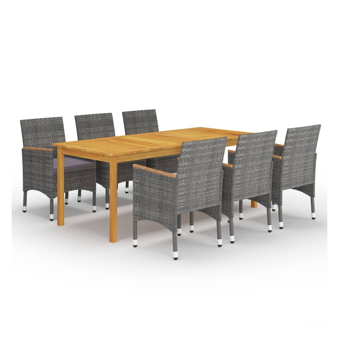 Créez une esthétique convaincante et uniforme dans votre espace extérieur avec cet ensemble de salle à manger de jardin ! La table de salle à manger est en bois d’acacia massif avec une finition à l’huile, ce qui la rend stable, durable et facile à entretenir. Dotées d’un cadre en acier enduit de poudre recouvert de résine tressée résistante aux intempéries, ces chaises sont robustes et faciles à nettoyer. La chaise d’extérieur, conçue avec dossier incurvé et accoudoirs, présente une forme plus ergonomique pour un confort maximal. Les accoudoirs sont joliment décorés en bois d'acacia massif, ce qui apporte une sensation de charme rustique. De plus, les coussins bien rembourrés offrent un confort suprême pendant votre temps assis. Remarque importante : Nous vous recommandons de couvrir l'ensemble de salle à manger pendant la pluie, la neige et le gel pour une utilisation durable.