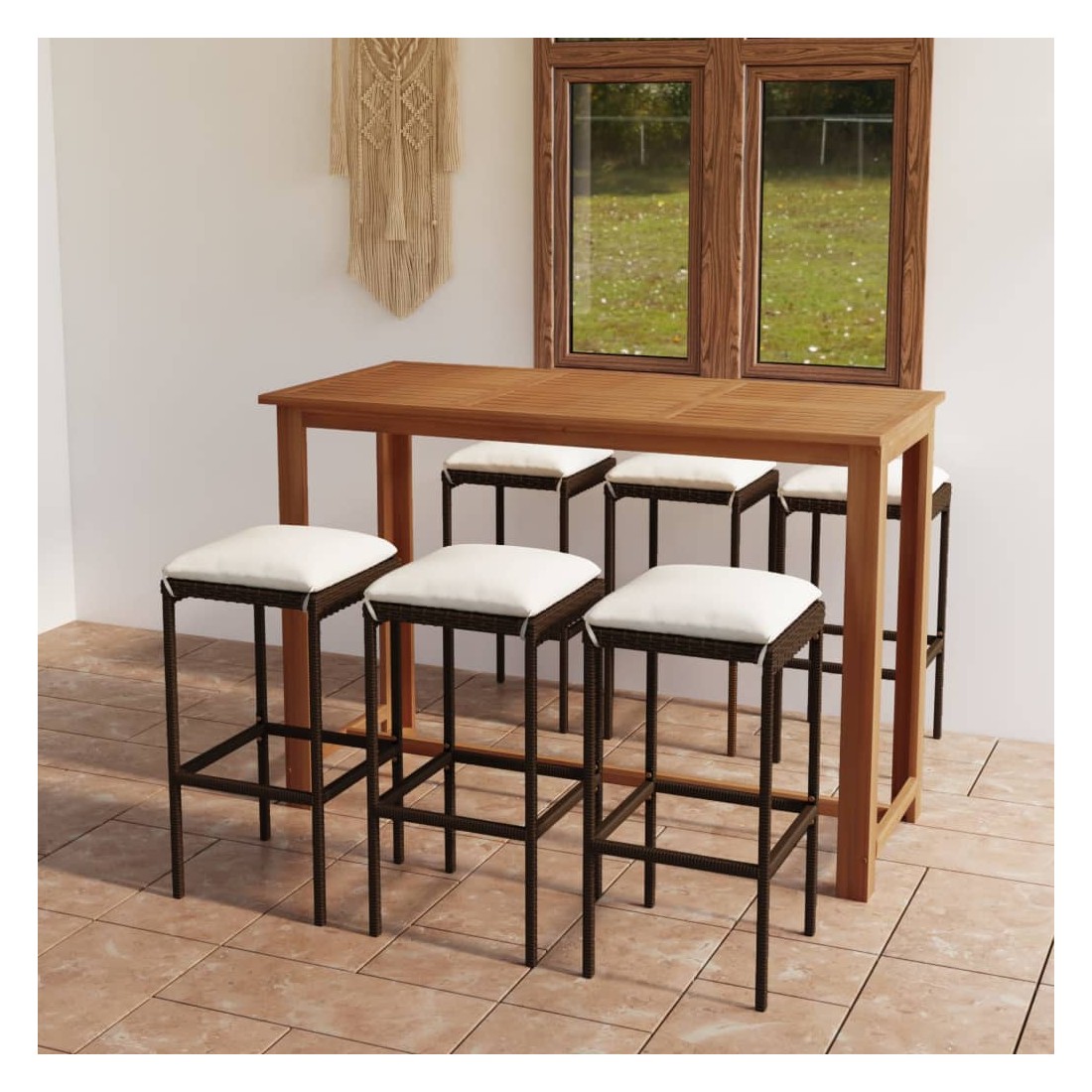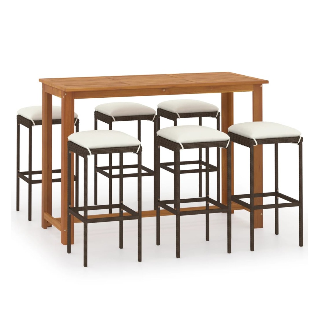 Cet ensemble de bar de jardin a un design élégant et sera le point de mire de votre jardin, patio ou terrasse. La table est fabriquée en bois d’acacia massif avec une finition à l’huile, ce qui la rend stable, durable et facile à entretenir. Doté d’un cadre en acier enduit de poudre recouvert de résine tressée résistante aux intempéries, ce tabouret de bar est robuste et facile à nettoyer. Les coussins de siège épais et amovibles sont très confortables. Les housses de coussin avec fermeture éclair peuvent être facilement enlevées et lavées. Remarque : nous vous recommandons de couvrir l'ensemble pendant la pluie, la neige et le gel.