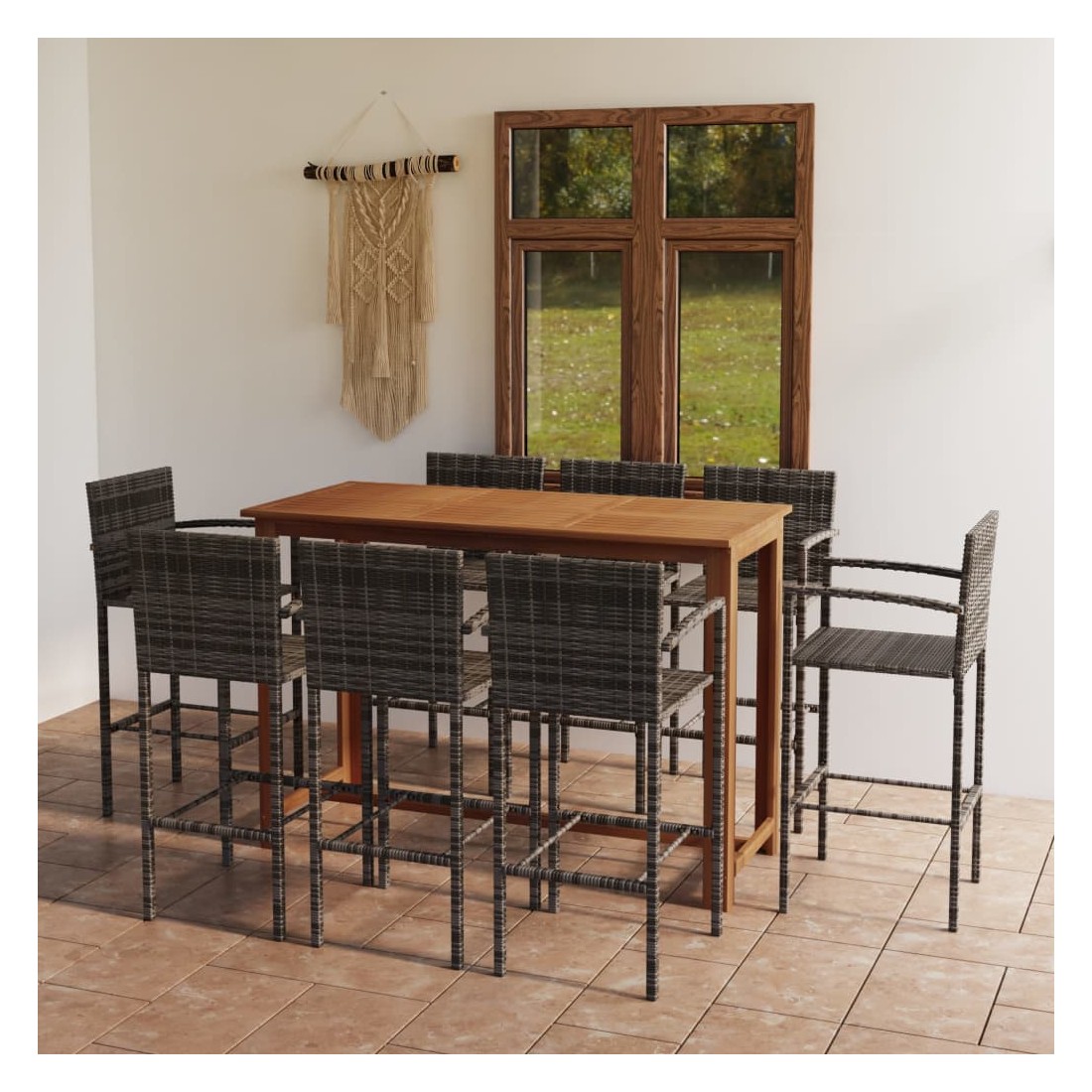 Cet ensemble de bar de jardin a un design élégant et sera le point de mire de votre jardin, patio ou terrasse. La table est en bois d’acacia massif avec une finition à l’huile, ce qui la rend stable, durable et facile à entretenir. Doté d’un cadre en acier enduit de poudre recouvert de résine tressée résistante aux intempéries, le tabouret de bar est robuste et facile à nettoyer. Remarque : nous vous recommandons de couvrir l'ensemble pendant la pluie, la neige et le gel.
