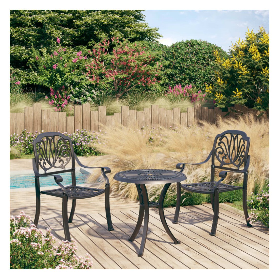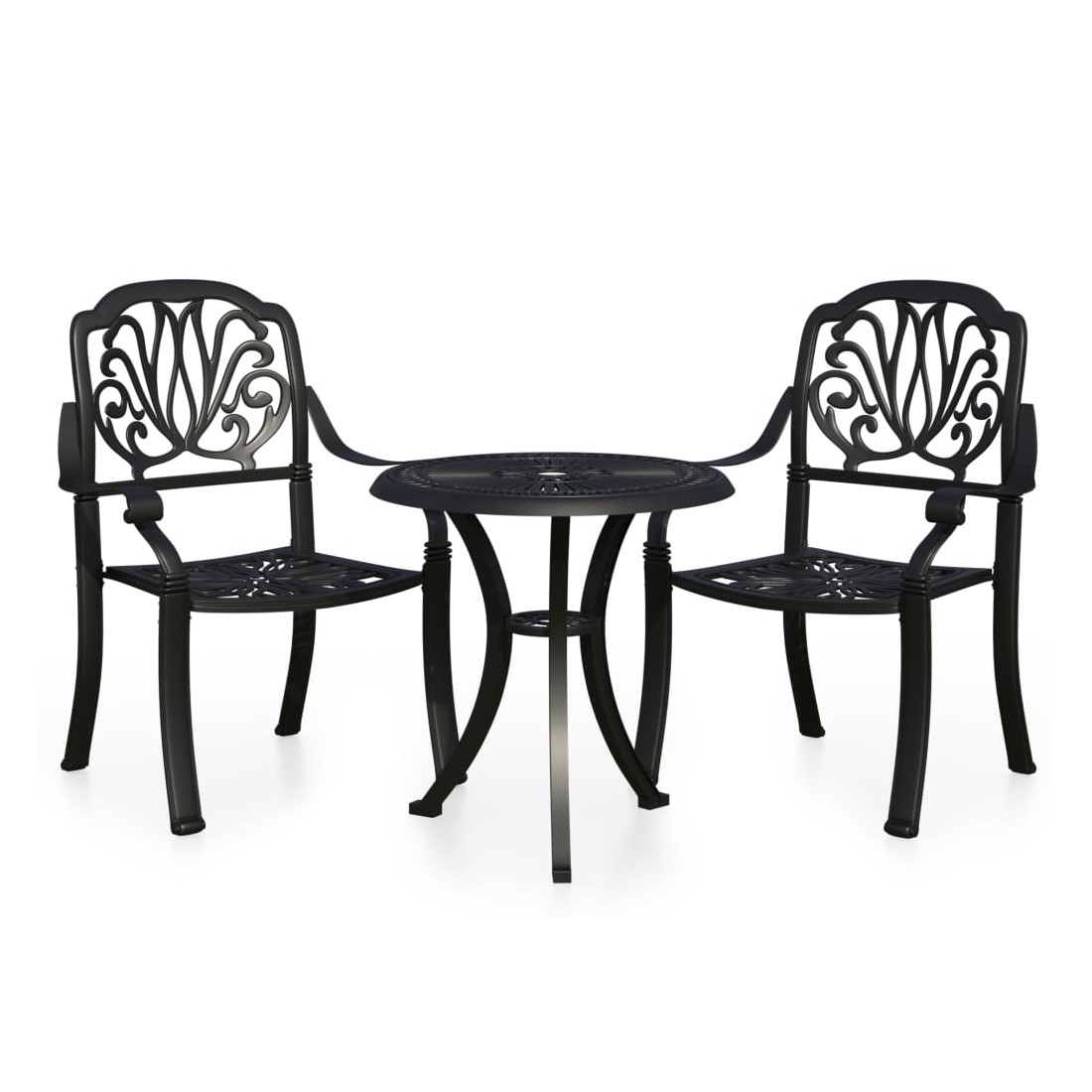 Cet ensemble de bistro, fabriqué en aluminium coulé, offre une expérience d'assise confortable pour vous et vos invités. Matériau durable : les chaises et la table d’extérieur, en aluminium coulé, sont robustes et durables. Le matériau résistant à la rouille et aux intempéries rend le mobilier idéal pour une utilisation à l'extérieur.Design élégant : les magnifiques motifs font de l'ensemble de bistro un supplément élégant à votre espace extérieur.Trou de parasol : la table basse dispose d’un trou de parasol qui peut parfaitement accueillir votre parasol pour vous protéger du soleil ou de la pluie. Bon à savoir :Pour que vos meubles d'extérieur restent beaux, nous vous recommandons de les protéger avec une housse imperméable.