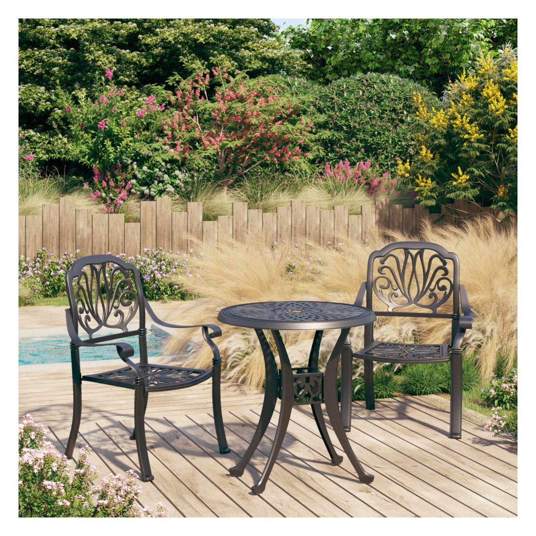 Cet ensemble de bistro, fabriqué en aluminium coulé, offre une expérience d'assise confortable pour vous et vos invités. Les chaises et la table d’extérieur, en aluminium coulé, sont robustes et durables. Le matériau résistant à la rouille et aux intempéries rend le mobilier idéal pour une utilisation à l'extérieur. Les magnifiques motifs font de l'ensemble de bistro un supplément élégant à votre espace extérieur. De plus, la table basse dispose d’un trou de parasol qui peut parfaitement accueillir votre parasol pour vous protéger du soleil ou de la pluie. Remarque : afin de prolonger la durée de vie des meubles d'extérieur, nous vous recommandons de les protéger avec une housse imperméable.