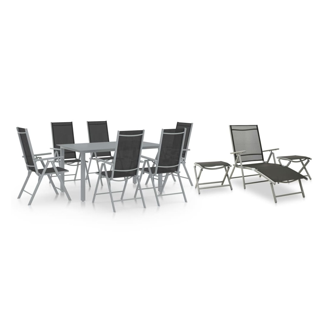 Cet ensemble de salle à manger de jardin à la fois pratique et élégant est parfait pour vous détendre ou dîner dans votre jardin ou sur votre terrasse. Le cadre en aluminium enduit de poudre rend l'ensemble de meubles très robuste et durable. Les chaises de jardin sont dotées de sièges et de dossiers en textilène doux au toucher, réglables sur 7 positions, afin que vous puissiez toujours trouver la position assise la plus confortable. Les repose-pieds ajoutent plus de confort. Vous pouvez également les utiliser comme tables basses pour placer des boissons et des aliments à portée de main. La table de salle à manger dispose d’un dessus de table en verre, qui est facile à nettoyer avec un chiffon humide. Remarque : afin de prolonger la durée de vie des meubles d'extérieur, nous vous reco