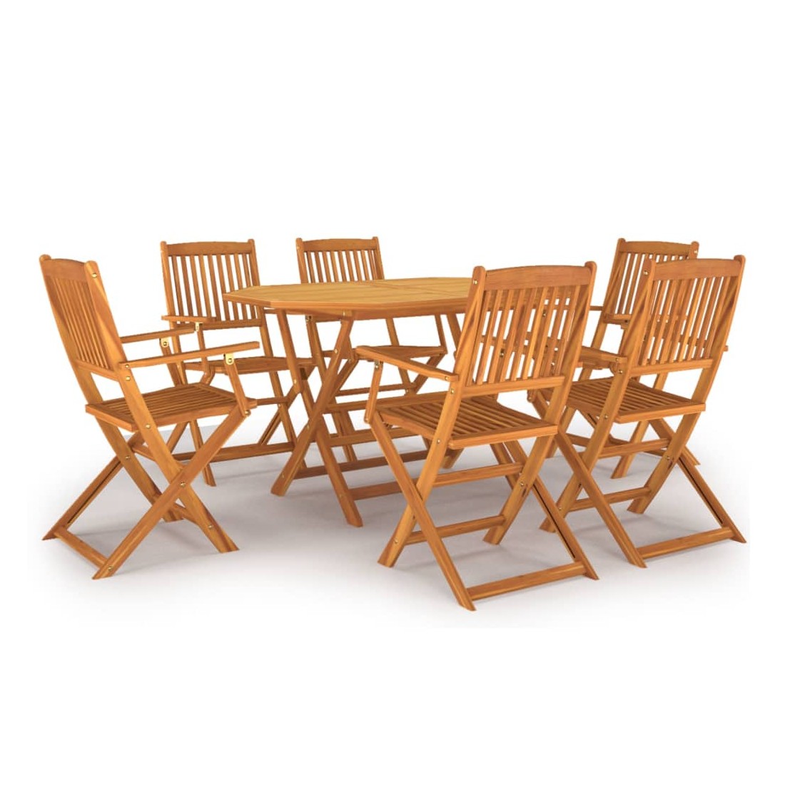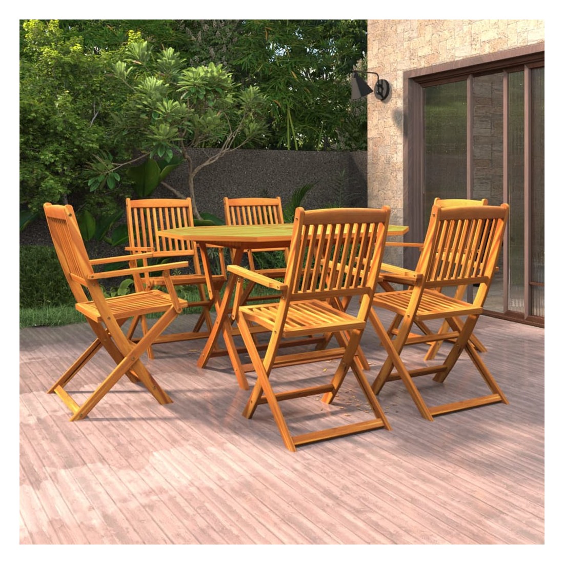 Créez une esthétique convaincante et uniforme dans votre espace extérieur avec cet ensemble de salle à manger de jardin en bois ! Cet ensemble de salle à manger d'extérieur est fabriqué en bois d'acacia massif, un bois dur tropical, qui est résistant aux intempéries et durable pour des années d'utilisation. La surface finie à l'huile est facile à nettoyer avec un chiffon humide. De plus, les chaises et la table de patio peuvent être pliées dans un format compact pour économiser de l'espace lorsqu'elles ne sont pas utilisées. Remarque : afin de prolonger la durée de vie des meubles d'extérieur, nous vous recommandons de les protéger avec une housse imperméable.