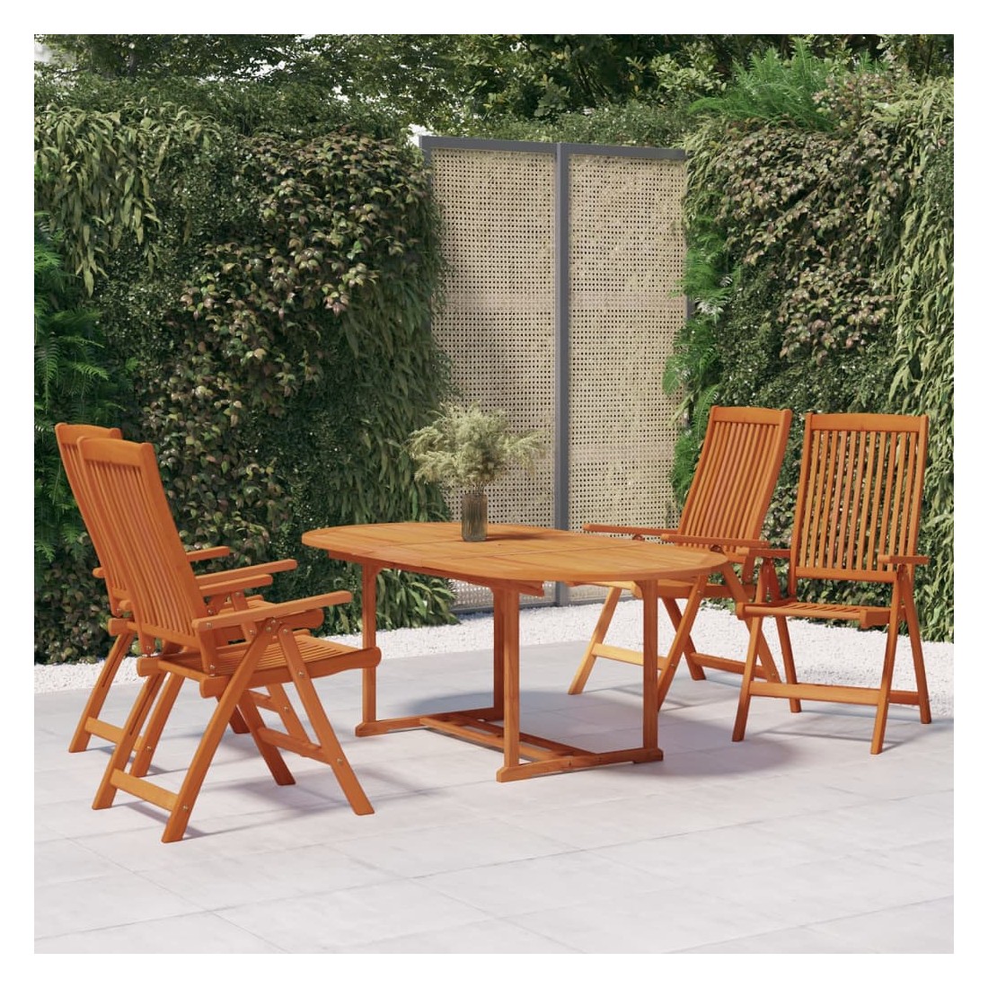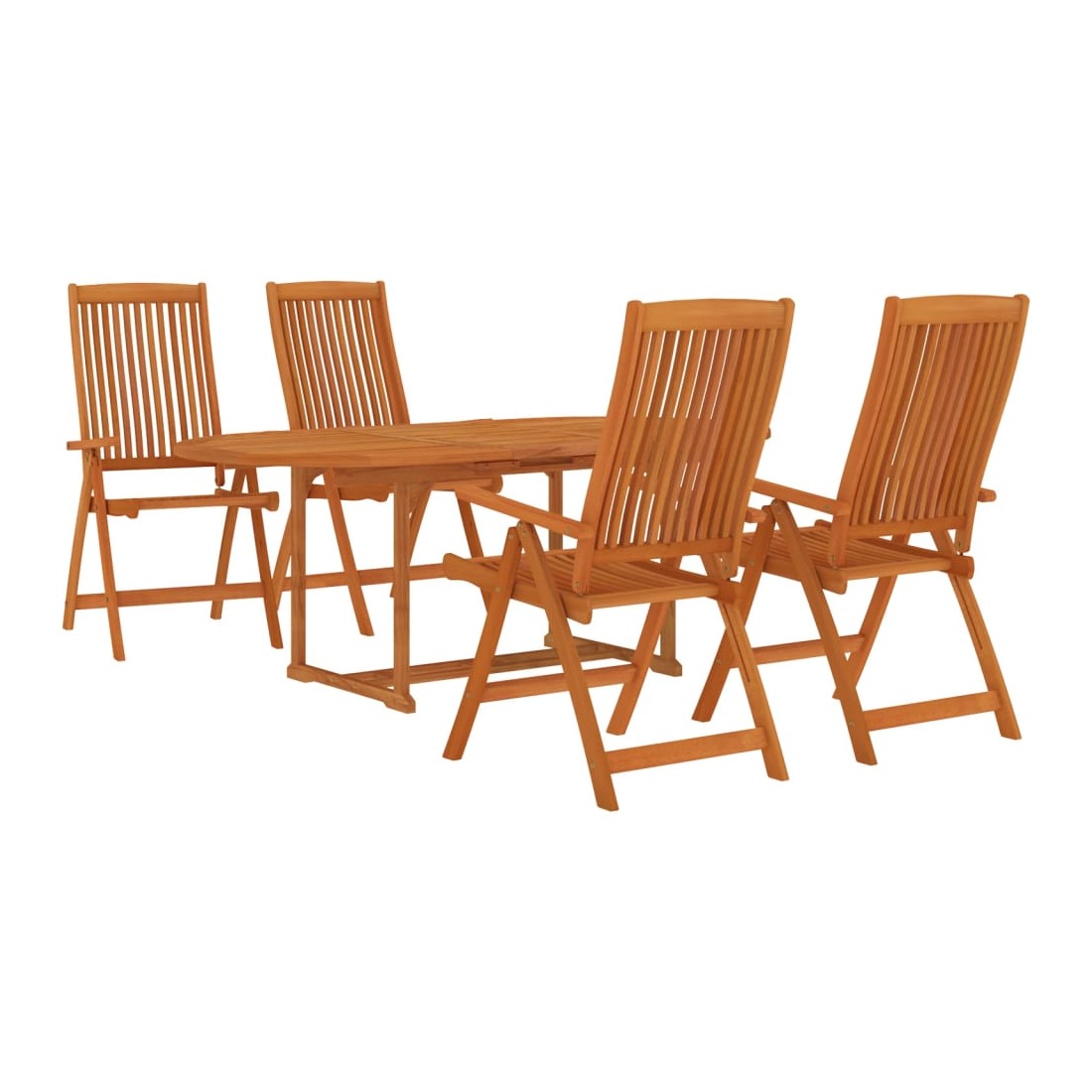 Cet ensemble de salle à manger de jardin en bois a un design rustique et intemporel et sera un excellent choix pour manger dans le jardin ou sur la terrasse. Bois d'eucalyptus massif : le bois d'eucalyptus massif est un magnifique matériau naturel. Le bois d'eucalyptus est extrêmement dense et hydrofuge. Le matériau est bien connu pour sa riche couleur brun rougeâtre.Table à manger extensible : grâce à sa conception spéciale, cette table en bois peut être allongée lorsque de l'espace supplémentaire est nécessaire.Trou de parasol pratique : cette table d'extérieur dispose d'un trou de parasol pour fournir un endroit approprié pour votre parasol afin de vous aider à éviter la lumière du soleil et la pluie.Chaises inclinables en bois : les fauteuils de jardin sont dotés de sièges et de dossiers incurvés. De plus, le dossier peut être réglé en 5 positions, vous permettant ainsi de toujours trouver une position confortable.Design pliable : ces chaises de salle à manger peuvent être pliées pour économiser de l'espace lorsqu'elles ne sont pas utilisées. Vous pouvez facilement les transporter partout avec vous lors de vos voyages en plein air. Remarque :Afin de prolonger la durée de vie de votre mobilier d'extérieur, nous vous recommandons de le protéger avec une housse imperméable.